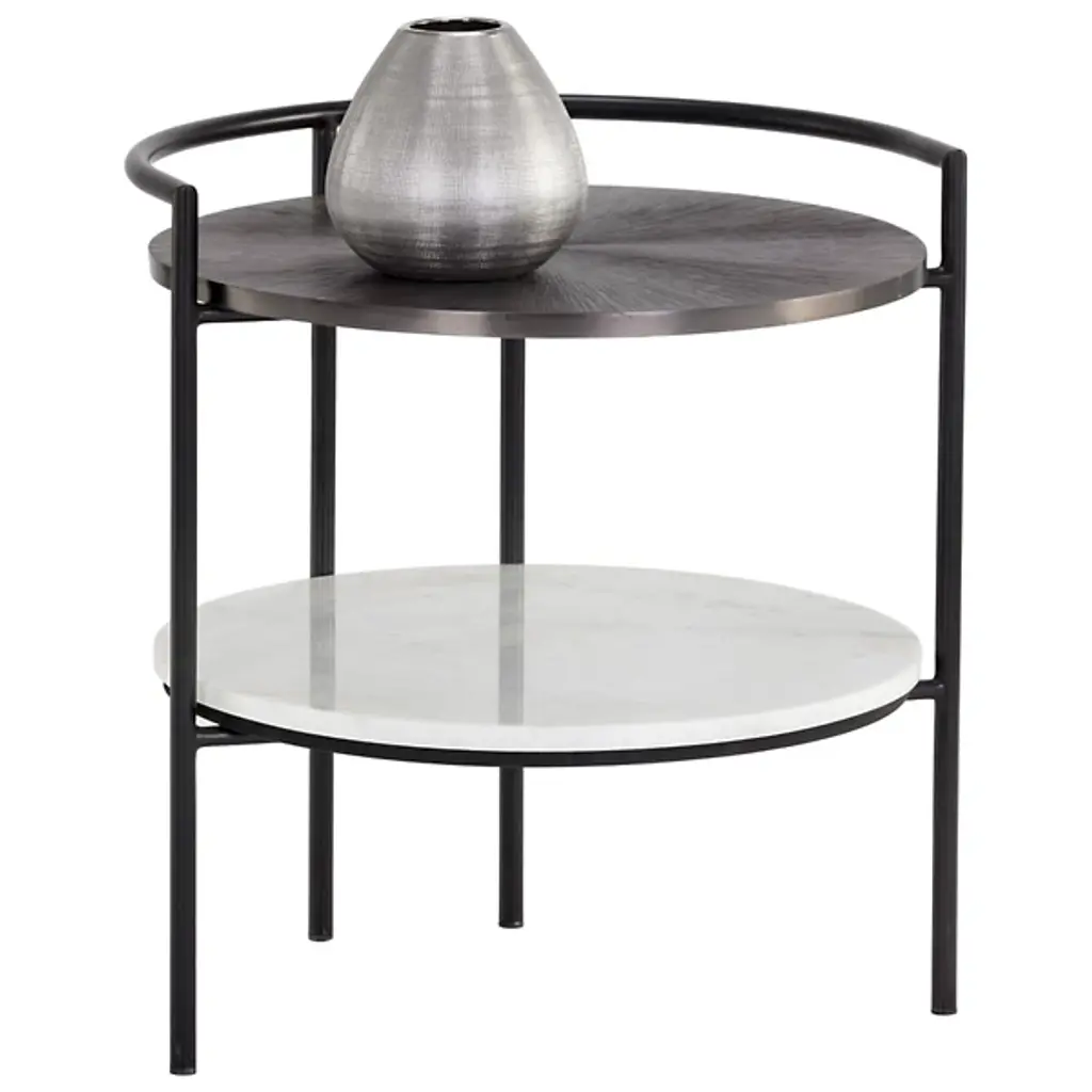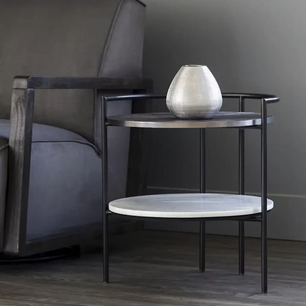 The Brighton Nightstand from Sunpan brings a bright and airy touch to any space, combining modern design with artisanal craftsmanship. The hand-etched and hand-hammered top, crafted from iron with a tarnished bronzed gunmetal finish, exudes character and sophistication. A white marble shelf adds a touch of elegance, while the slender black steel frame completes the sleek look. Made in India by skilled local artisans, this nightstand showcases the beauty of natural materials, with unique imperfections like fissures, markings, and color variations, making each piece unique.