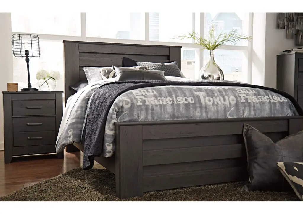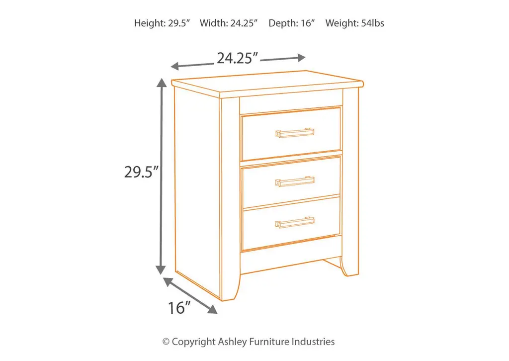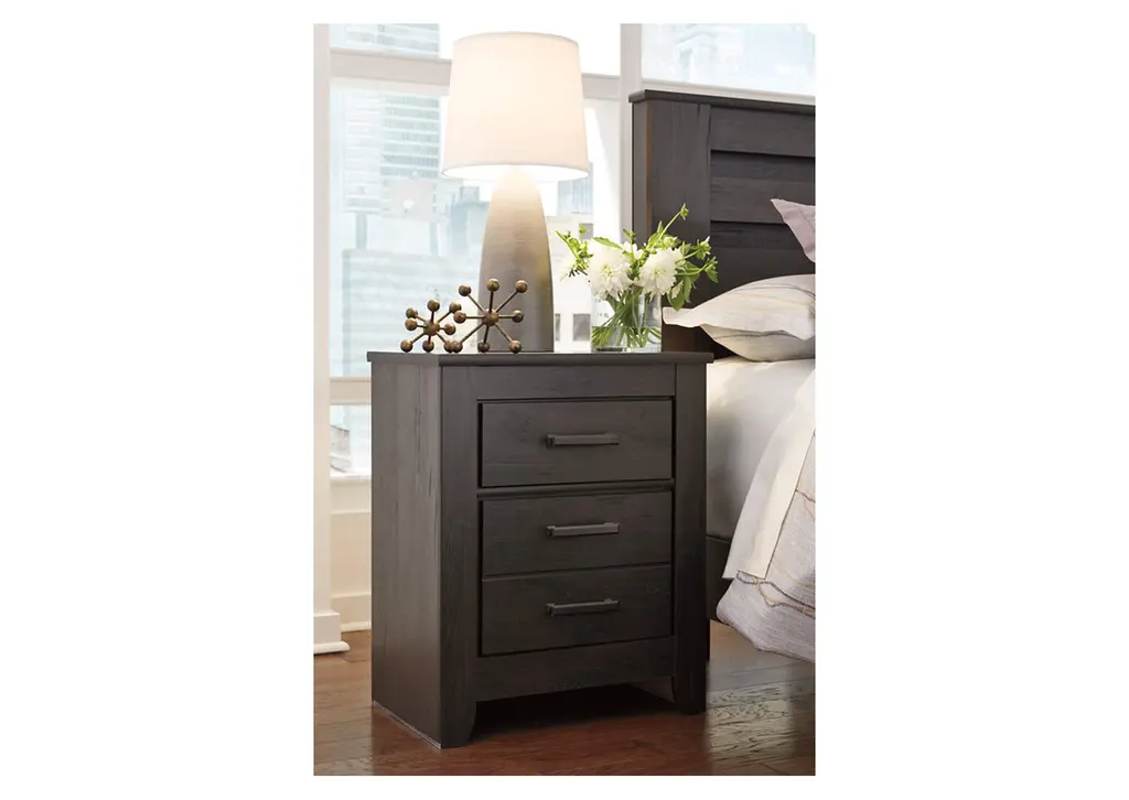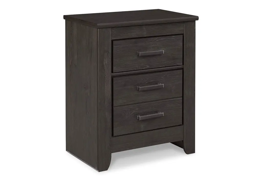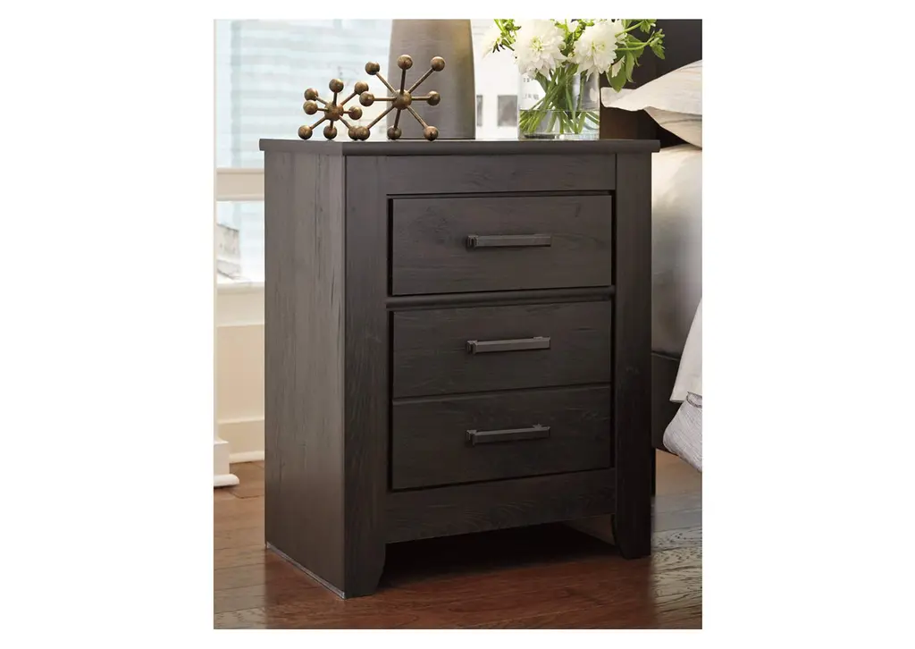 Priced to entice and styled to impress, the Brinxton nightstand is urban sophistication with a decidedly relaxed air. It’s got the crisp, clean lines of a contemporary piece, but with an earthy element. Replicated oak grain effect gives the chic charcoal finish warmth and character. Linear pulls are a sleek touch. Weight 62.000 lbs. (27.9kgs.)