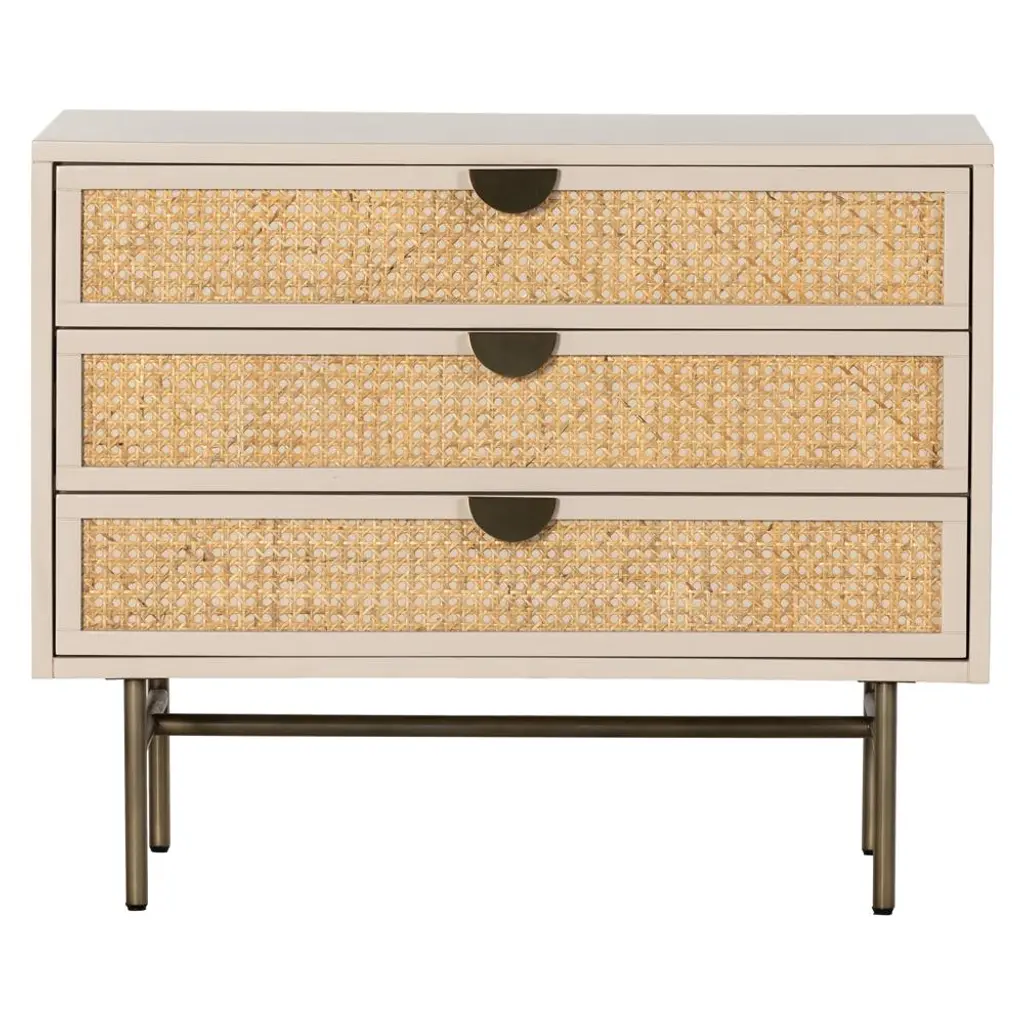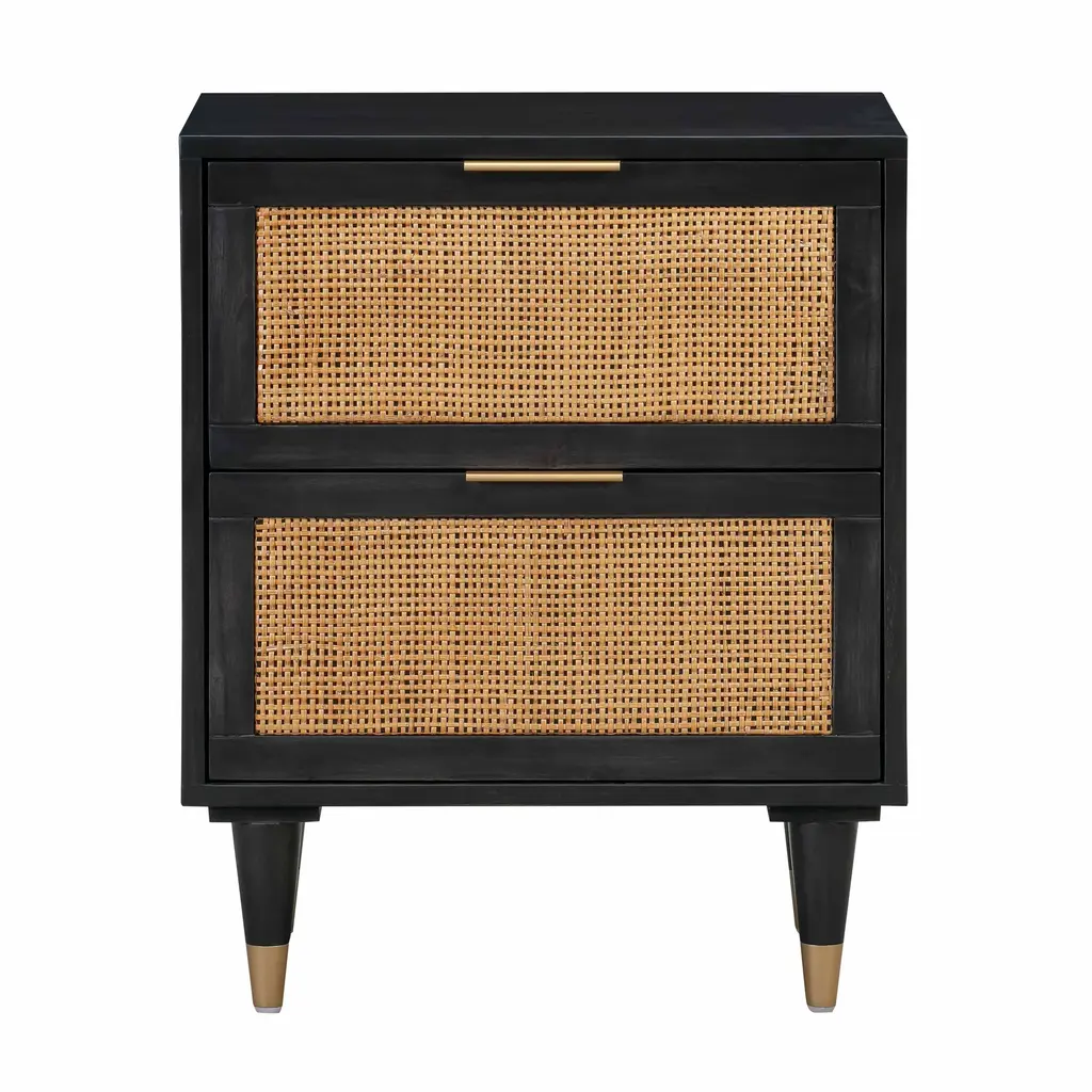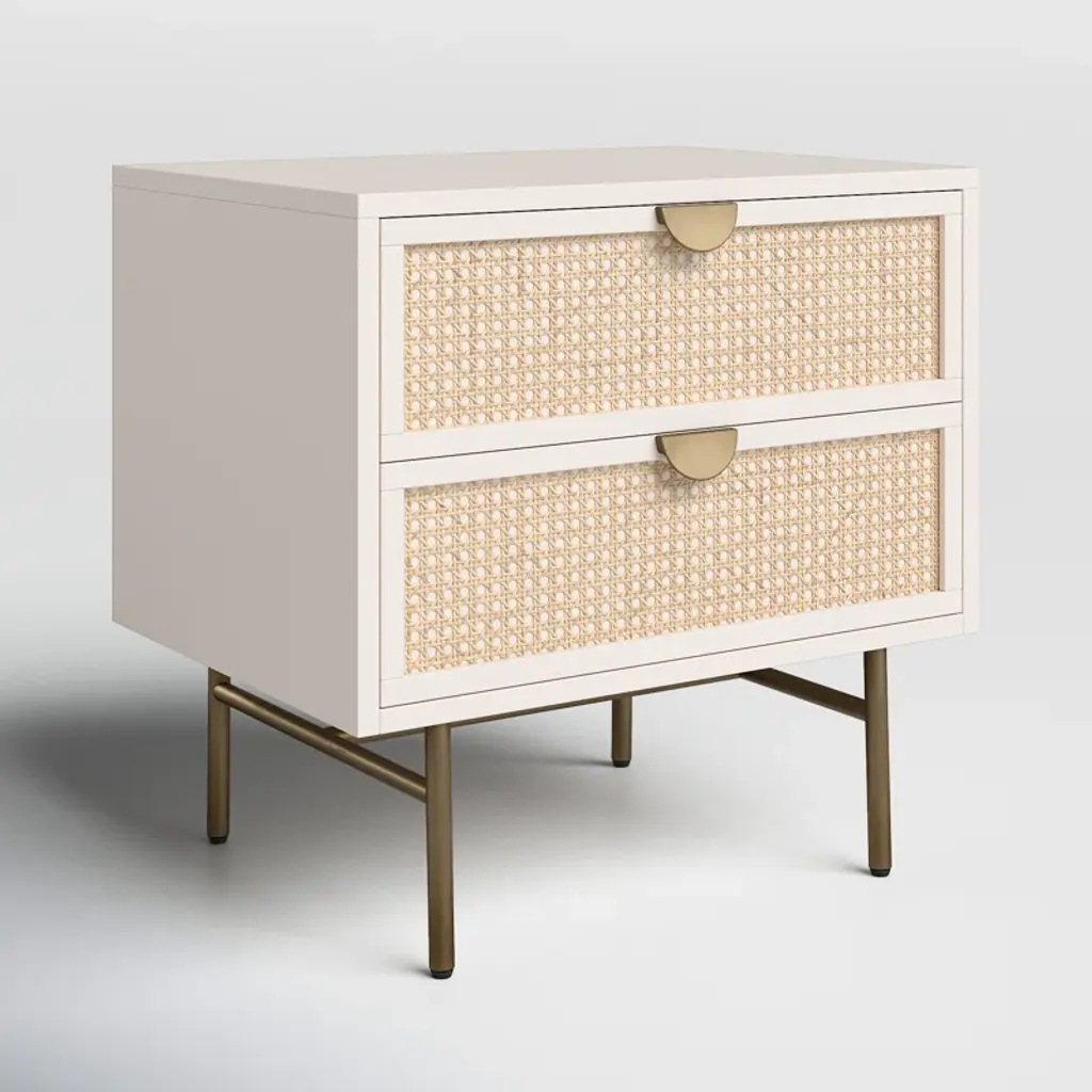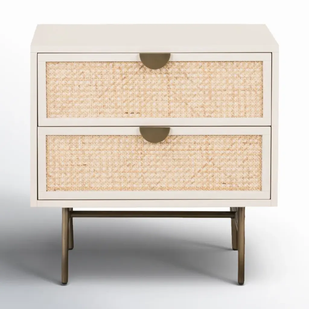 Bring a light look to bedroom styling. A two-drawer nightstand features woven cane panels and half-moon hardware finished in an aged brass.