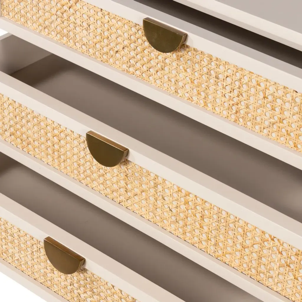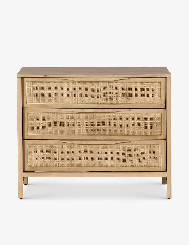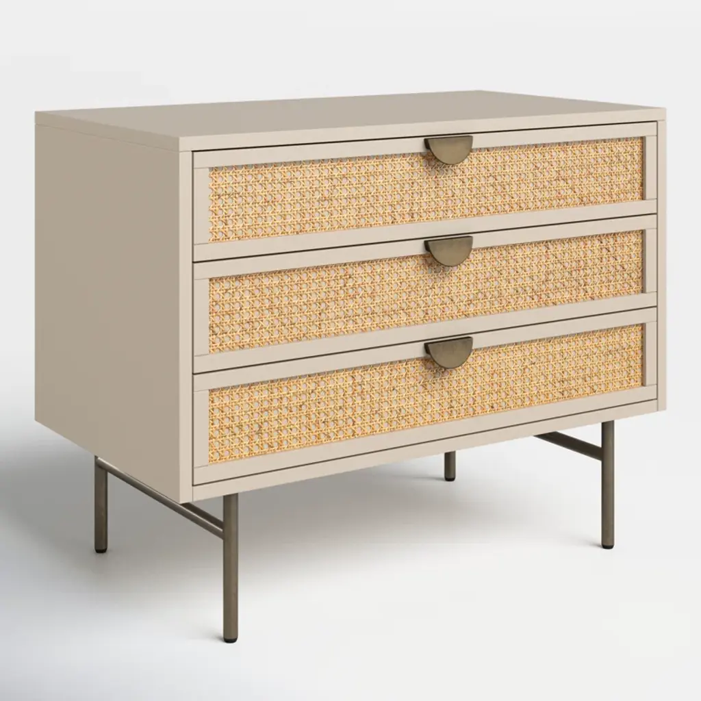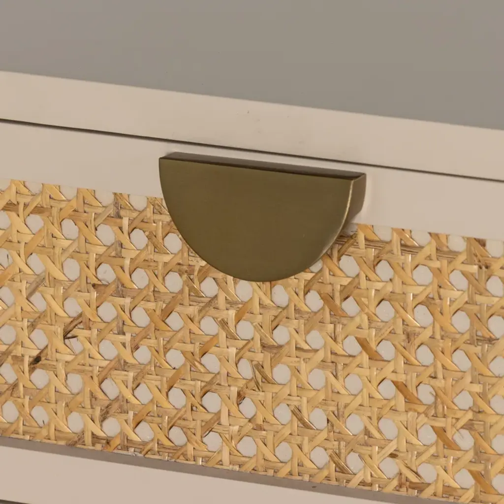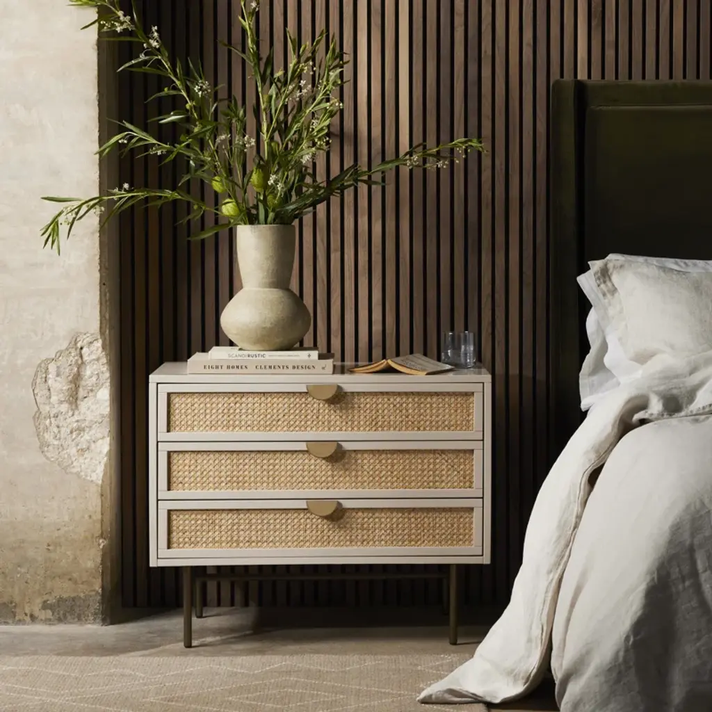 Bring a light, textural look to bedside storage. A lacquered three-drawer nightstand features woven cane panels and half-moon hardware finished in aged brass.