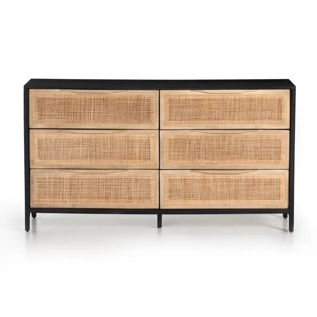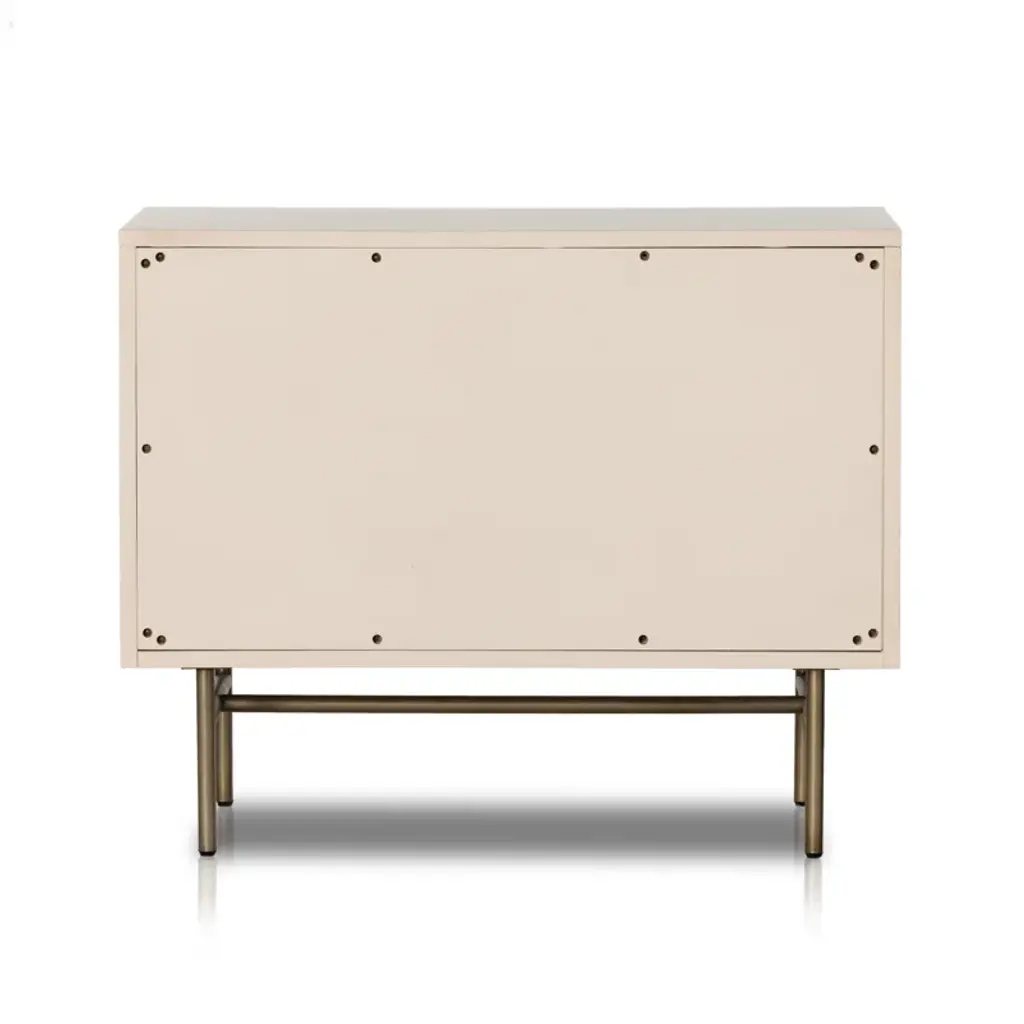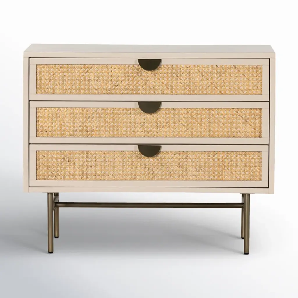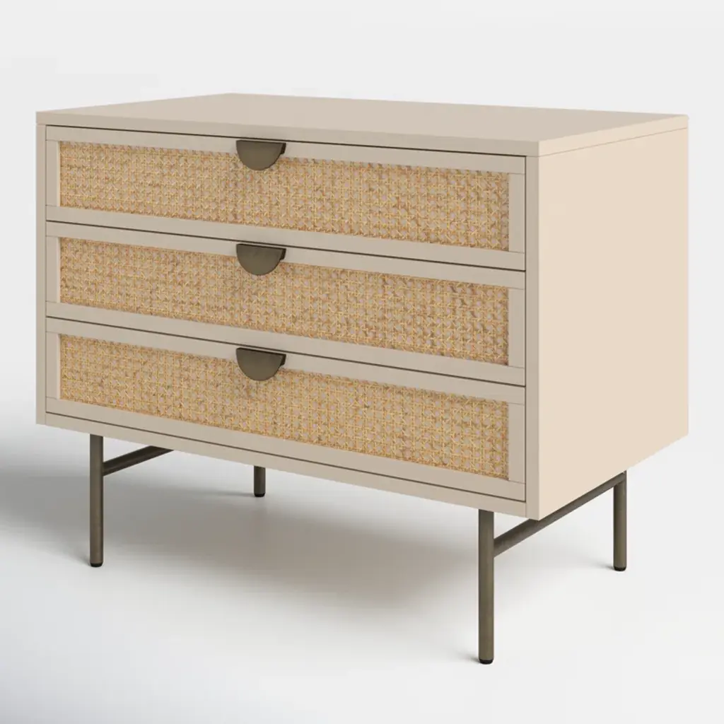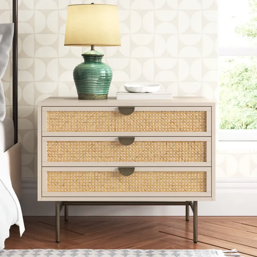 Bring a light, textural look to bedside storage. A lacquered three-drawer nightstand features woven cane panels and half-moon hardware finished in aged brass.