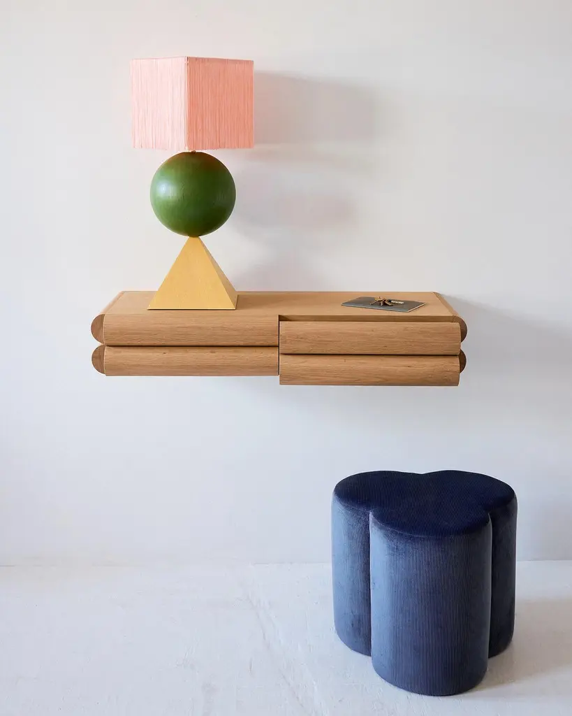 This small shelf with integrated drawer works perfectly as an entryway console or nightstand. The recessed handle pull keeps the design looking clean and sophisticated while camouflaging its function under a distinct and bold aesthetic.
