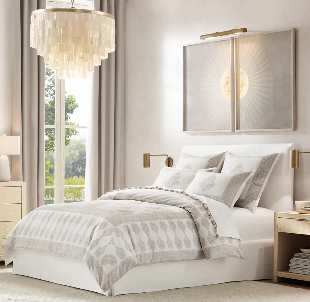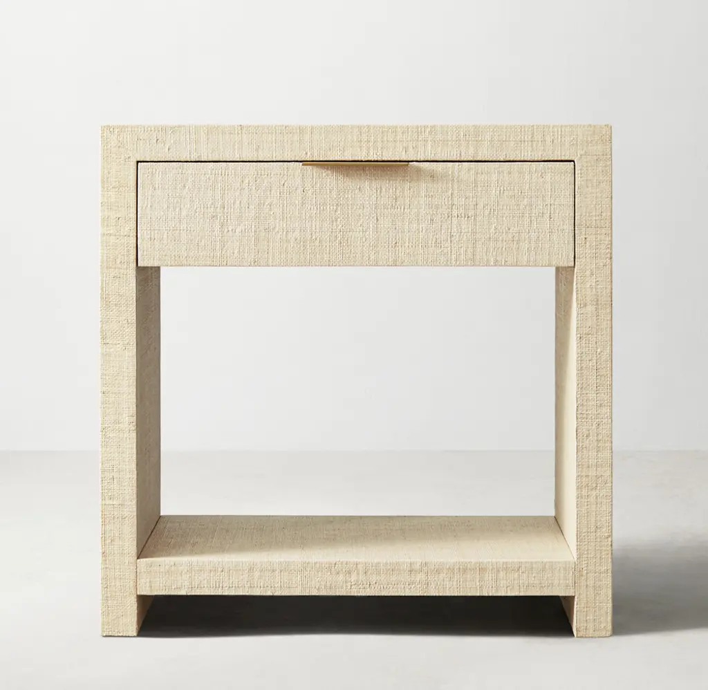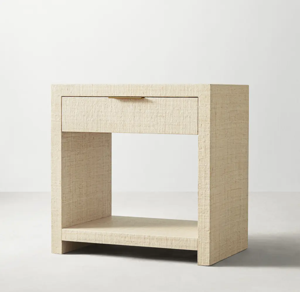 The natural warmth and texture of woven raffia complement our collection's spare forms, emphasizing the inherent beauty of simple, streamlined shapes. Slim metal drawer pulls serve as refined accents.