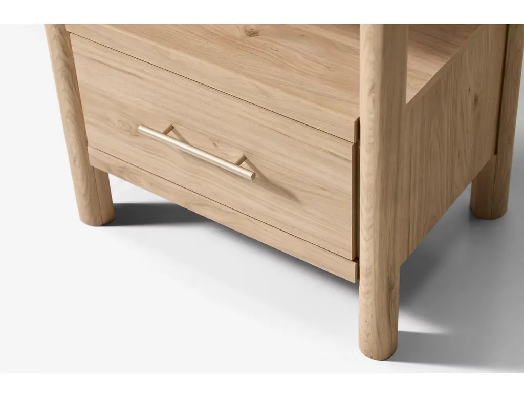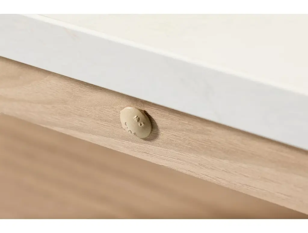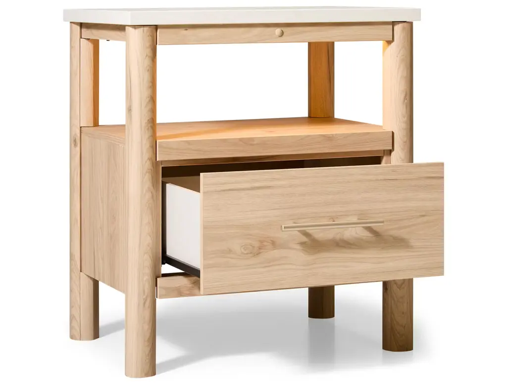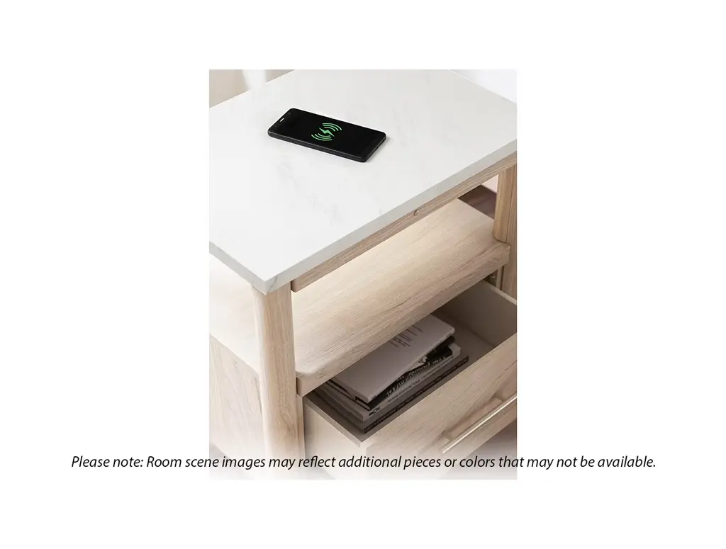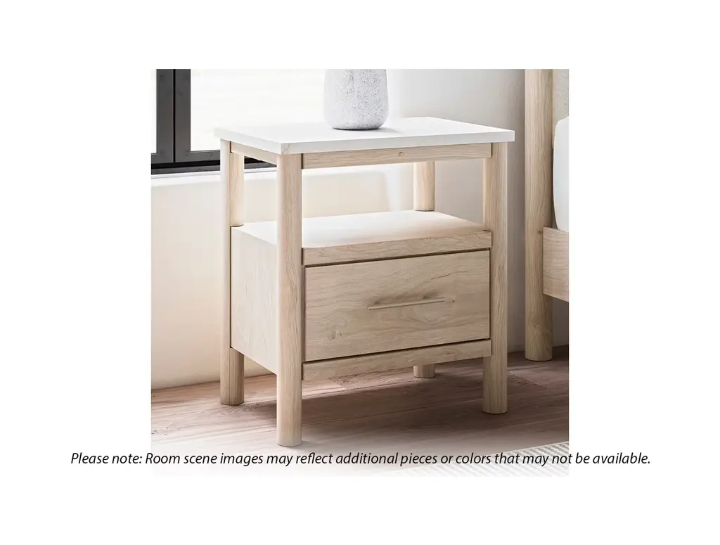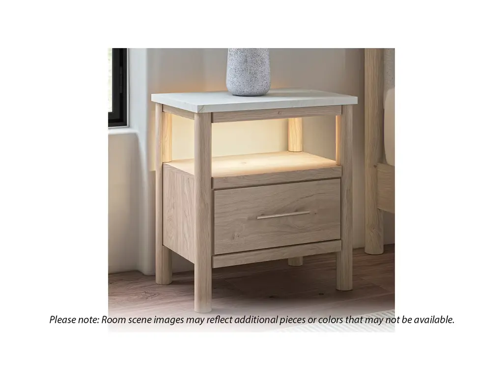 Your free-spirited vibe meets modern design with the Ashley Cadmori 1 Drawer Nightstand. This boho-style nightstand features one roomy storage drawer accented with a long pull in a champagne finish. The open shelf keeps bedside necessities within reach, which is made even better with the ambient light under the faux marble top. Cylindrical legs complete its luxe look.