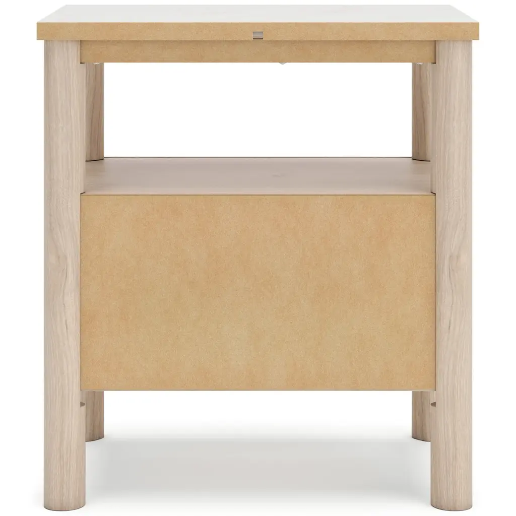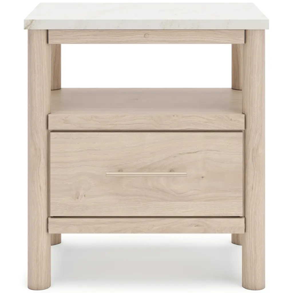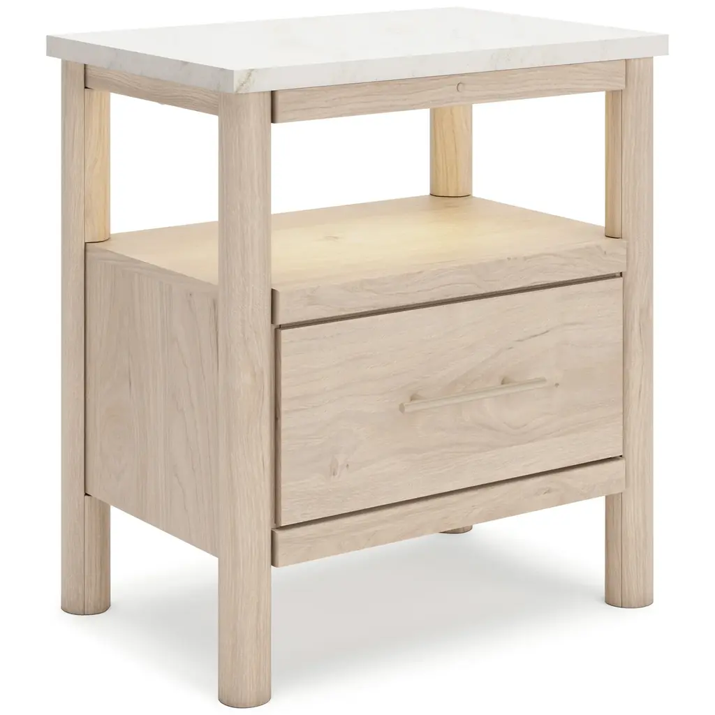 A casual contemporary design with a smooth, light finish and white marble top. Drawer features smooth side roller glides and champagne colored finished handles. Ambient lighting under the top with USB and Wireless Charging options! - Product Details provided by Manufacturer, Slumberland not responsible for errors in information.