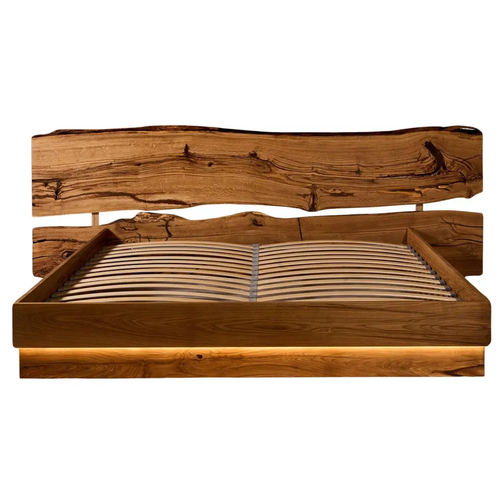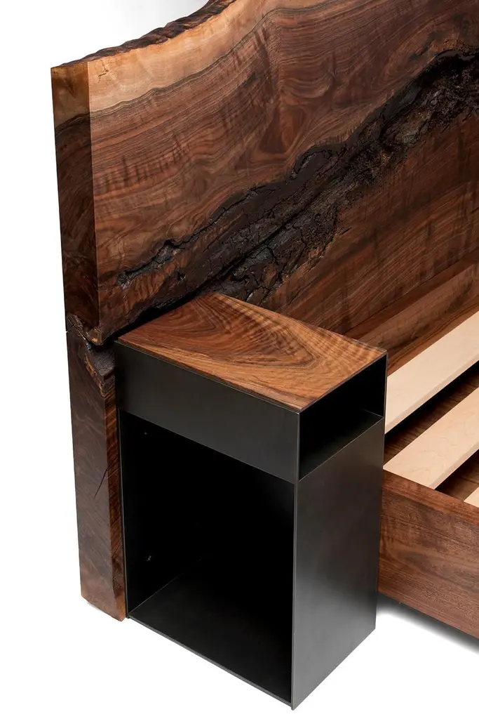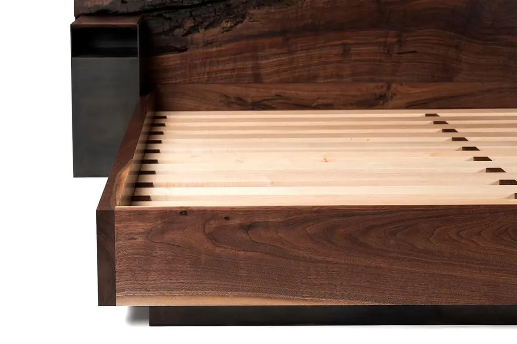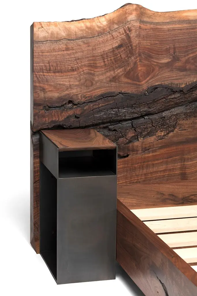 The Foundation Bed by Taylor Donsker is designed in such a way that it can be placed against a wall or freestanding in the center of a room to be admired from all angles. Featuring a gorgeous, hand selected horizontal slab of California Walnut, a recessed blackened steel base, and attached California Walnut and blackened steel nightstands, the Foundation Bed is designed and built to age gracefully. Solid Maple slats support the mattress while allowing it to breath. The piece breaks down for ease of shipping and assembles quickly with minimal fasteners. All wooden elements in the table are finished with Taylor's signature, velvety smooth hand rubbed oil and wax finish and handcrafted in Northern California.Available in custom sizes and finishes.