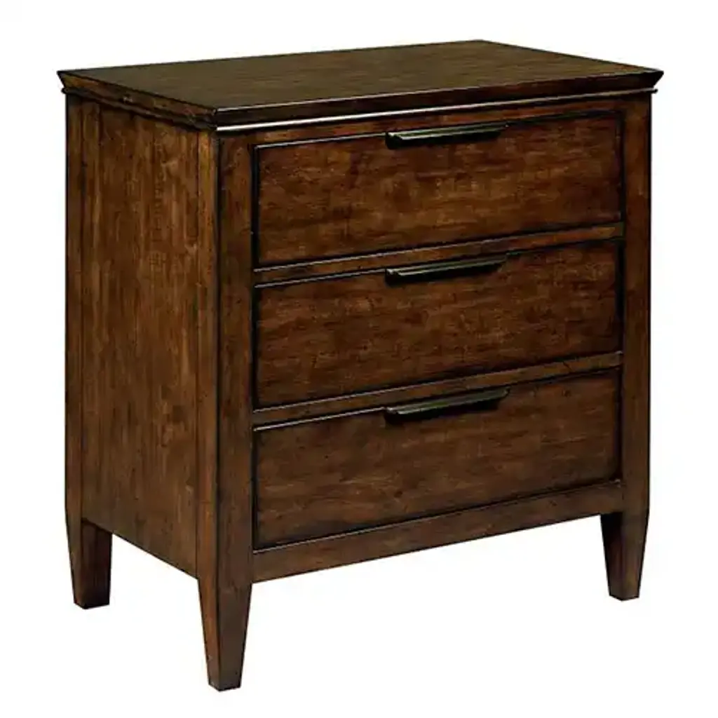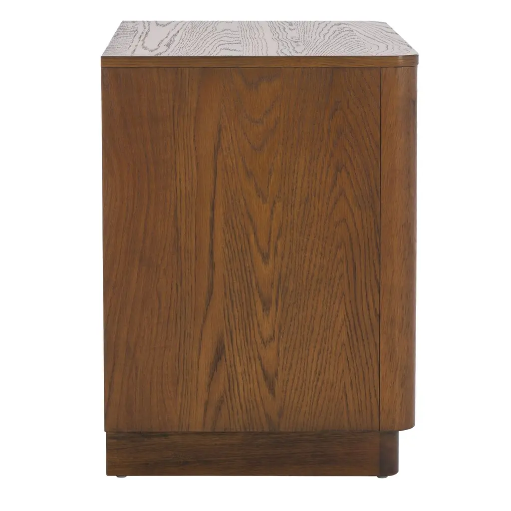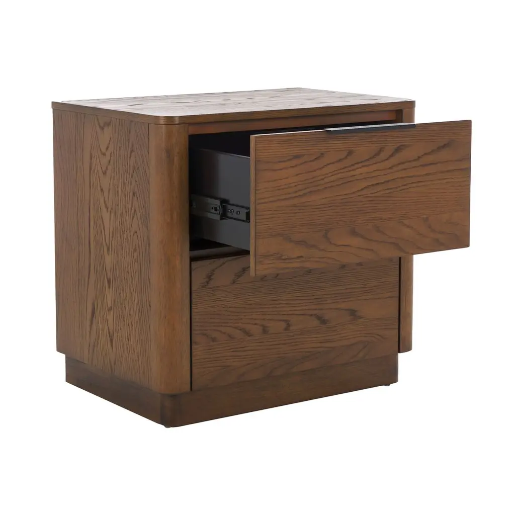 Give a refined and minimalistic update to your bedside with our nightstand. Molded corners and clean, gentle lines define the grace of our streamlined nightstand. It stands out with rich grains to add a dose of warmth and character to your bedroom. Finished off with sleek metallic pulls, our nightstand vouches for a warm and refined look to complement a variety of styles. It features two roomy drawers to keep all your nighttime essentials organized and within easy reach.