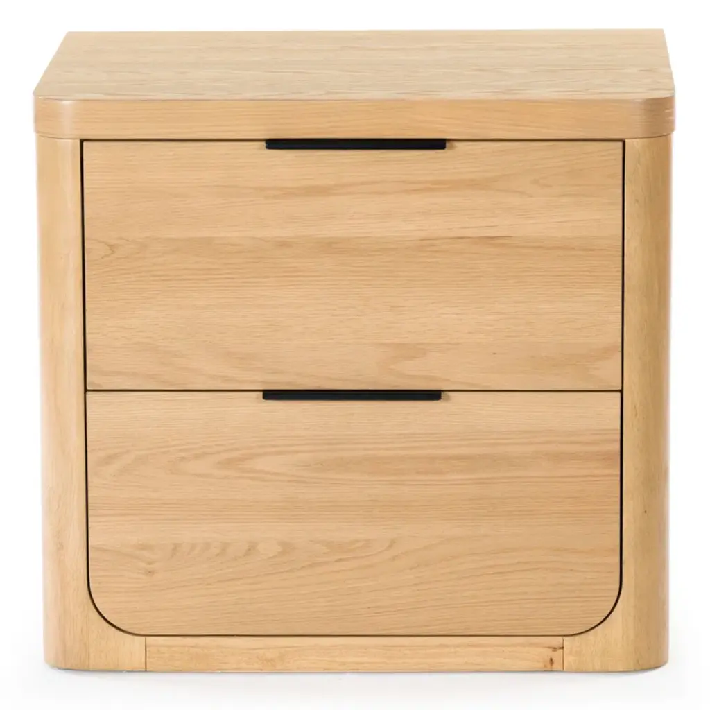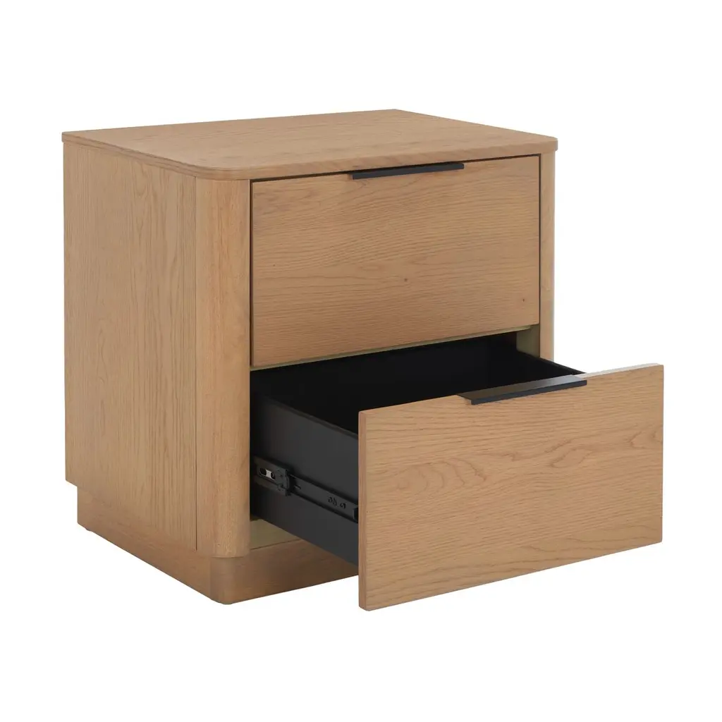 Give a refined and minimalistic update to your bedside with our nightstand. Molded corners and clean, gentle lines define the grace of our streamlined nightstand. It stands out with rich grains to add a dose of warmth and character to your bedroom. Finished off with sleek metallic pulls, our nightstand vouches for a warm and refined look to complement a variety of styles. It features two roomy drawers to keep all your nighttime essentials organized and within easy reach.