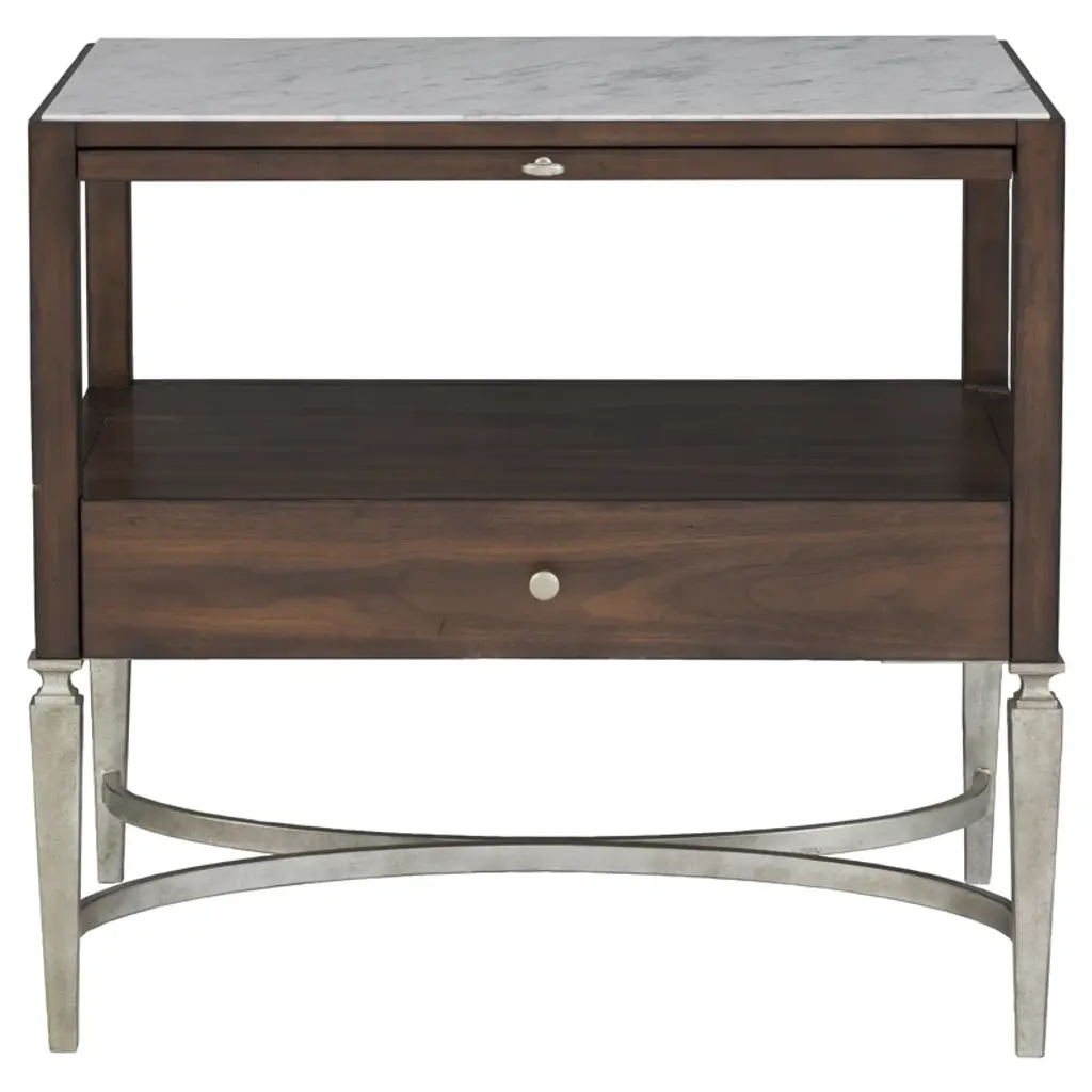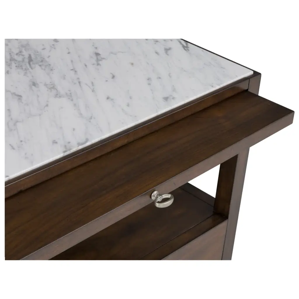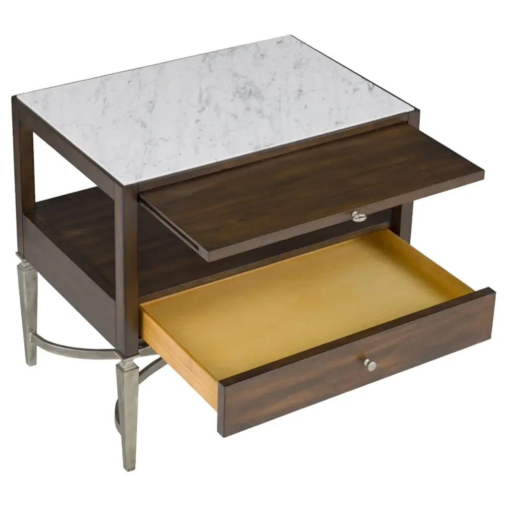 Features one drawer and one pull out tray with inset White Carrera stone top. Metal base and hardware in Black Steel and Tahitian Pearl Finish. All drawers feature full extension and self-closing hardware. Also available in any Fairfield Finish M096-SB