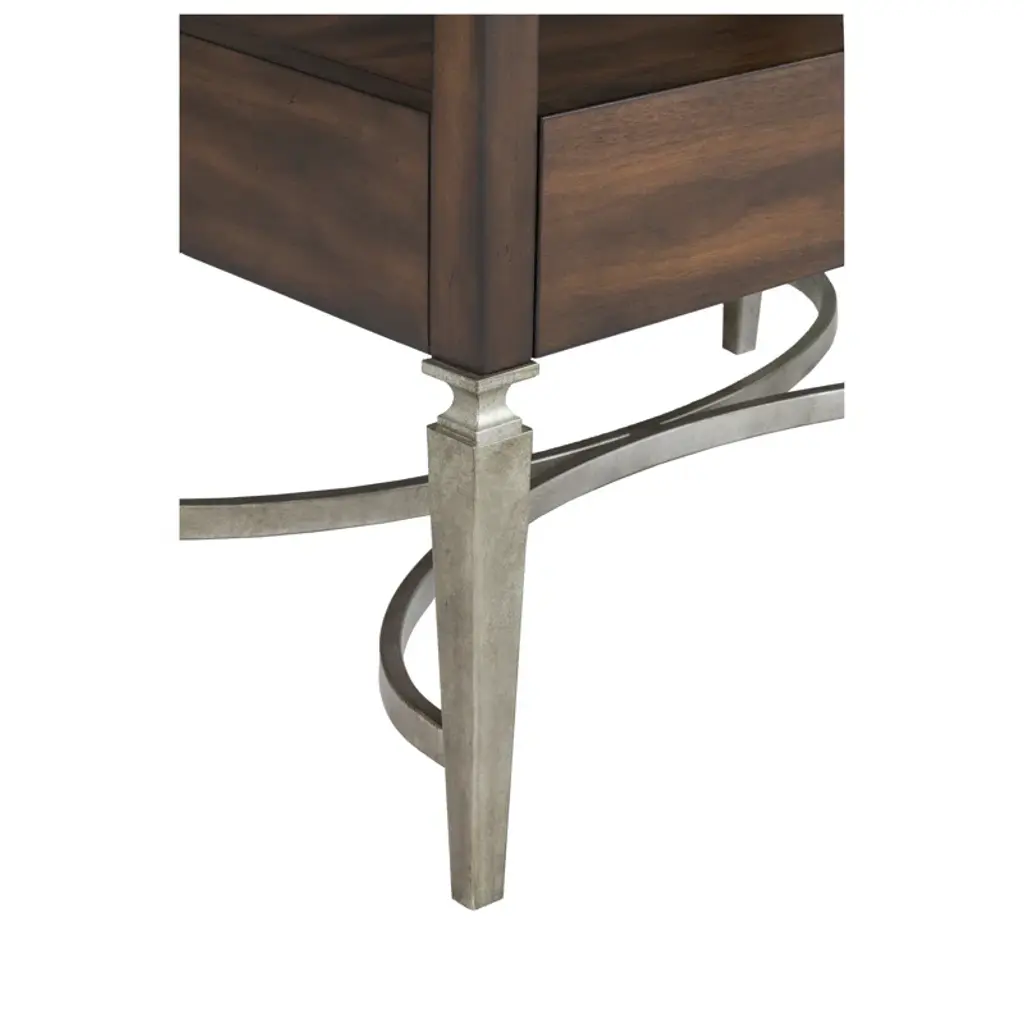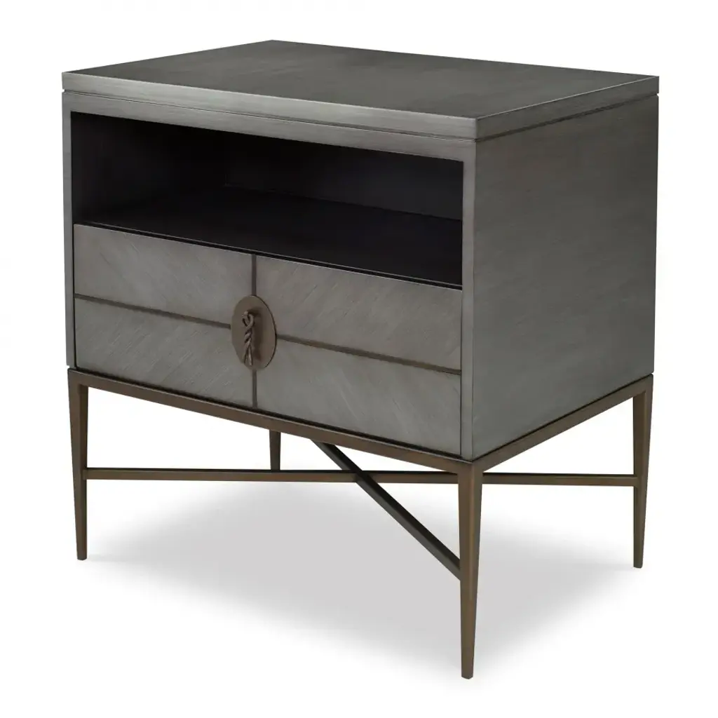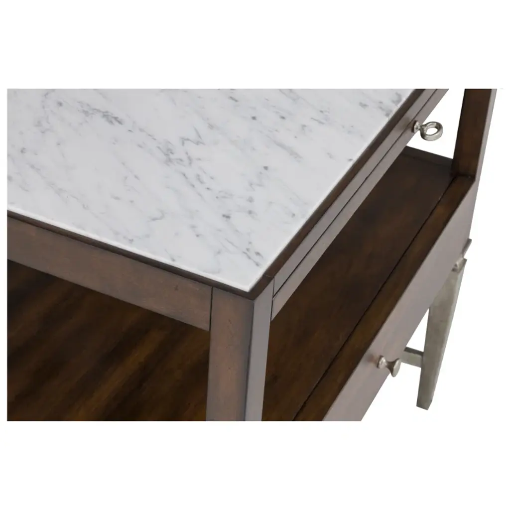Features one drawer and one pull out tray with inset White Carrera stone top. Metal base and hardware in Black Steel and Tahitian Pearl Finish. All drawers feature full extension and self-closing hardware. Also available in any Fairfield Finish M096-SB
