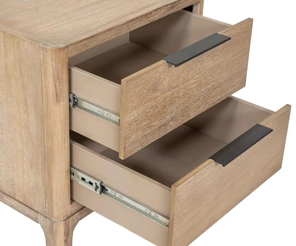 The Camen Nightstand is the perfect addition to any bedroom. Use the surface to display a bedside lamp and to store your favorite bedtime reading material, and utilize the drawers to keep other belongings tucked away safely. Featuring two drawers, this minimalistic nightstand can also be used as a side table in a living room or office space. This nightstand is finished in a unique light gray stain, and features a solid acacia frame with eye-catching veneer paneling. The quality construction of this piece can be seen through finger joints and knots, which ensure that no two pieces are alike. This collection is transitional by design, featuring a blend of contemporary silhouettes and rustic materials that allow these pieces to effortlessly blend with any modern decor. The natural feel of this piece is anchored by organic features such as knots, highlighted wood grain and color variations.