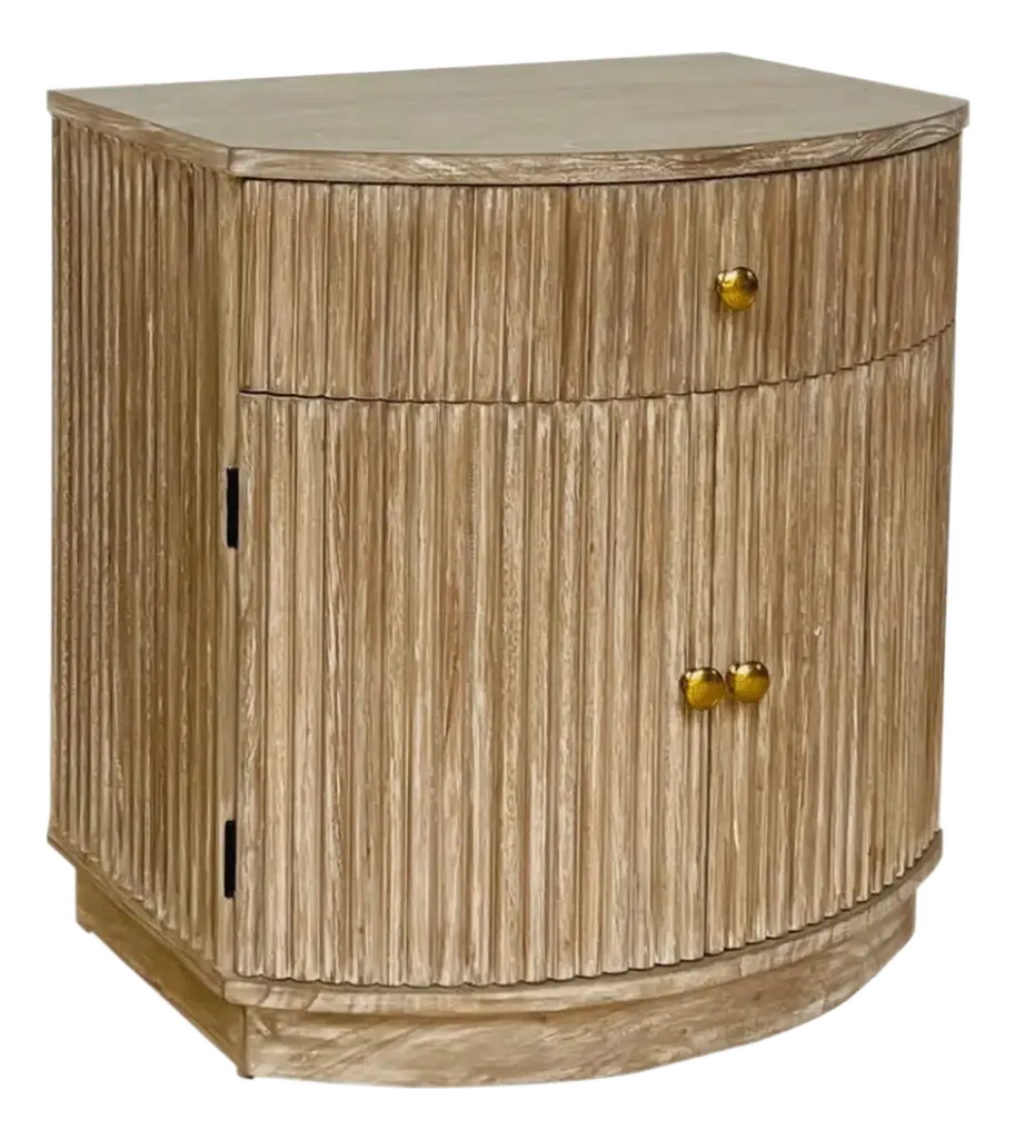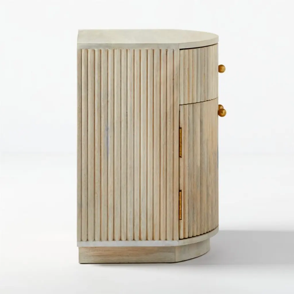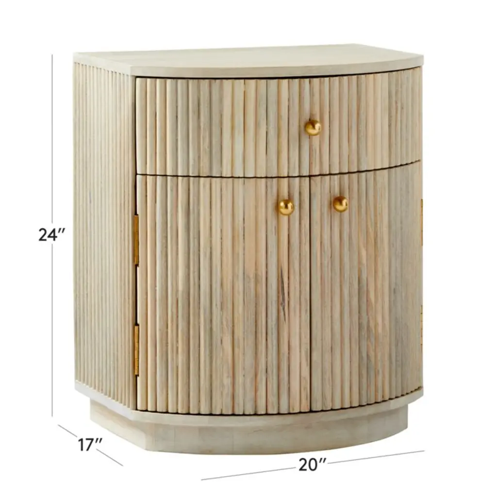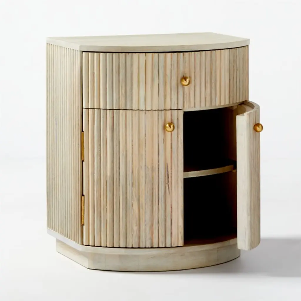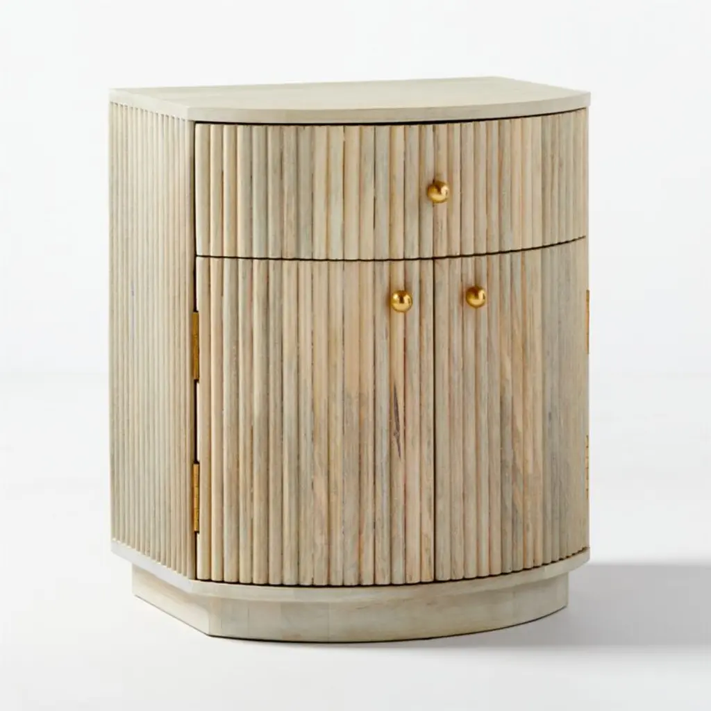 White-washed mango wood nightstand supports a unique curved silhouette and configuration: one drawer and two doors concealing a shelf inside for extra storage. We love the on-trend channeled detailing and brass knobs, too. CB2 exclusive.