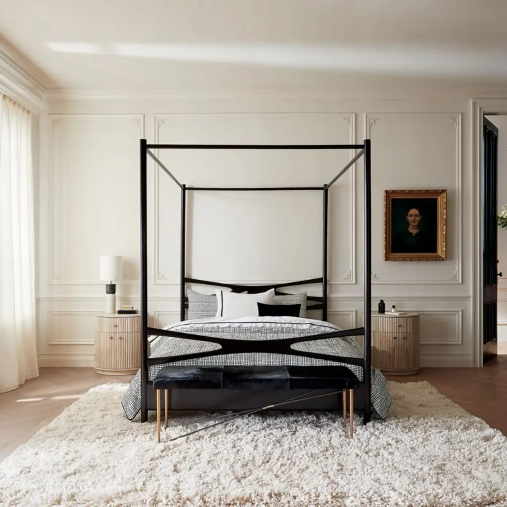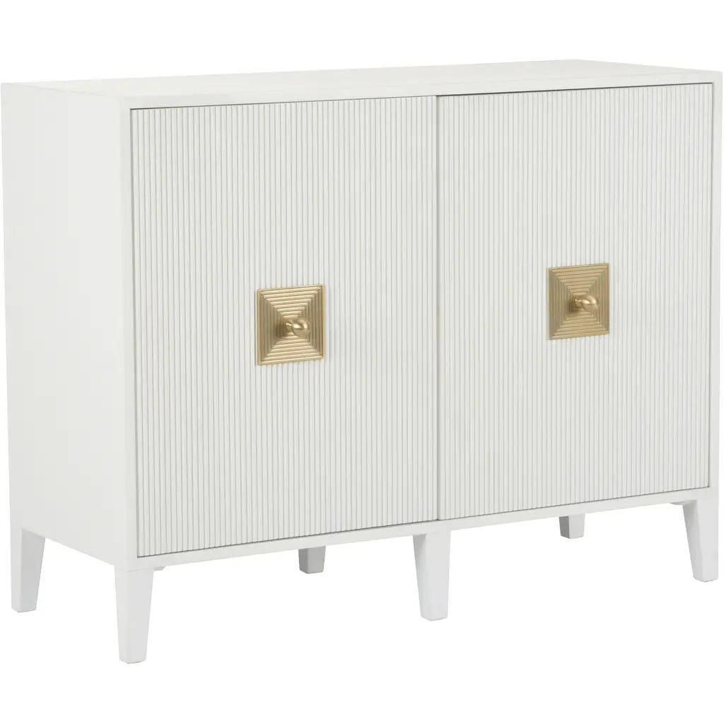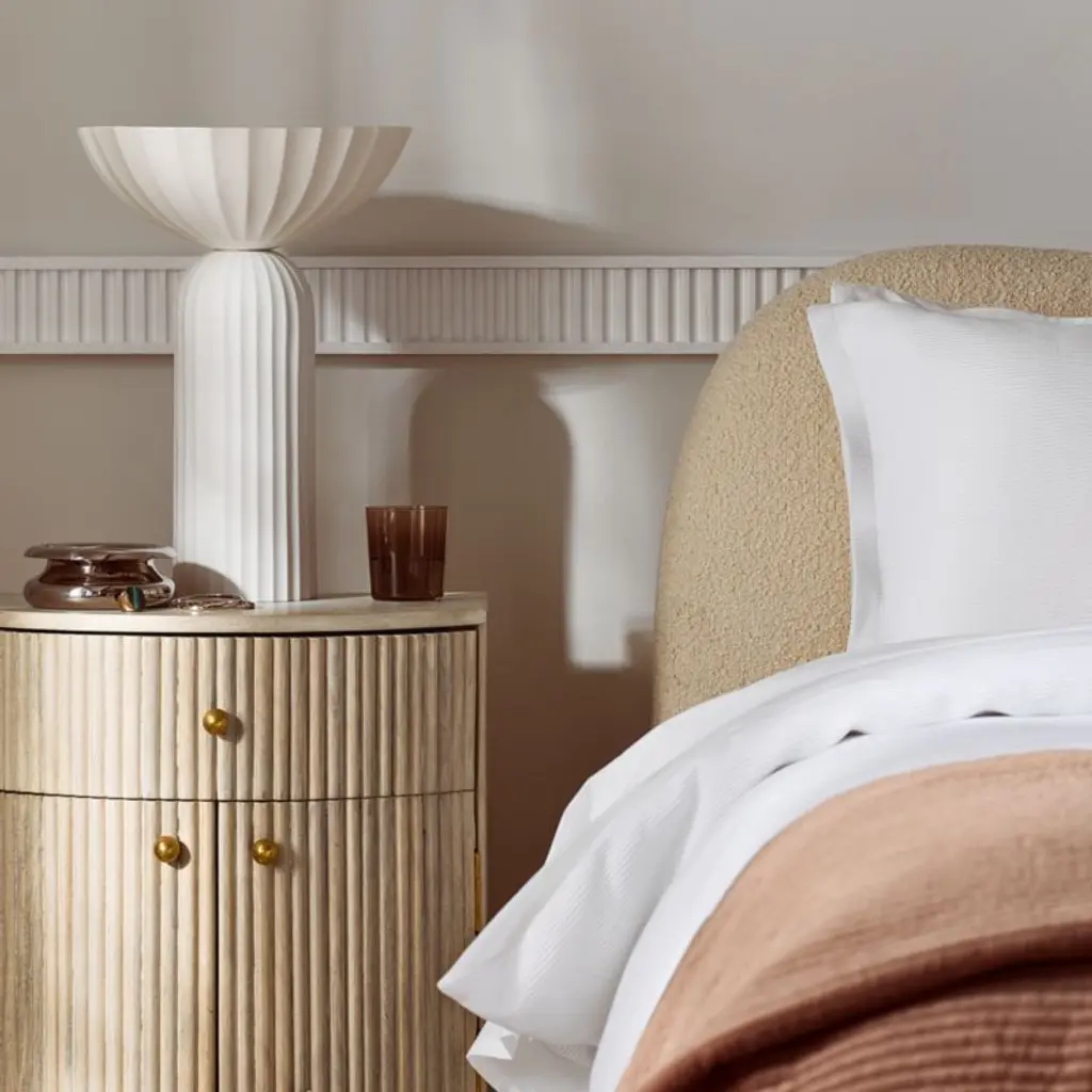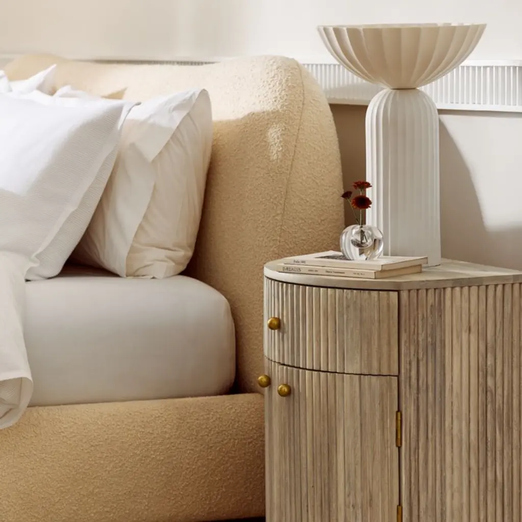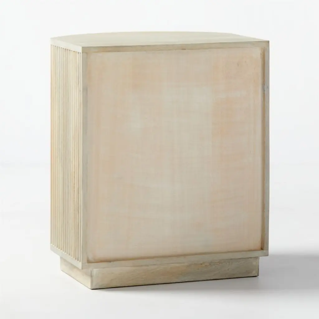 White-washed mango wood nightstand supports a unique curved silhouette and configuration: one drawer and two doors concealing a shelf inside for extra storage. We love the on-trend channeled detailing and brass knobs, too. CB2 exclusive.