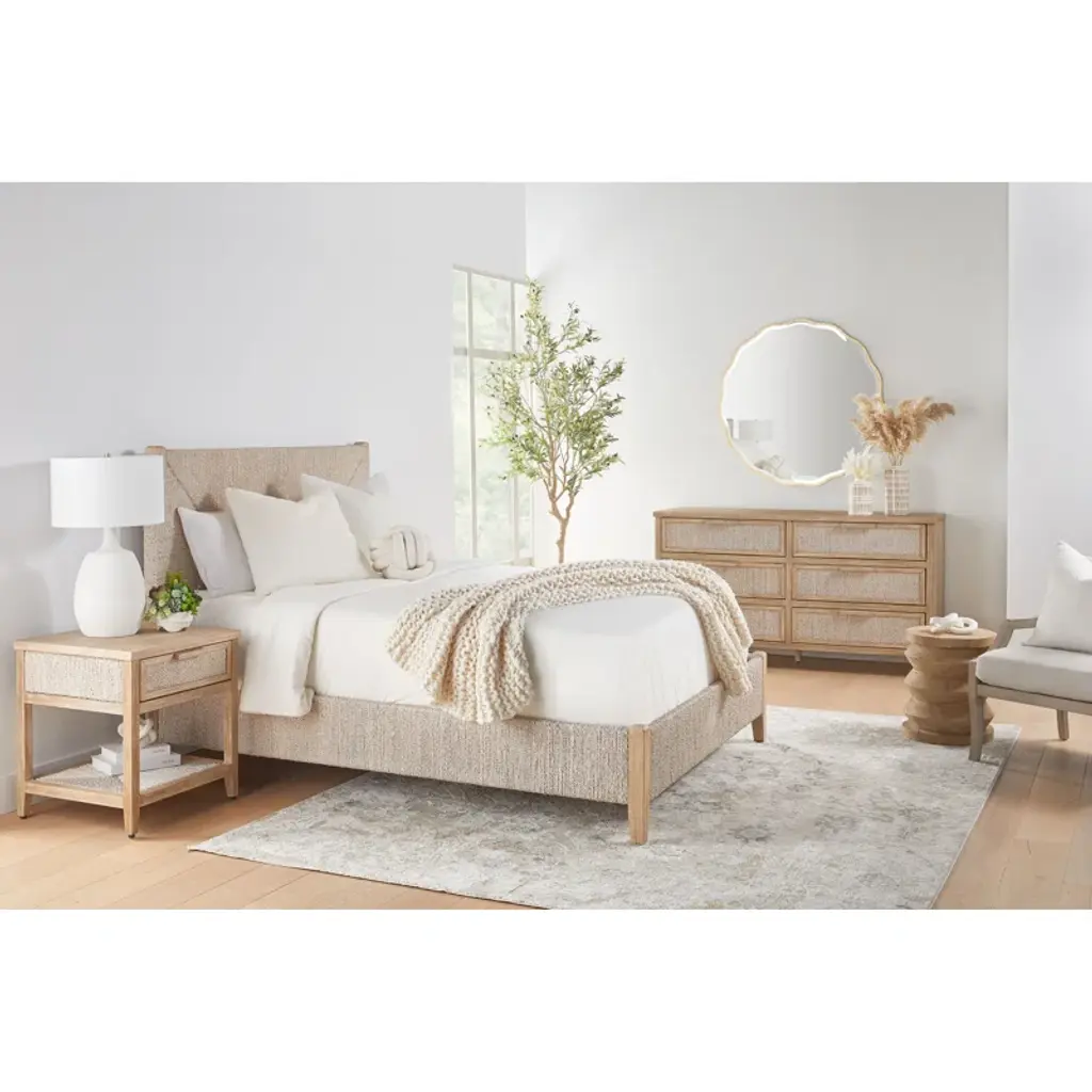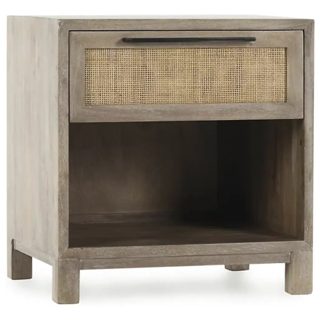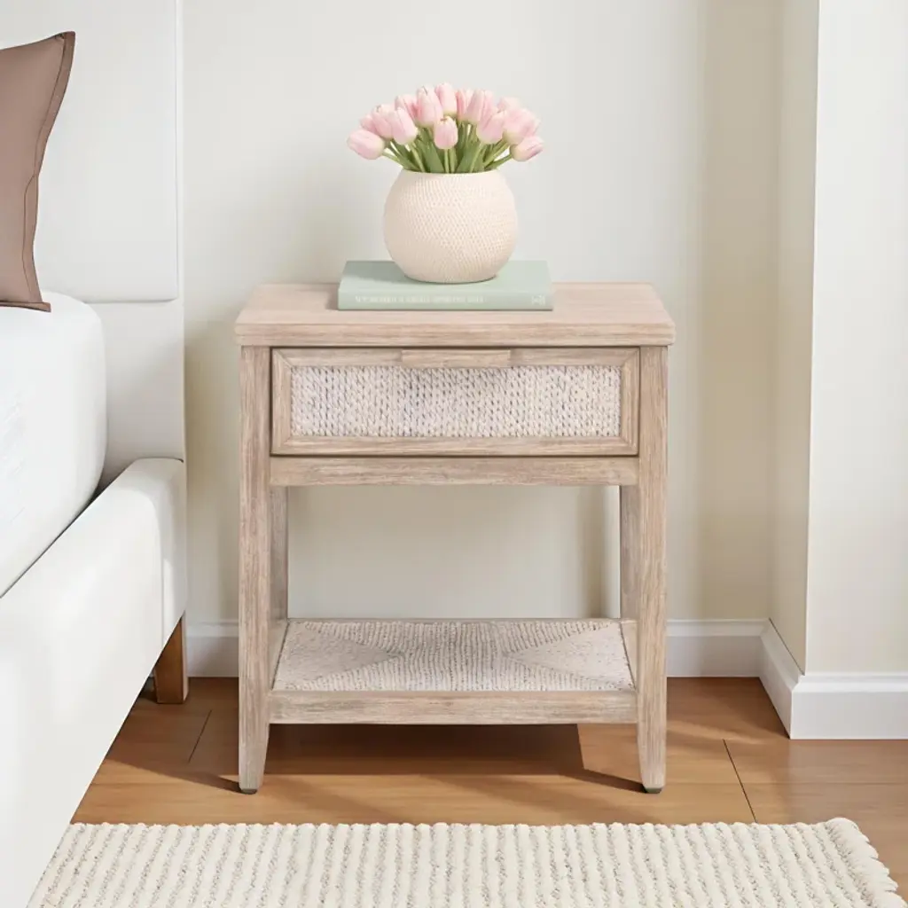 Elevate your bedroom with this 1-Drawer Nightstand. Embodying transitional style, this nightstand boasts a captivating fusion of white washed abaca rope and mahogany wood with a natural gray finish, creating a harmonious blend of texture and color. The handwoven natural abaca rope gives the nightstand a unique tropical charm with an organic look. The one storage drawer ensures your essentials stay organized, while the lower storage shelf offers extra space for your bedside necessities. With a finished backside and adjustable feet levelers, this nightstand is as versatile as it is stylish. It measures 24” wide, 22” deep, and 26” high. Upgrade your bedroom's aesthetic with this exceptional coastal-inspired piece.