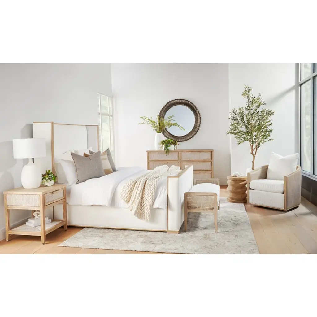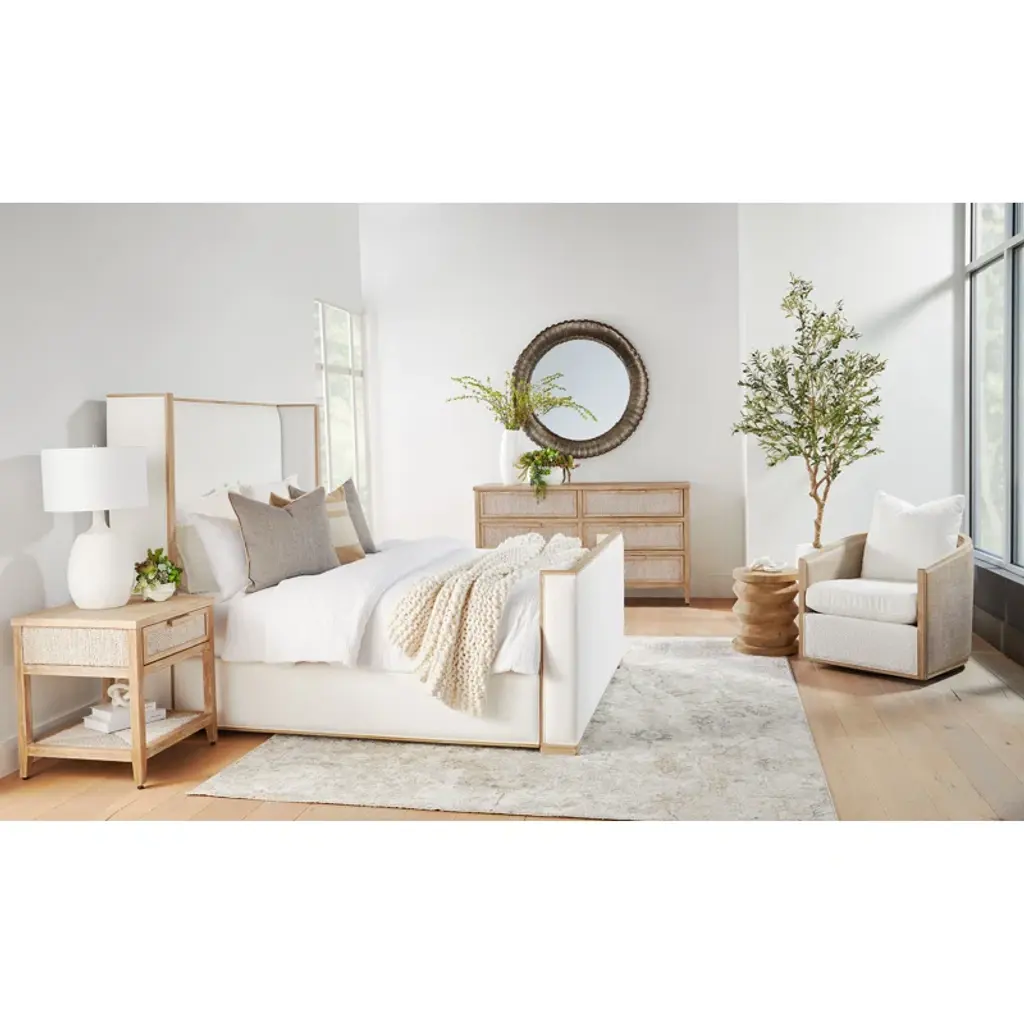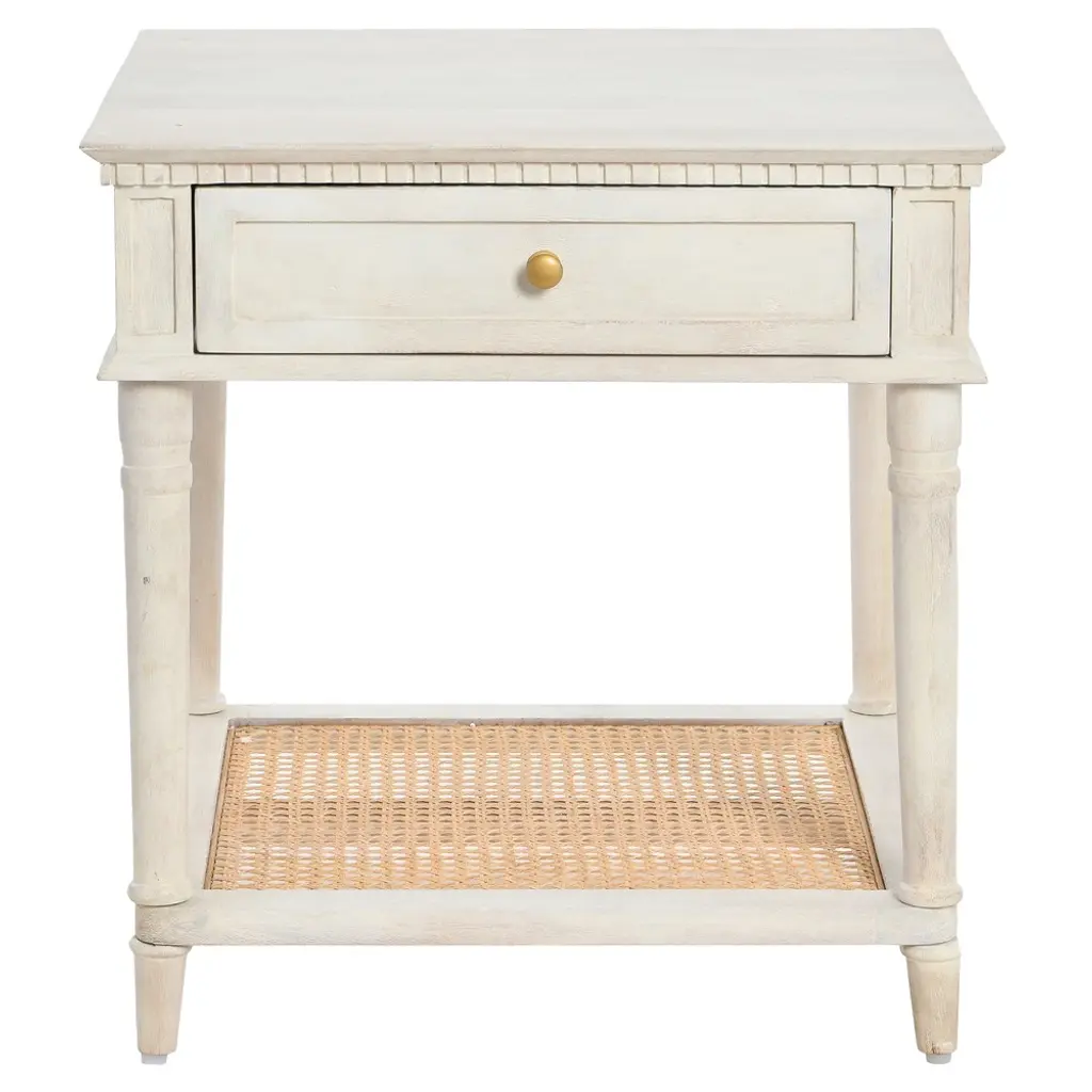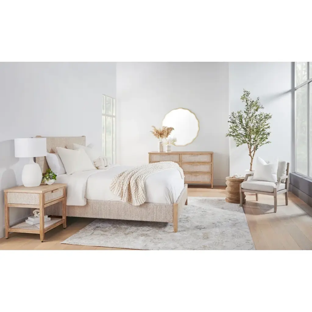 Elevate your bedroom with this 1-Drawer Nightstand. Embodying transitional style, this nightstand boasts a captivating fusion of white washed abaca rope and mahogany wood with a natural gray finish, creating a harmonious blend of texture and color. The handwoven natural abaca rope gives the nightstand a unique tropical charm with an organic look. The one storage drawer ensures your essentials stay organized, while the lower storage shelf offers extra space for your bedside necessities. With a finished backside and adjustable feet levelers, this nightstand is as versatile as it is stylish. It measures 24” wide, 22” deep, and 26” high. Upgrade your bedroom's aesthetic with this exceptional coastal-inspired piece.