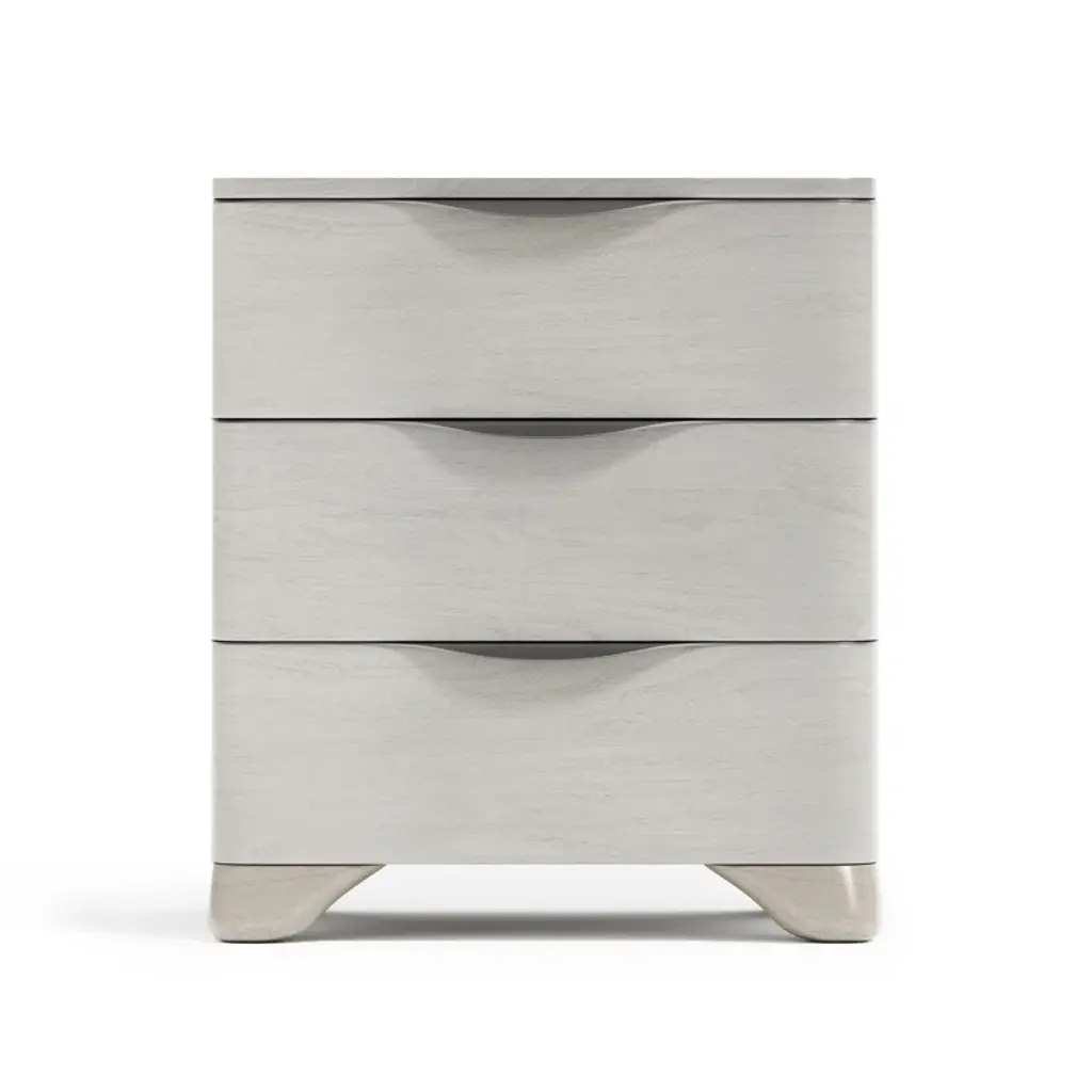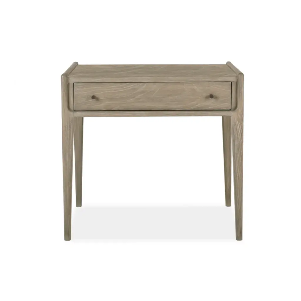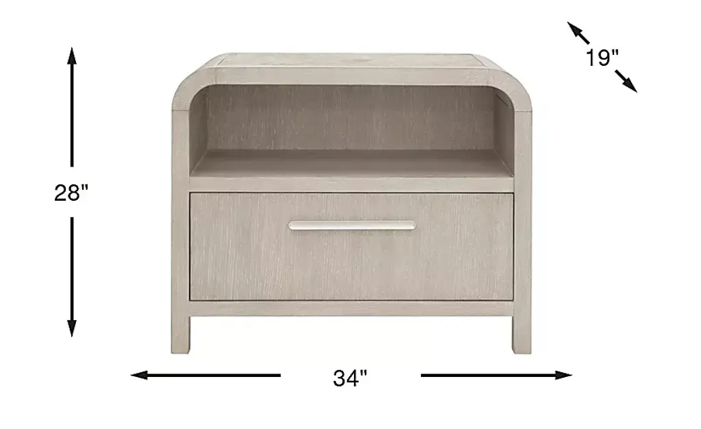 Exuding a calm and meditative ambiance, the Drew & Jonathan Canyon nightstand's natural elements and curved design presents a warm sophistication for your personal retreat. Constructed with oak veneers in a light gray finish, this contemporary piece features a rounded frame and silver metal pull, providing a soft holistic look. The touch LED light in the top shelf is perfect for nighttime reading or showcasing decor. French dovetail construction in the front and English dovetail in the back with full extension ball-bearing glides secure the support and longevity of the drawer. The top of the nightstand features a stone inlay for the perfect final look.