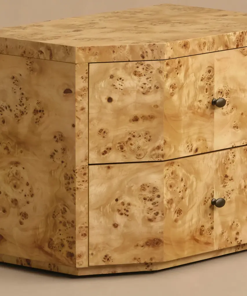 Carbon Nightstand Burlwood A modern silhouette paired with burlwood veneer makes this piece the striking statement your bedroom needs. Finished with a warm, natural honey tone on both the veneer and the pine wood back and interior, adding a touch of warmth and richness. Features dark oil rubbed bronze knobs. Magnetic closures ensure that the doors are securely closed when not in use. Designed with adjustable levelers on its feet to prevent wobbling on uneven flooring and surfaces. Features 2 drawers with an oval metal knob on each and soft close glides. Made in Vietnam. CA Residents: Prop 65 Information