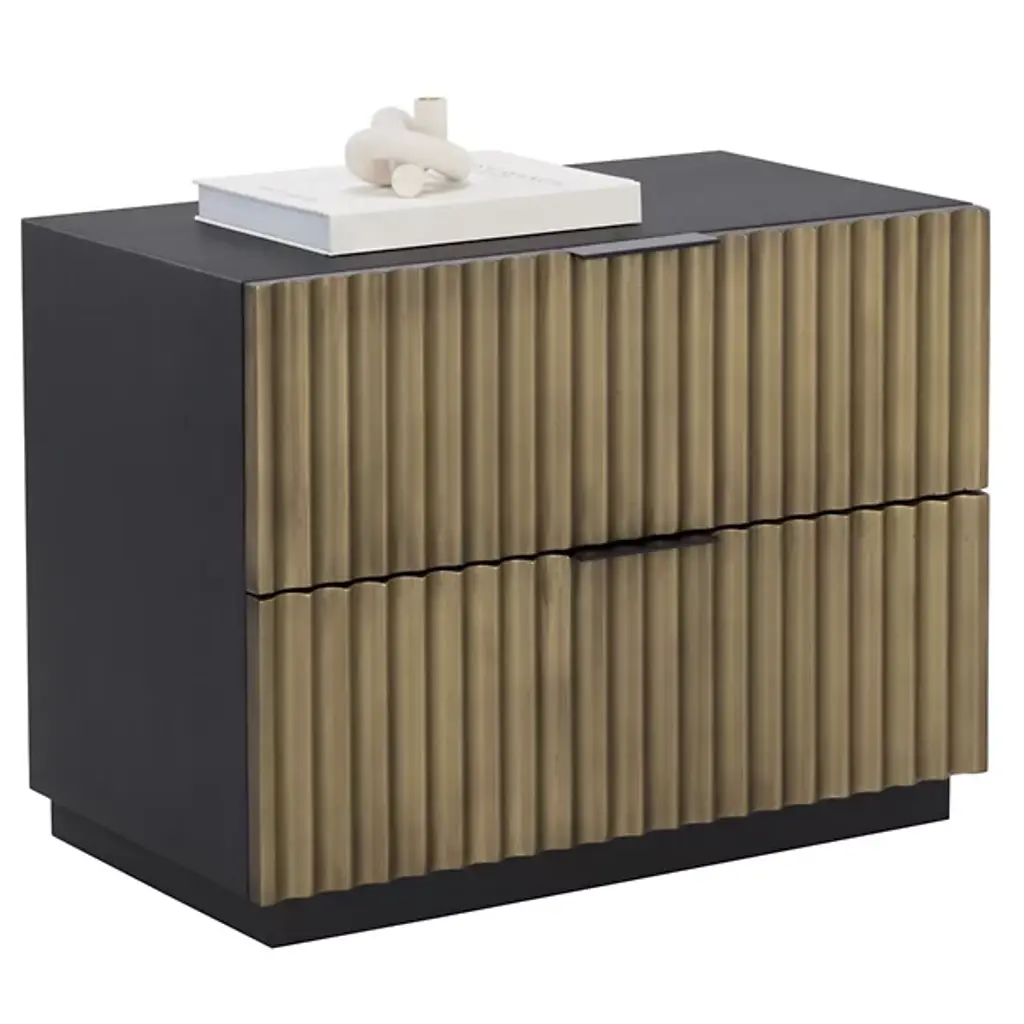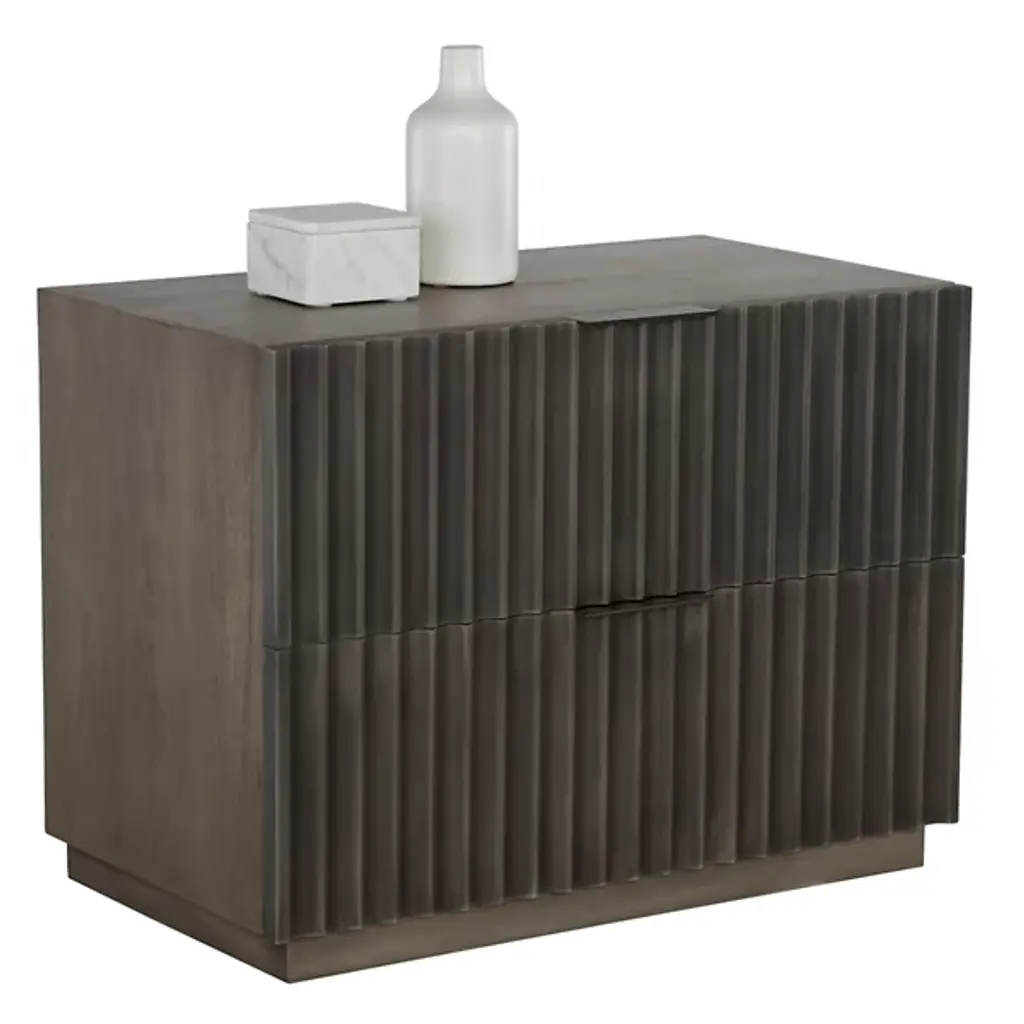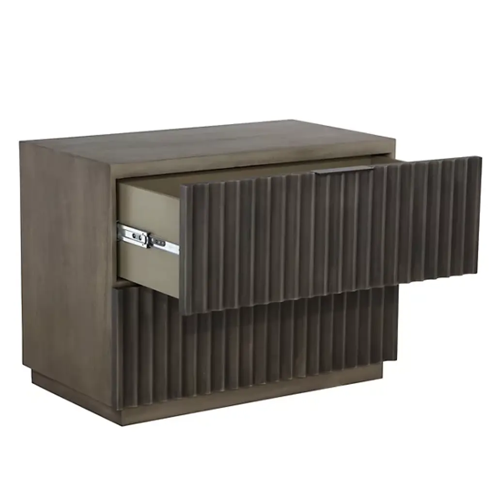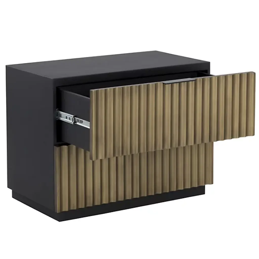 The Carlin Nightstand from Sunpan is designed to command attention in any bedroom. Crafted from black mango wood, it features dramatic sculpted details on the two drawer fronts, complemented by sleek black powder-coated aluminum handles for a modern finish. The organic nature of the wood ensures that each piece is unique, with natural variations in texture, color, and grain, along with charming knots and burls. Expertly made in India by skilled artisans, this nightstand embodies refined craftsmanship and one-of-a-kind character.