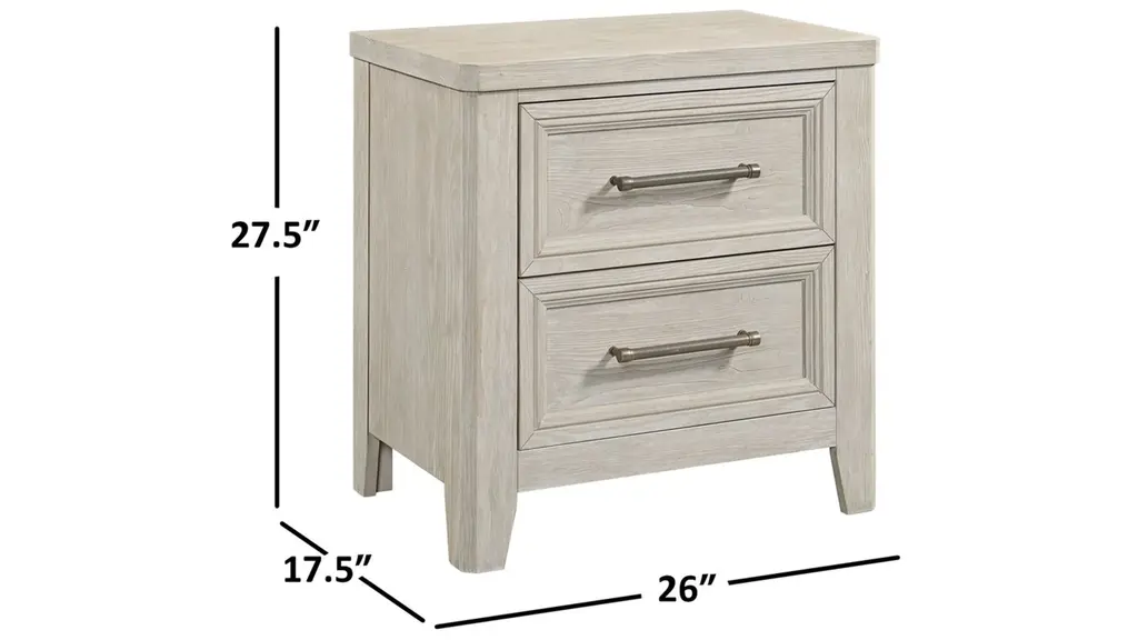 The Carlson Nightstand offers transitional style blended with the casual nature of lightly wire brushed pine solids and veneer. This larger scale group features thick solid wood tops, chamfered front posts, framed drawer, and door accents in a comfortable washed linen finish. The hefty bar pull hardware features a stylish antique pewter finish, to beautifully round out this collection.