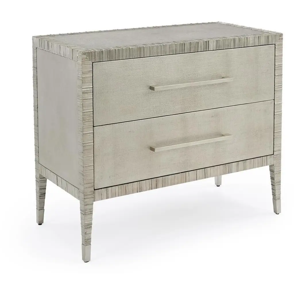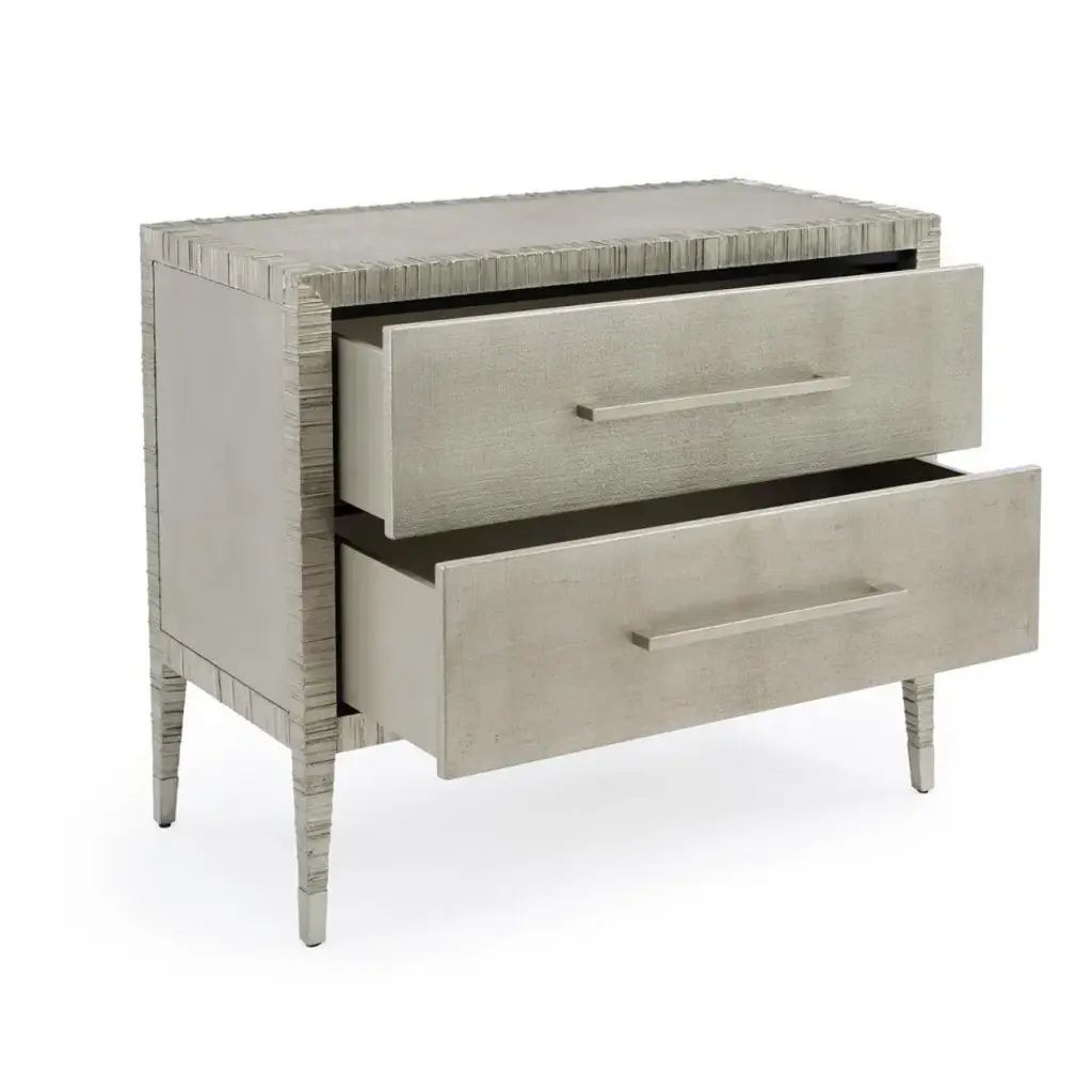 The Carraway Silver Nightstand with two drawers is encased in burnished pewter on linen. The nightstand is edged in a pewter finish.