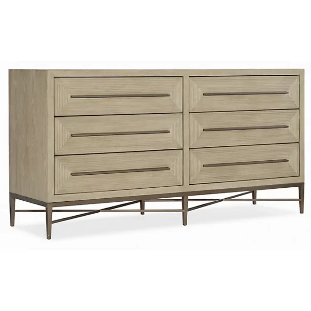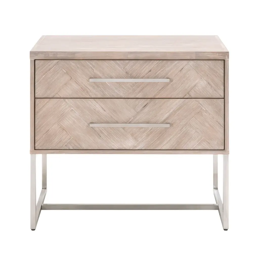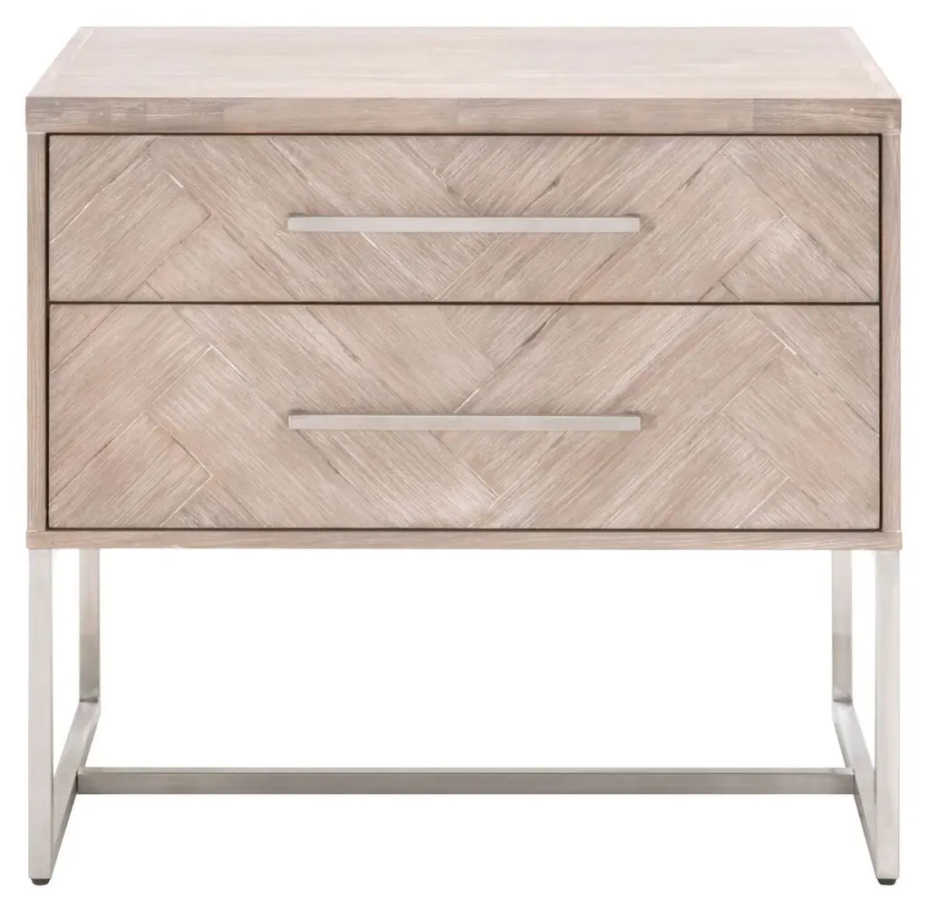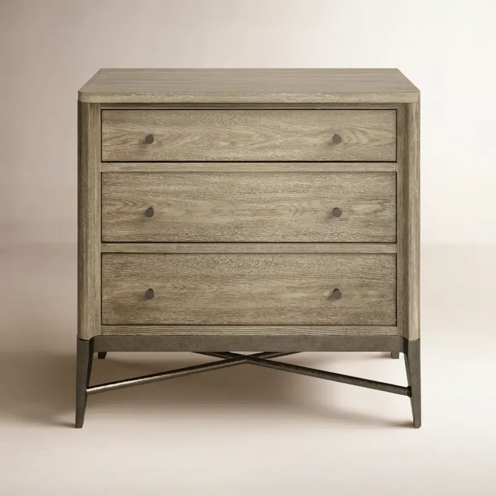 Svelte and sophisticated in a serene soft finish on Oak Veneers with tactile reeded drawer fronts, the Cascade Nightstand with 3 self-closing drawers is a stylish statement piece brimming with storage and function. The Terrain finish on oak veneers is dry-brushed for a casual appeal, and accented by champagne-colored bar pull hardware and slender metal legs joined by an X-stretcher. Functional features include a USB Outlet and cord clip.