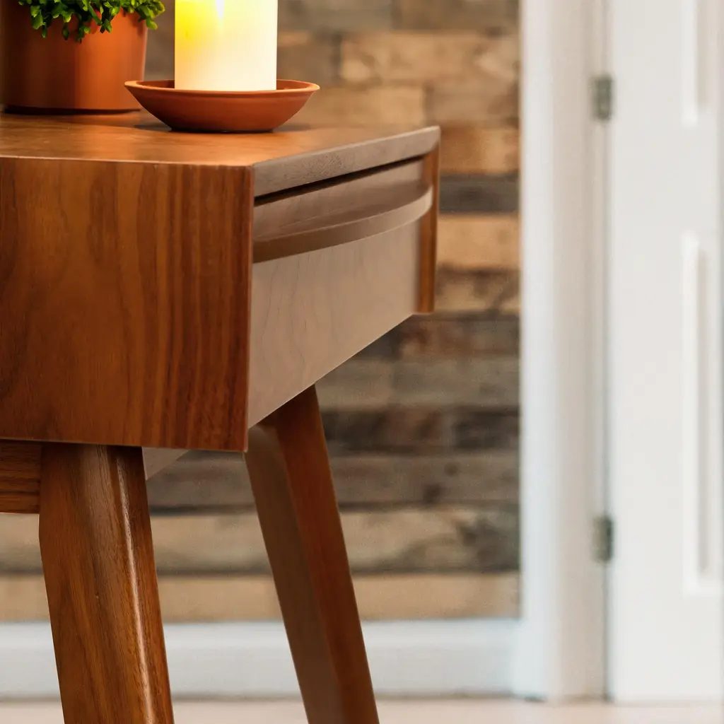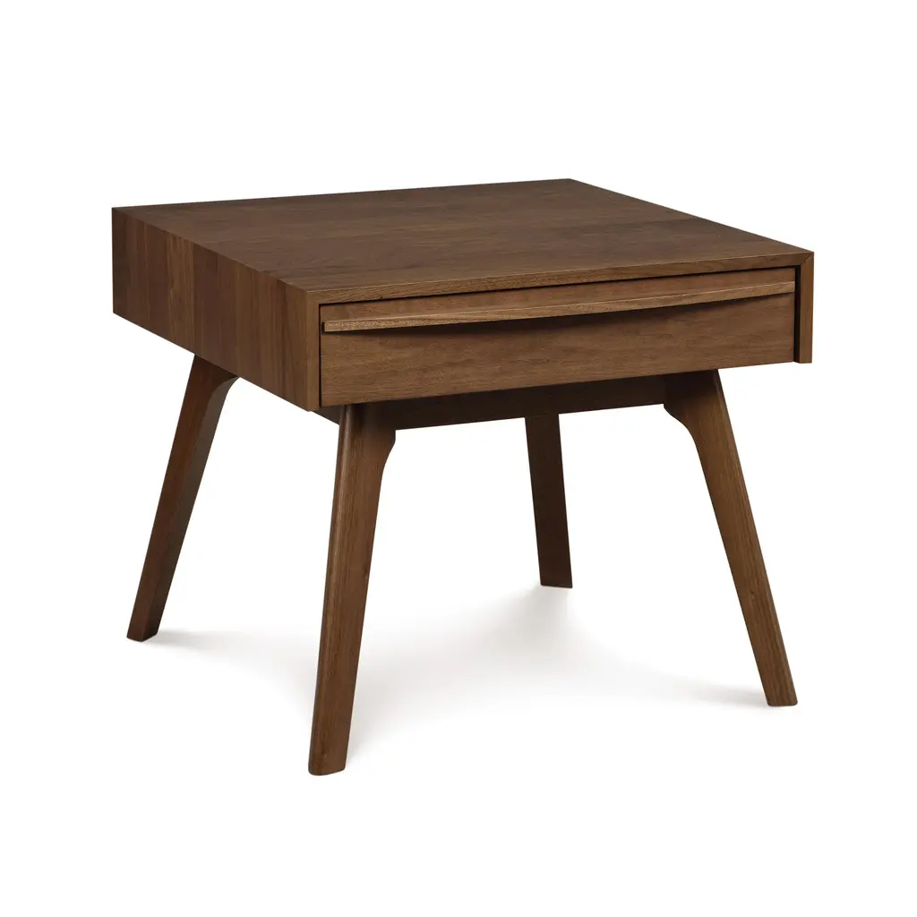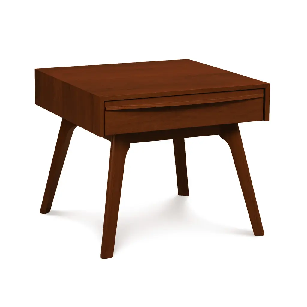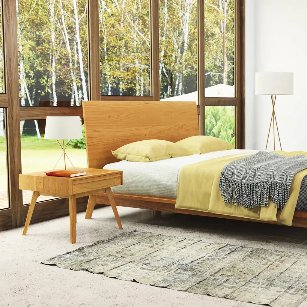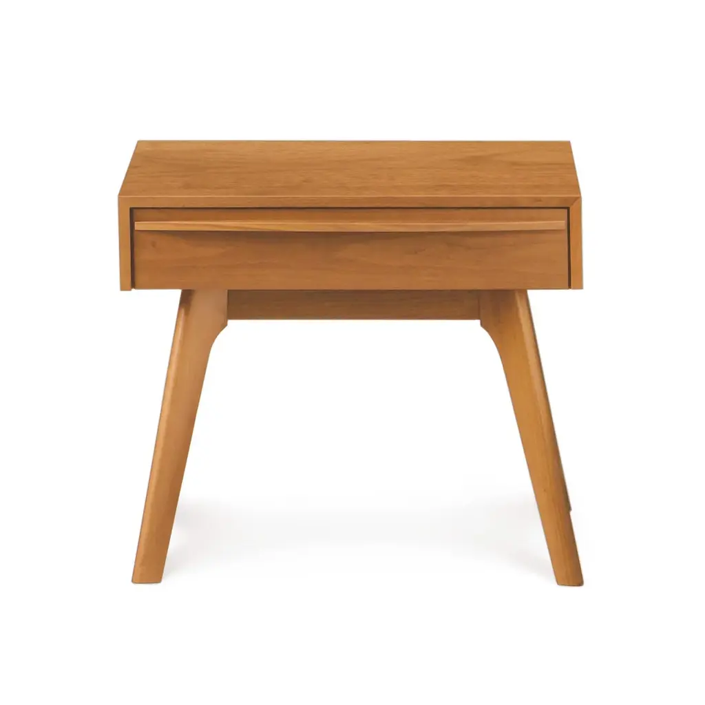 Shown in cherry, our modern, solid wood Catalina Nightstand features a low, sleek and clean design and is perfect for the contemporary, minimalist bedroom. Constructed of solid natural North American hardwood. Our Catalina Bedroom Furniture Collection is handmade in Vermont using sustainably harvested woods. Construction details include English dovetails, fully finished drawer boxes, under-mounted, soft-close drawer slides and optional water-based formaldehyde-free finish.Base price represents nightstand in natural cherryShown in natural cherry Matching furniture available in our Catalina Furniture CollectionNatural variations in solid wood and hand applied finishes make each piece unique. Slight grain and finish irregularities tell you that the furniture has been crafted from solid wood and are considered hallmarks of quality.