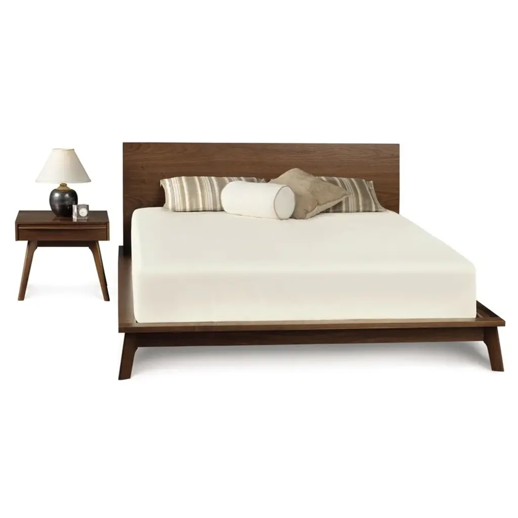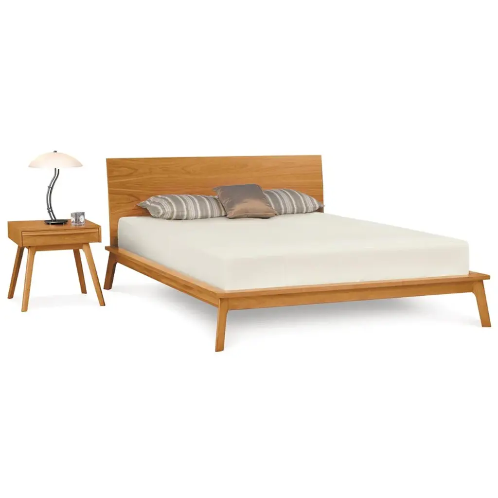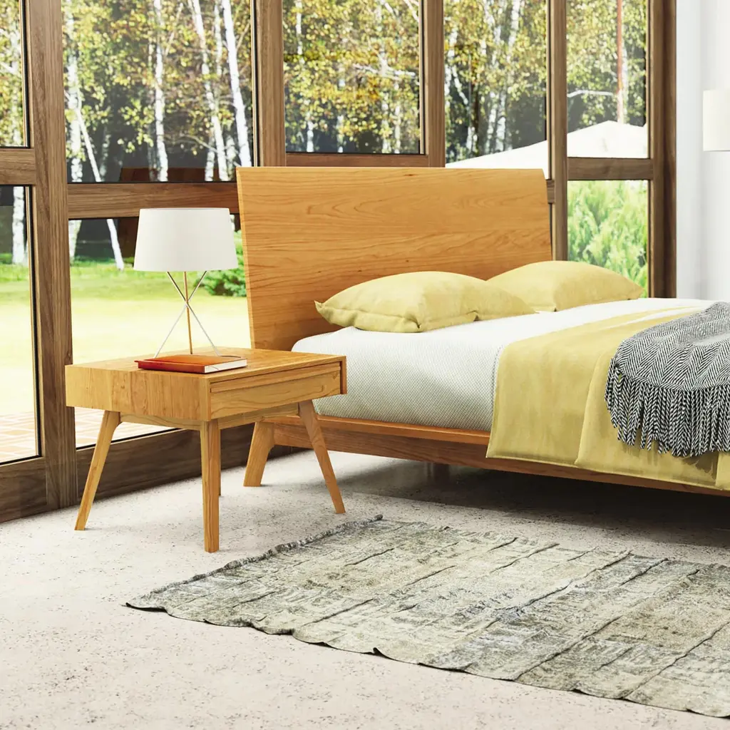 An American classic, the handmade craftsmanship of the Catalina Nightstand by Copeland Furniture champions a mid-century modern influence. Part of the larger Catalina collection, the effortless beauty of the natural wood grain and details in the character flaws make this piece and other pieces distinct to the touch. The Catalina Bedroom is crafted in solid cherry hardwood or solid walnut hardwood. All pieces are either finished with pre-catalyzed lacquer which is the conventional top coat for Copeland Furniture that resists stains, moisture rings and spots, heat damage (from hot beverages, etc.), and abrasions. Features