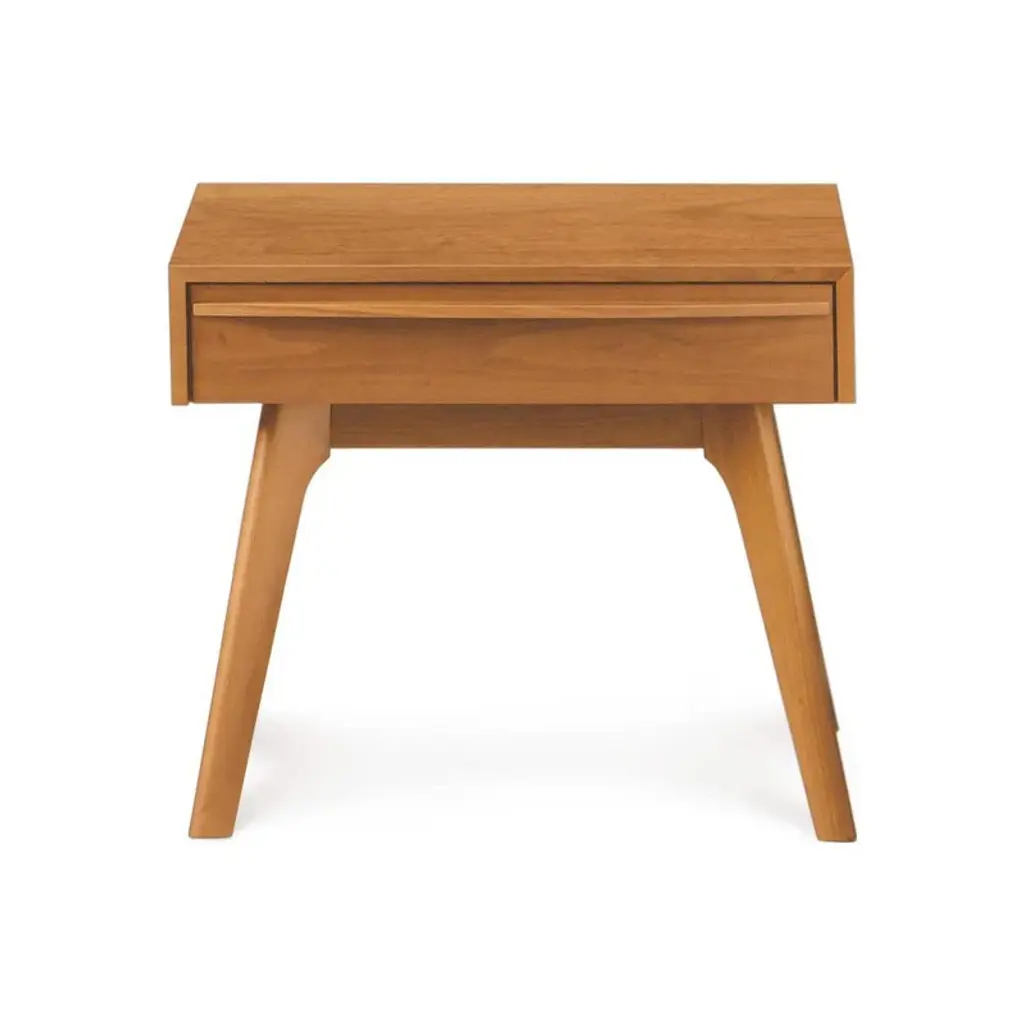An American classic, the handmade craftsmanship of the Catalina Nightstand by Copeland Furniture champions a mid-century modern influence. Part of the larger Catalina collection, the effortless beauty of the natural wood grain and details in the character flaws make this piece and other pieces distinct to the touch. The Catalina Bedroom is crafted in solid cherry hardwood or solid walnut hardwood. All pieces are either finished with pre-catalyzed lacquer which is the conventional top coat for Copeland Furniture that resists stains, moisture rings and spots, heat damage (from hot beverages, etc.), and abrasions. Features