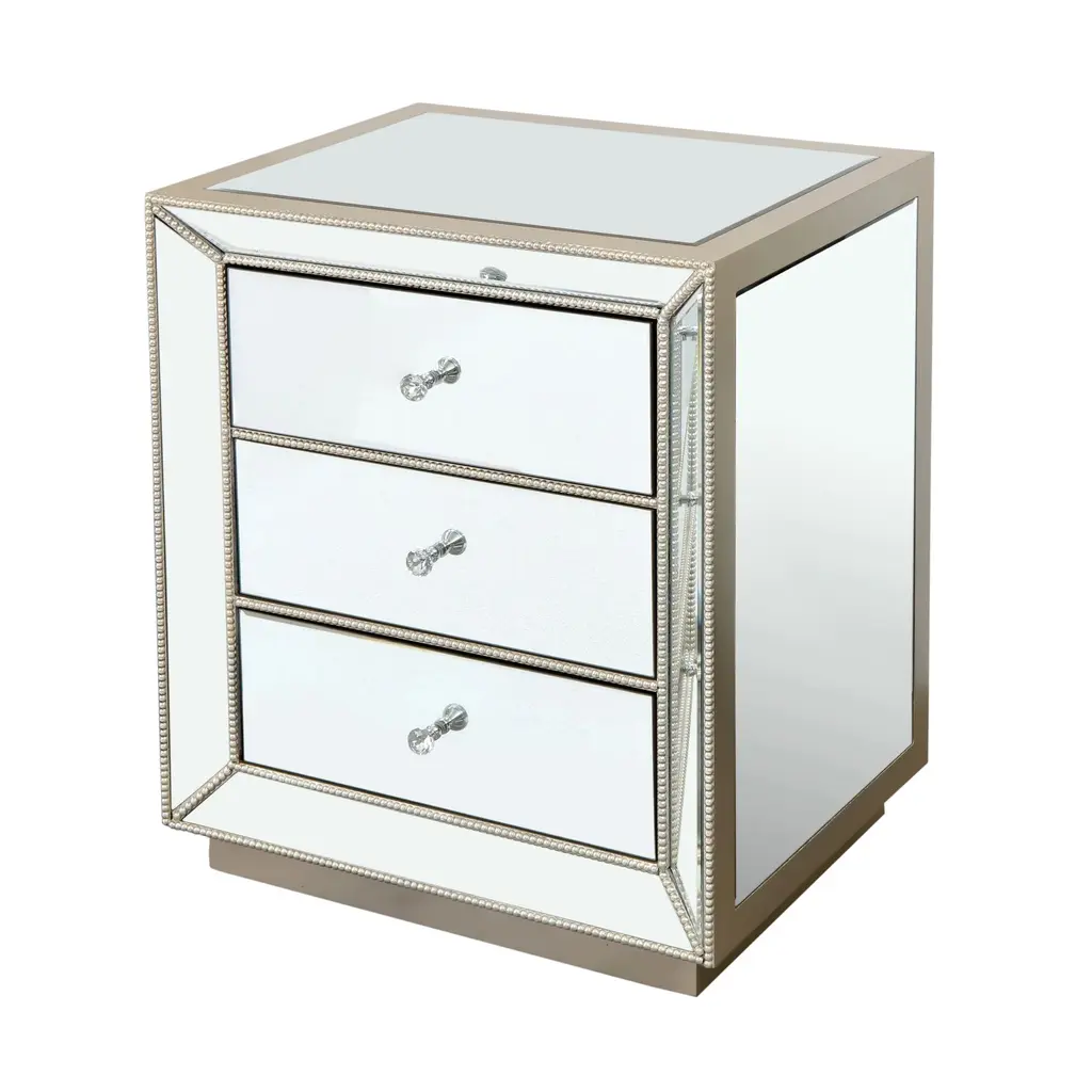 The Caterina Nightstand is a stunning contemporary piece with a wealth of dimension and depth. Crafted from beech wood, the square frame has been overlain with eglomise panels, with two push-latch drawers featuring an angular look and silver-powder interiors. Opulent borders in Valyrian Gold neatly trace the edges of the piece, contributing metallic tones that beautifully complement the reflective surfaces.