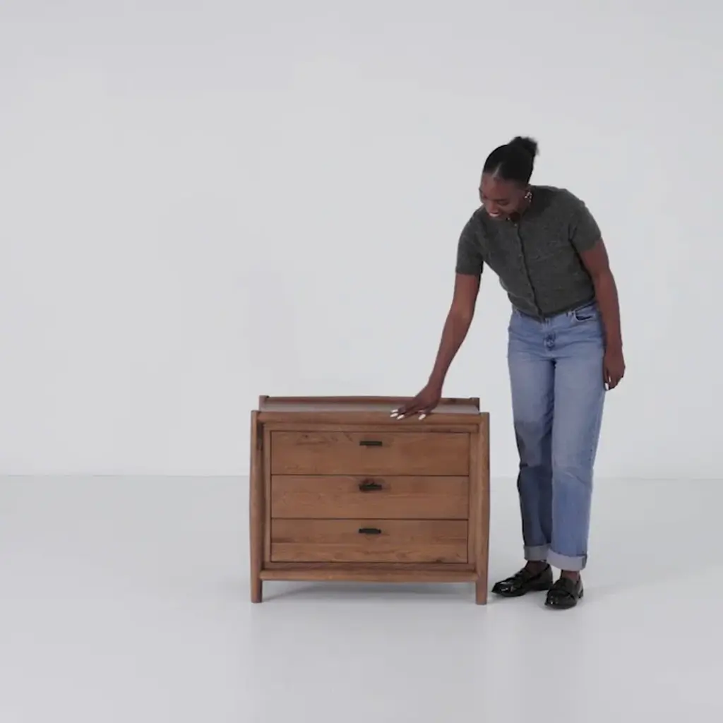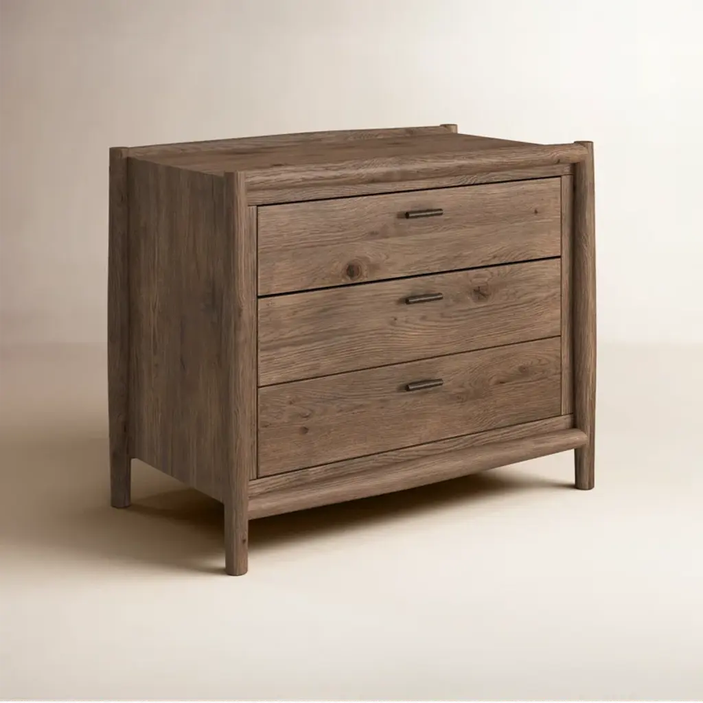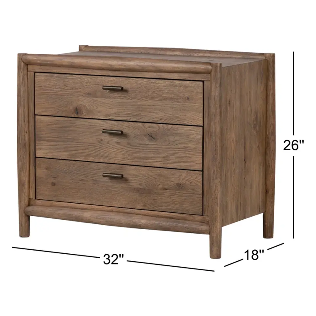 Traditional, reimagined. Made from rustic weathered oak, a three-drawer nightstand inspired by spindle design brings bonus storage to the bedside.