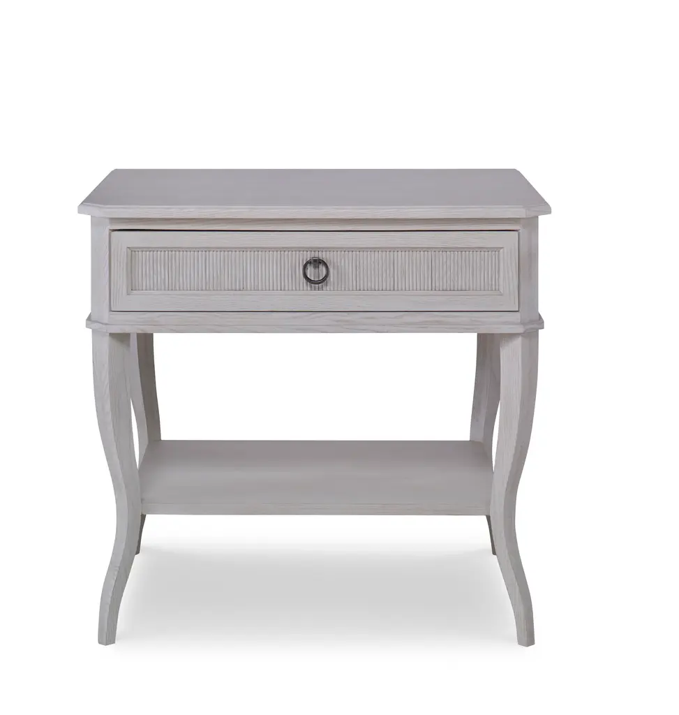 This piece is available only as shown, and will ship in 2-3 weeks. An elegant nightstand crafted of Chalk finish Ash solids and veneer. A Single soft-close drawer with pewter finish hardware above an open shelf provides convenient storage. Welcome to Monarch Fine Furniture for Century. This amazing collection of English reproductions features a variety of old world techniques including fine marquetry, églomisé, and gesso. These eclectic designs are the perfect accent to any room.