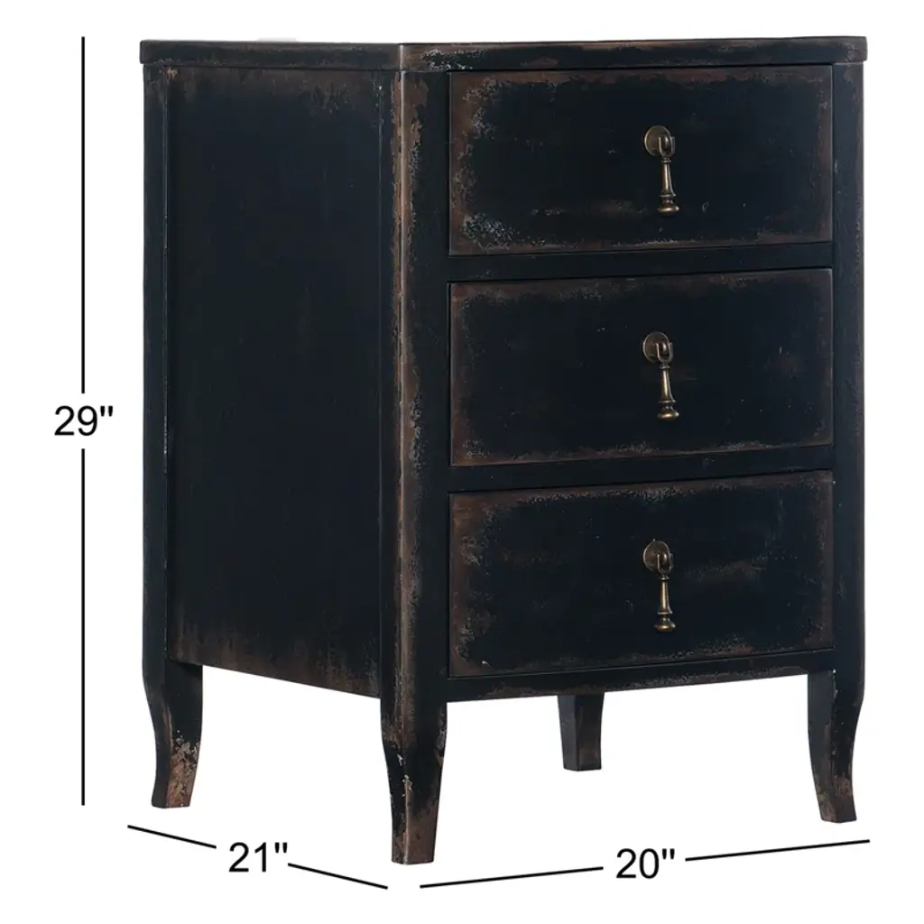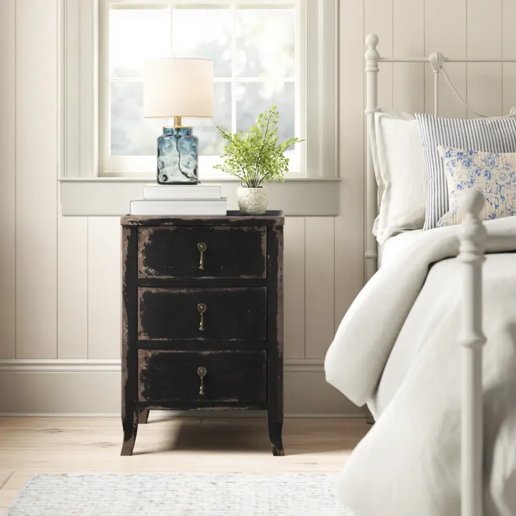 This farmhouse-inspired nightstand adds a rustic touch to your bedroom while keeping your essentials within reach. Crafted from a mix of solid and engineered wood, it features a distressed finish with wormhole details for that well-loved look. The soft-close drawer with a removable metal handle offers discreet storage, while the cable management system keeps cords tidy. Though it doesn't have a finished back, you'll love how this nightstand brings warmth and character to your space. Just the right blend of function and charm for your cozy retreat.