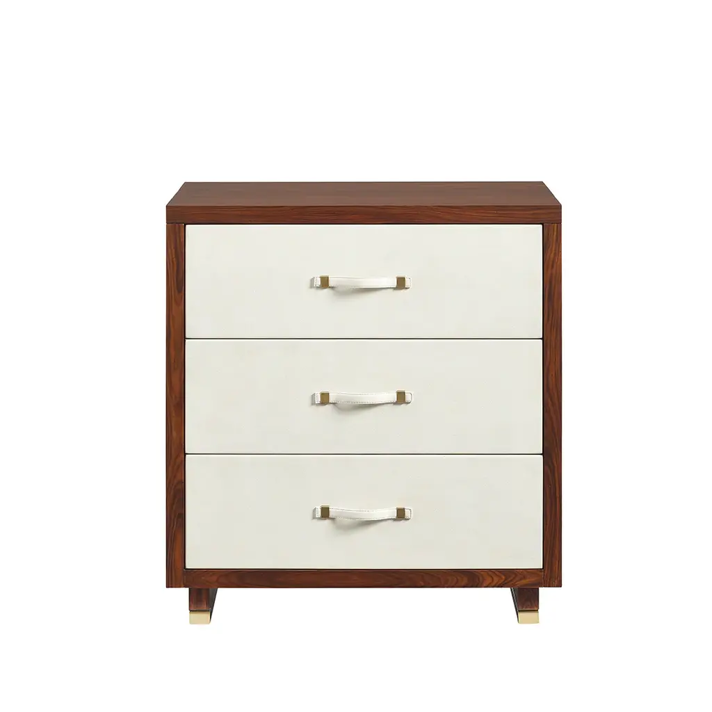 With a sophisticated mix of unique materials, our Chapman collection combines quality workmanship with sleek modern style. The refined pieces are constructed in rich walnut hardwoods and Rosewood veneers, accented with lightly textured faux leather drawer fronts and pulls. The Chapman collection also includes a dresser (sold separately). Ships In 4-5 Weeks Power receptacles Three drawers Brass hardware and accents Faux leather fronts and handles Walnut Hardwood and Rosewood finish This image is for illustrative purposes only. The colors shown are accurate within the constraints of lighting, photography, and the color accuracy of your screen.
