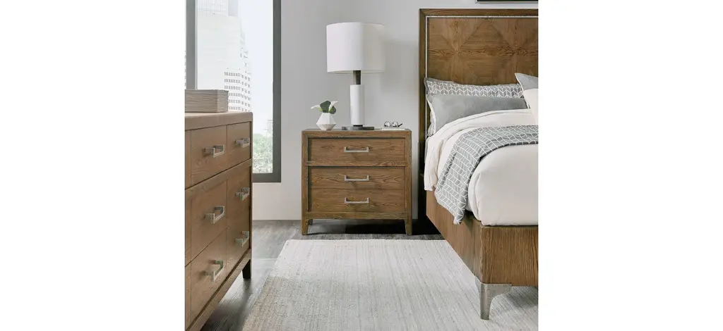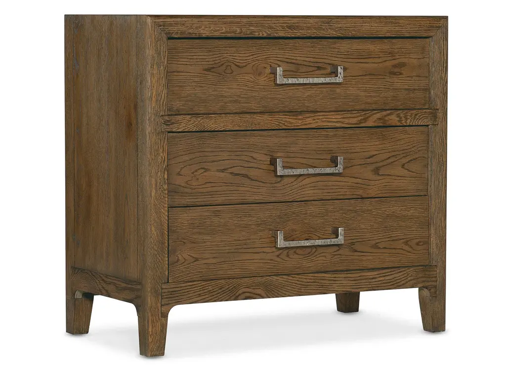 The modern lines of the Chapman nightstand are blended with contemproary aesthetic to create a unique offering for your bedroom. Custom hardware and unique hand-hammered metal accents in a forged pewter finish add to the contemporary style.
