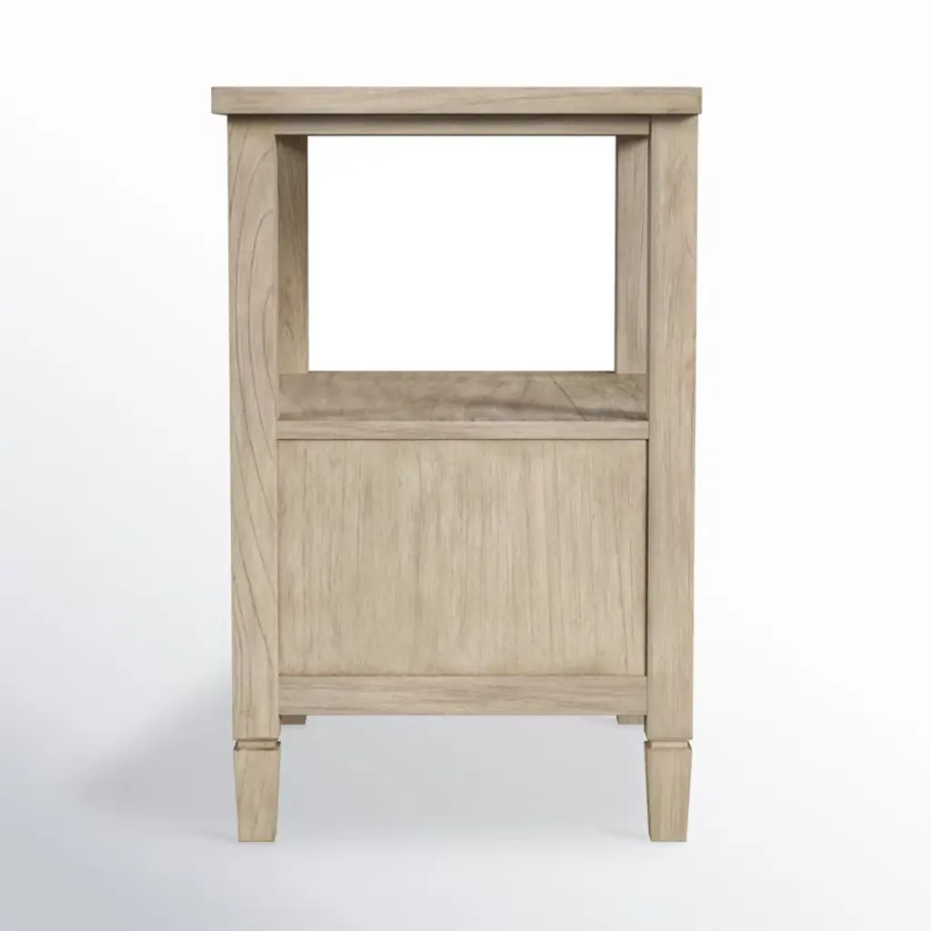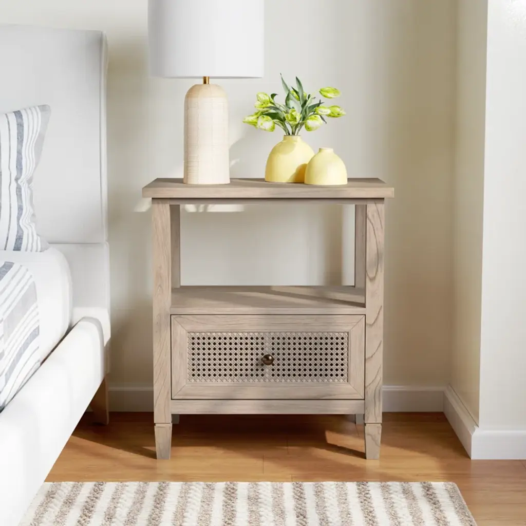 Refined yet relaxed, our nightstand imbues your main or guest bedroom with cozy cottage vibes. Its kiln-dried wooden frame comes in a washed tone that softens its look. An upper shelf is just the spot for books, while the lower drawer features cane paneling and an antique bronze knob. Tuck your nightly essentials inside, so they're close at hand when you need them.