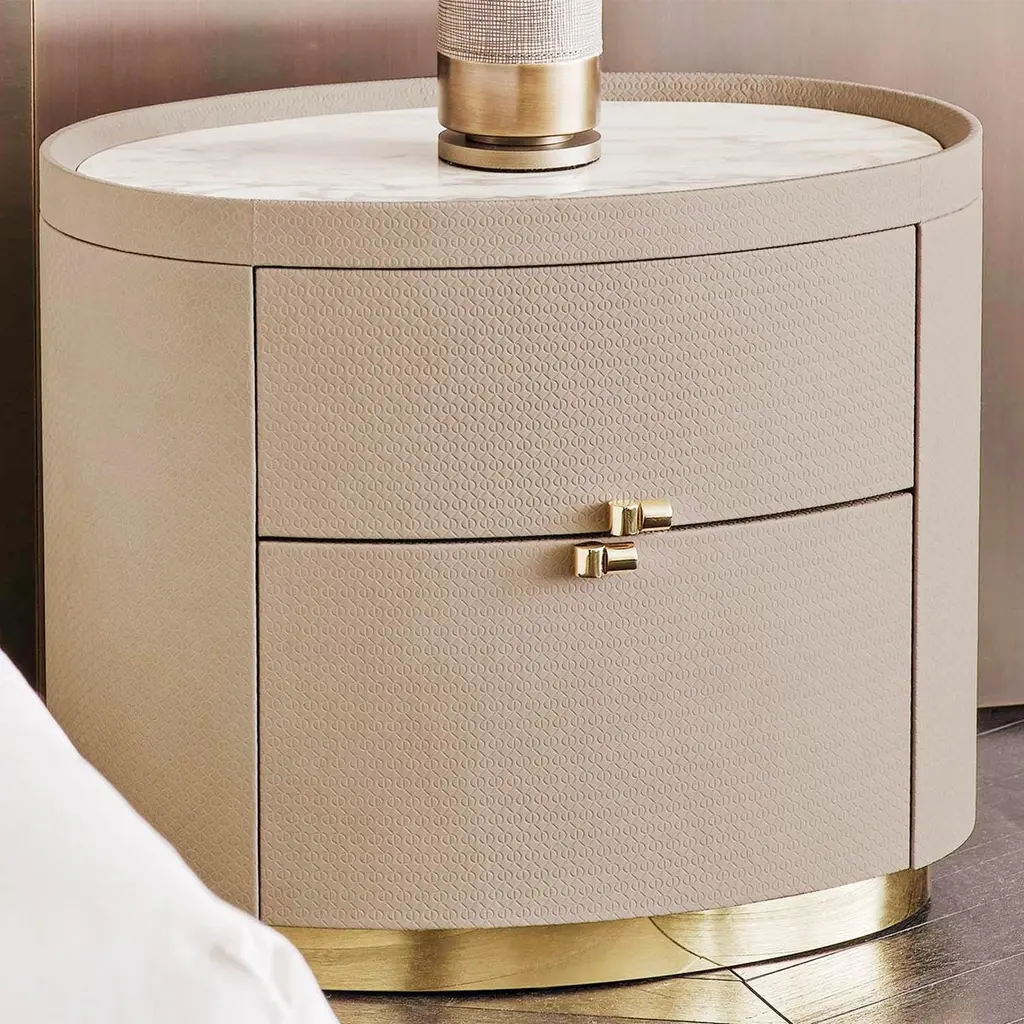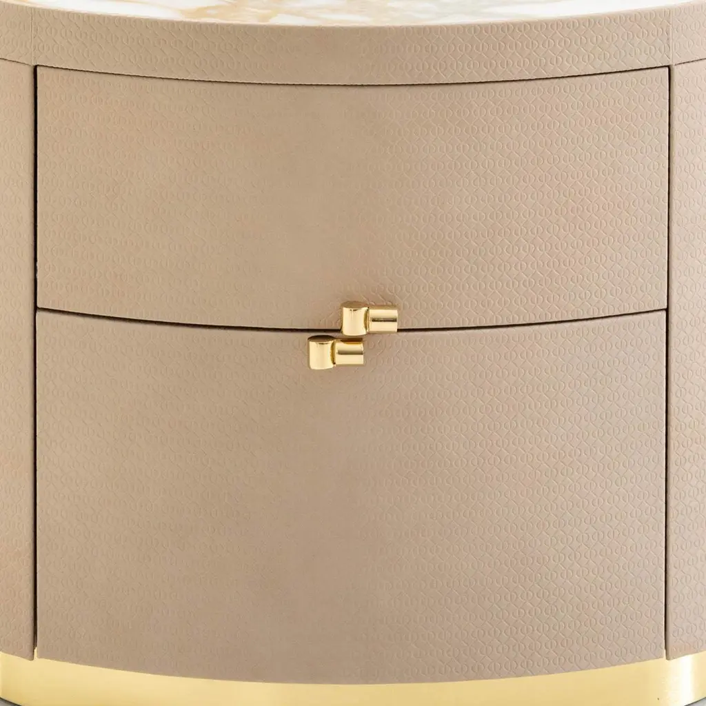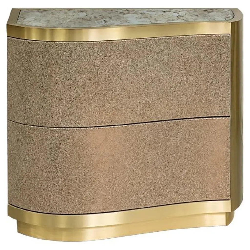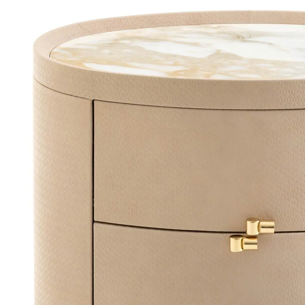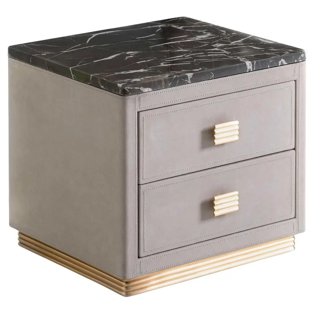 Nightstand chelby with solid wood structureupholstered and covered with genuine Italian leather.With Calcutta oro white marble top and with solid brass base in pollished finish. Chest with 2 drawers with solid brass handles in polished finish.