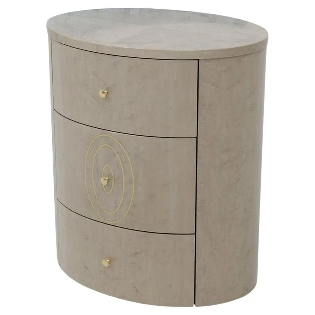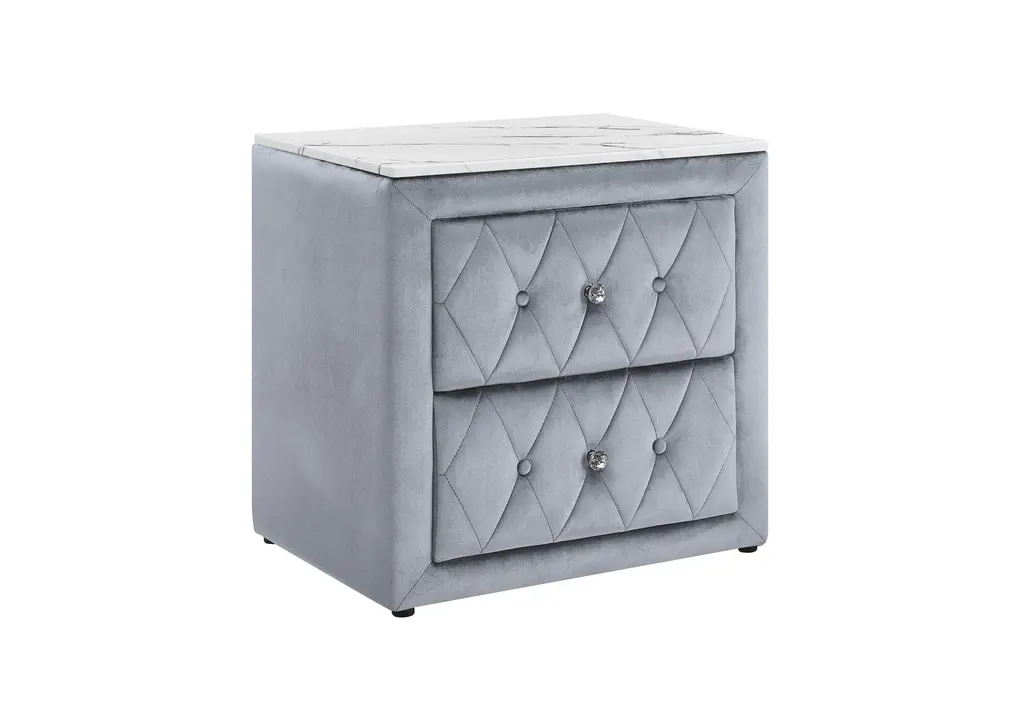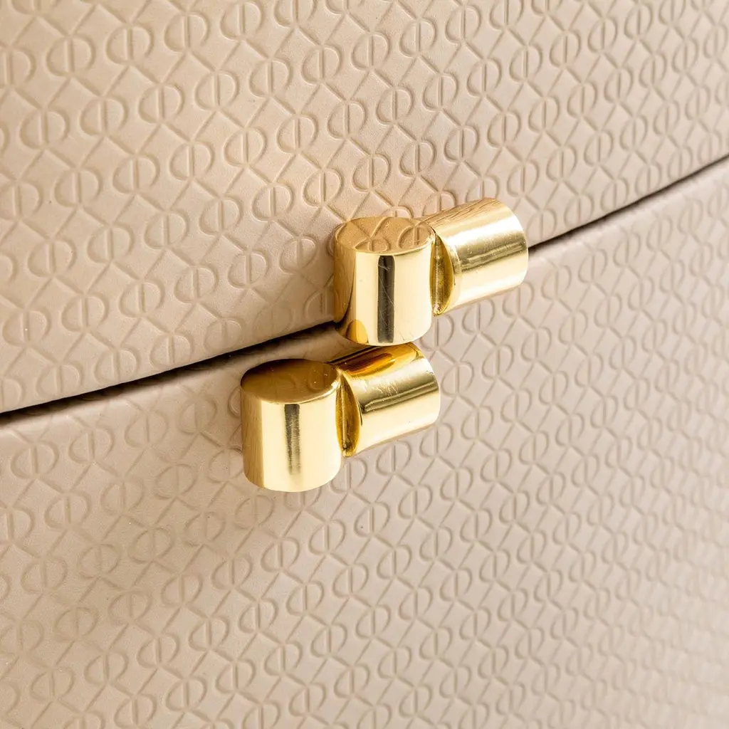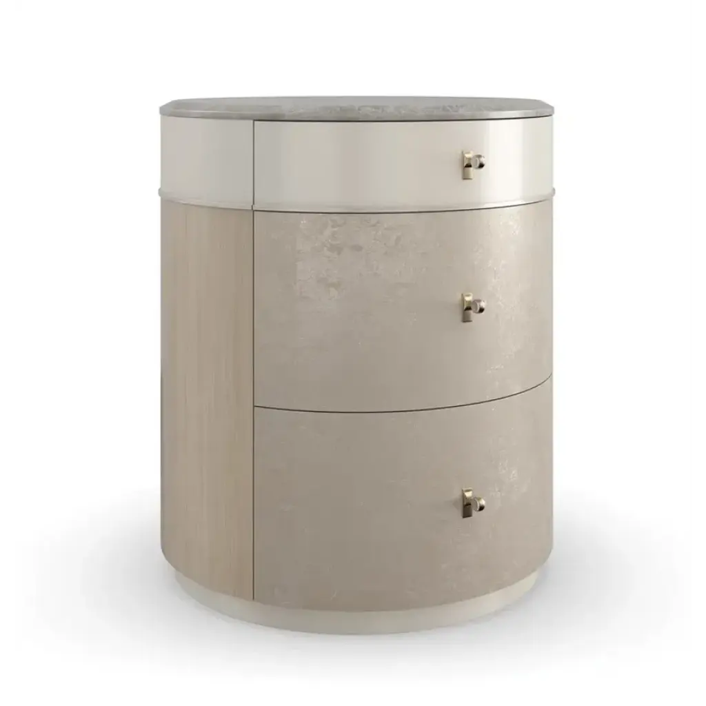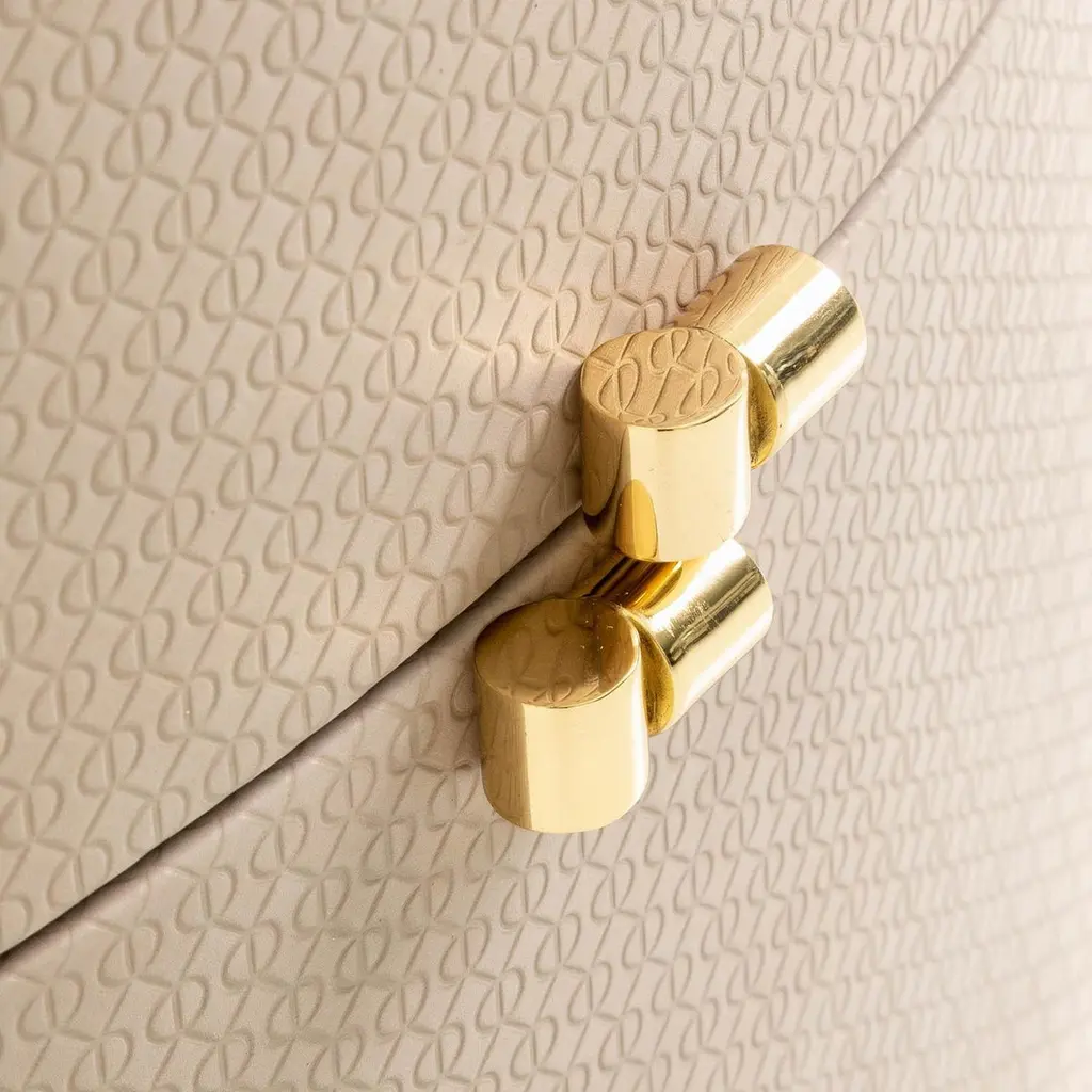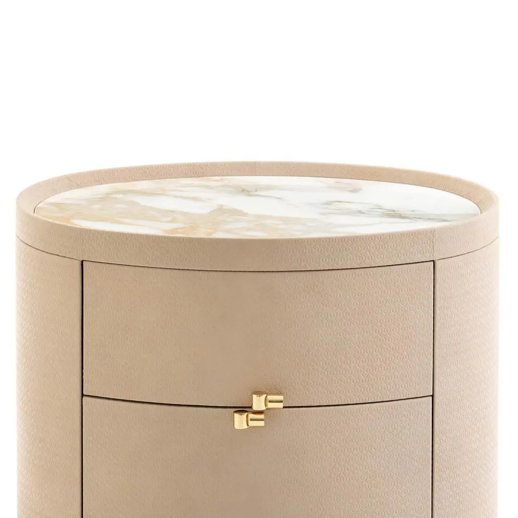 Nightstand chelby with solid wood structureupholstered and covered with genuine Italian leather.With Calcutta oro white marble top and with solid brass base in pollished finish. Chest with 2 drawers with solid brass handles in polished finish.