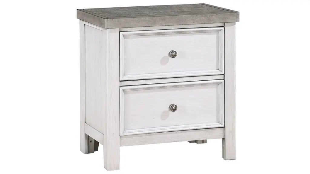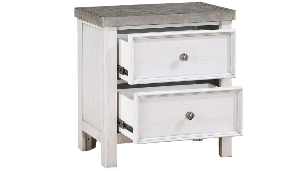 Hints of rustic styling permeate the transitional design of the Chesky Nightstand each subtle accent building to create a classic look for your bedroom. Antique white and gray finishes highlight the acacia veneer, their hues providing perfect complement to each other. The knob hardware that fronts each drawer of the nightstand is finished in antique pewter.