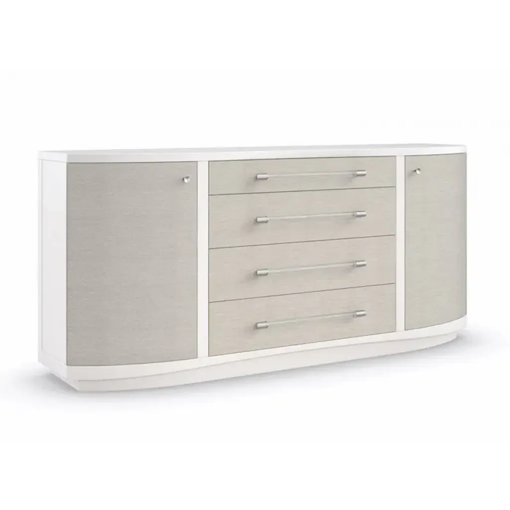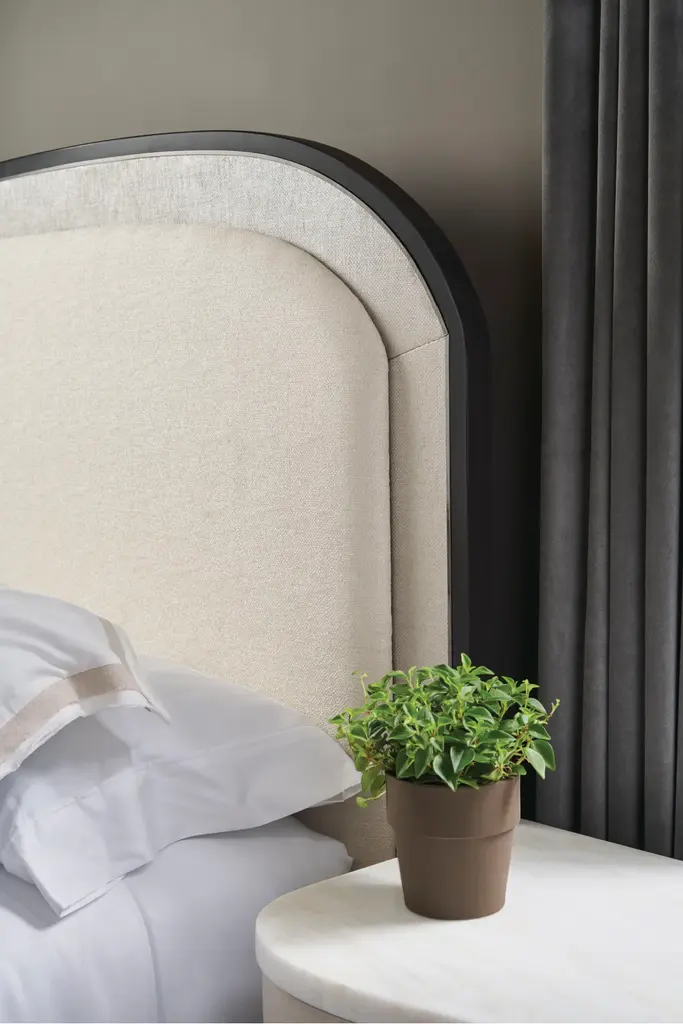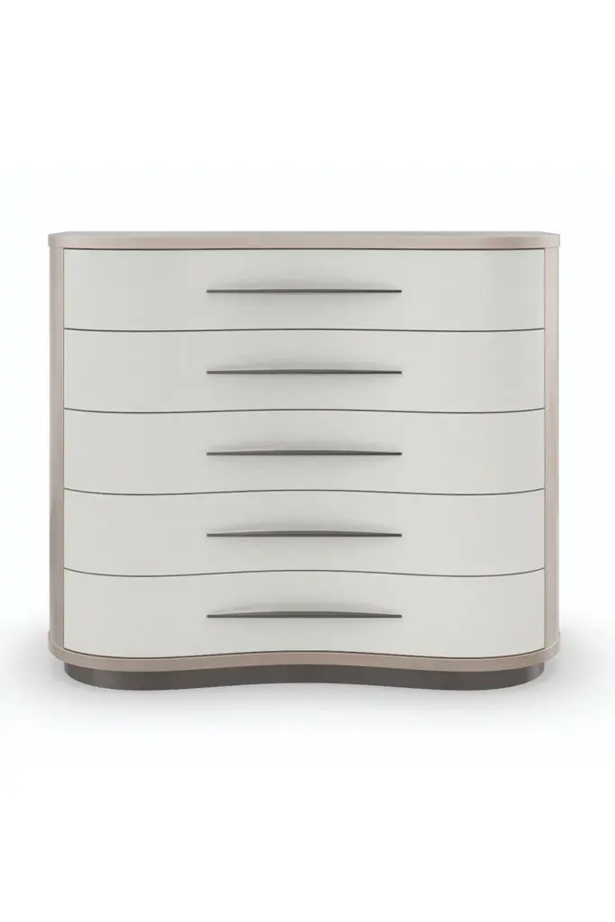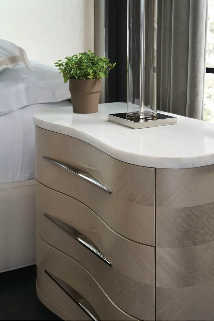 Balanced on a clean plinth base, this large-scale nightstand introduces a sleek and sinuous form with organic simplicity. Chevron-patterned Koto veneers in a Moonstone finish highlight its fluidity, defined by three gently curving, soft-close drawers with horizontal hardware in Deep Bronze or Whisper of Gold. A Gray or White Rhino marble top adds a touch of luxe and a durable top surface for nighttime reads and bedside essentials.