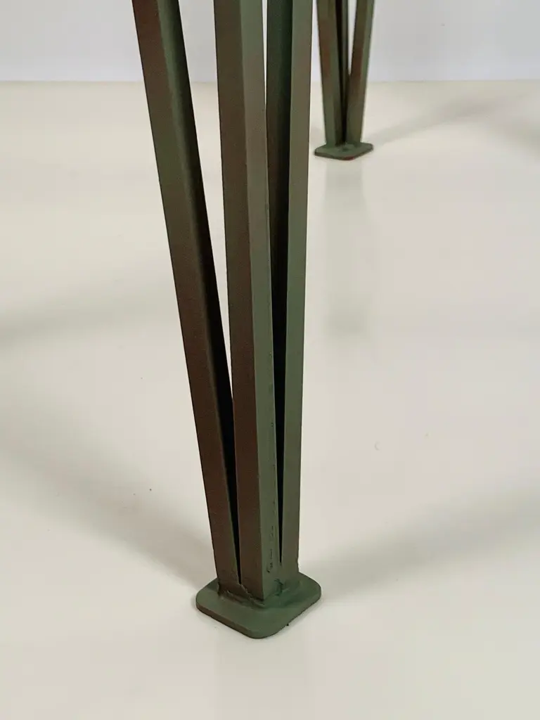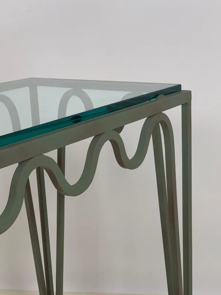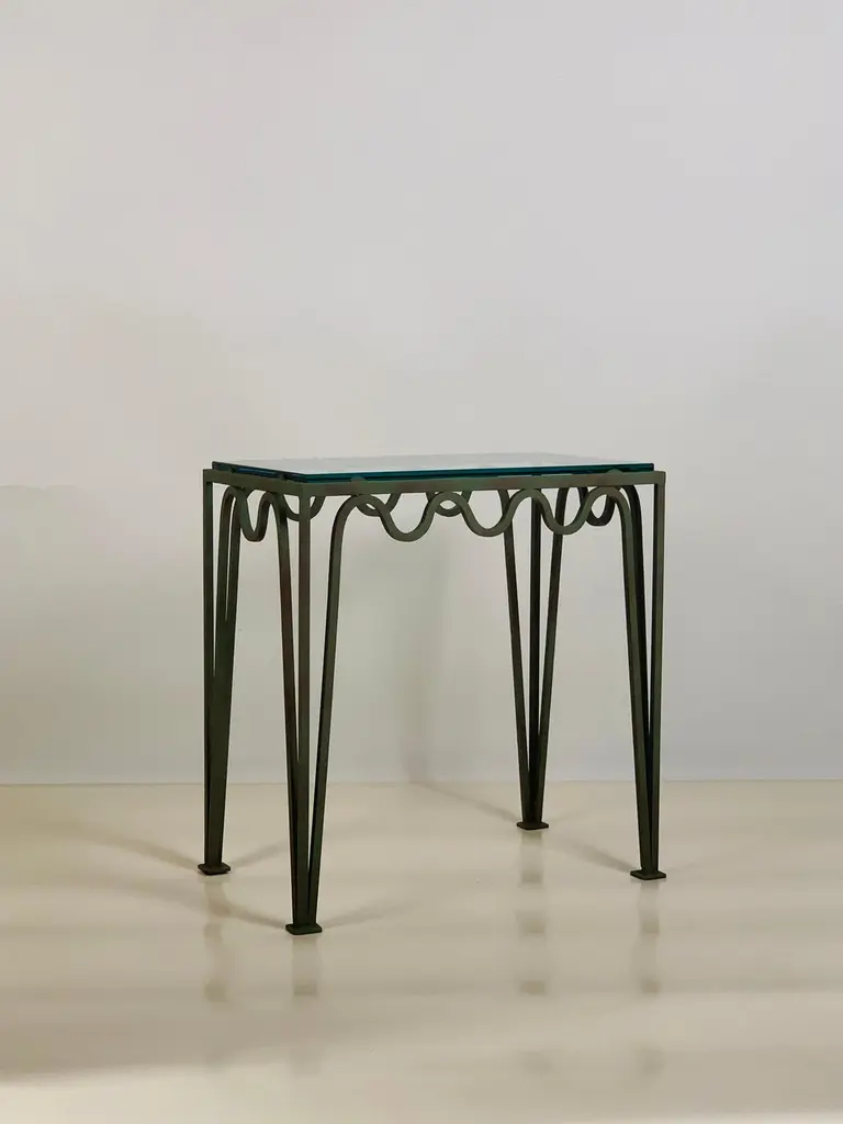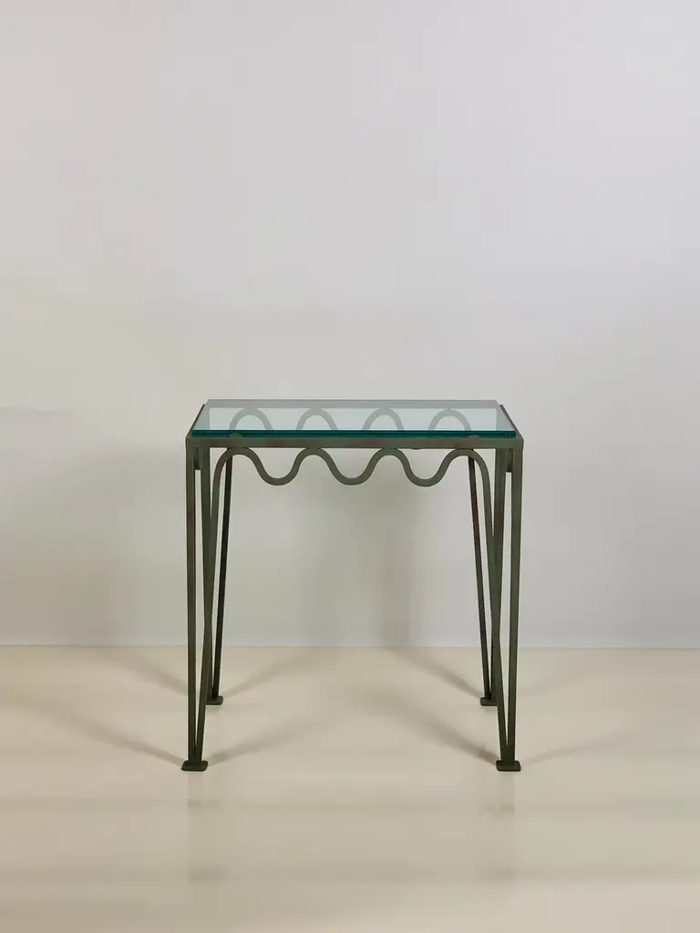 Chic 'Méandre' verdigris and glass nightstand by Design Frères.Sturdy verdigris patinated steel base fitted with a thick, easy to clean, glass top. Inspired by the timeless aesthetic of French modern design, this nightstand from our Exclusive Design Frères line is handmade in our Los Angeles atelier by our skilled artisans. Thi Classic pieces will blend in, structure and enhance any bedroom.Also great as large side table.