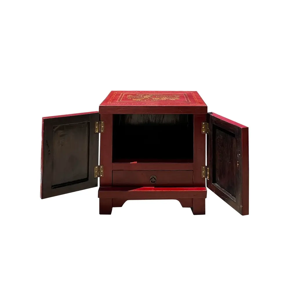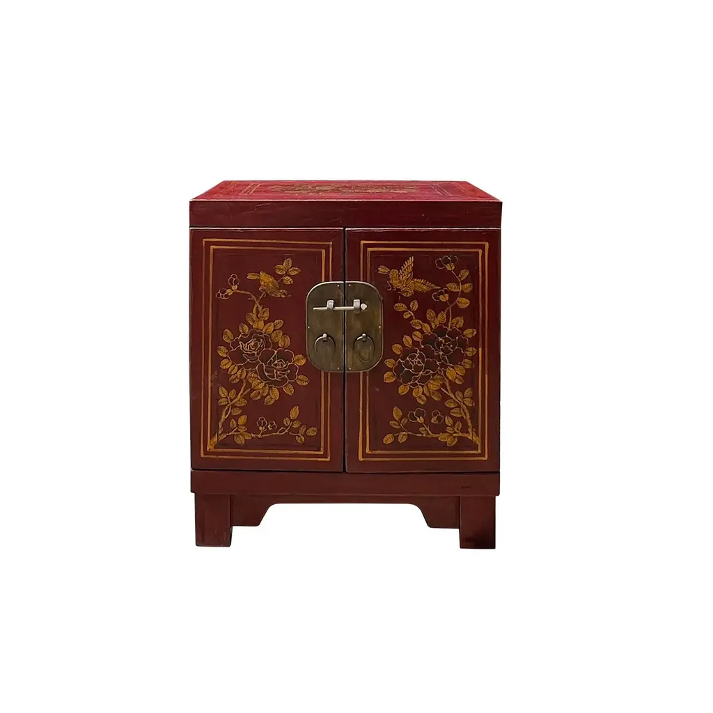 This is an oriental-style end table nightstand painted with a distressed brick red surface. A simple metal door lock hardware is used as an accent. Copper color Ancient Chinese scenery flower birds graphic is painted on the doors. Dimensions: w19.75"x d13.75"x h24" Origin: China Material: Wood Condition: Vintage finish, Hand made, variation in the distressed marks, wood gap marks Work : ship in one piece. USA domestic continental buyers of 48 states pay $180 shipping (buyers of Hawaii, Alaska, US Islands, Florida Keywest, and Canada pays the extra shipping cost). Insurance and handling charges are already included in the shipping cost. In store pick up is highly welcomed if you are in San Francisco Bay Area. (No charge)