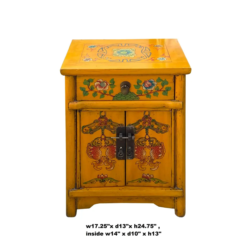 Chinese Distressed Mango Yellow Fishes Graphic End Table Nightstand