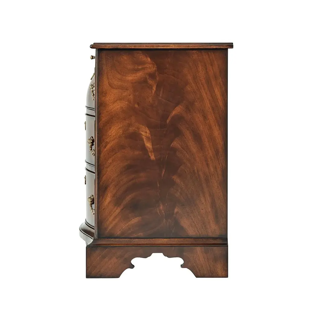 A mahogany bombay bedside chest of drawers, the rectangular moulded edge top above a brushing slide with three shaped serpentine and graduated drawers below, applied with finely cast brass escutcheons and drop handles, on a plinth base with ogee bracket feet. The original George III, circa 1770, in the manner of Thomas Chippendale. Dimensions: 28" W x 19.75" D x 30" H
