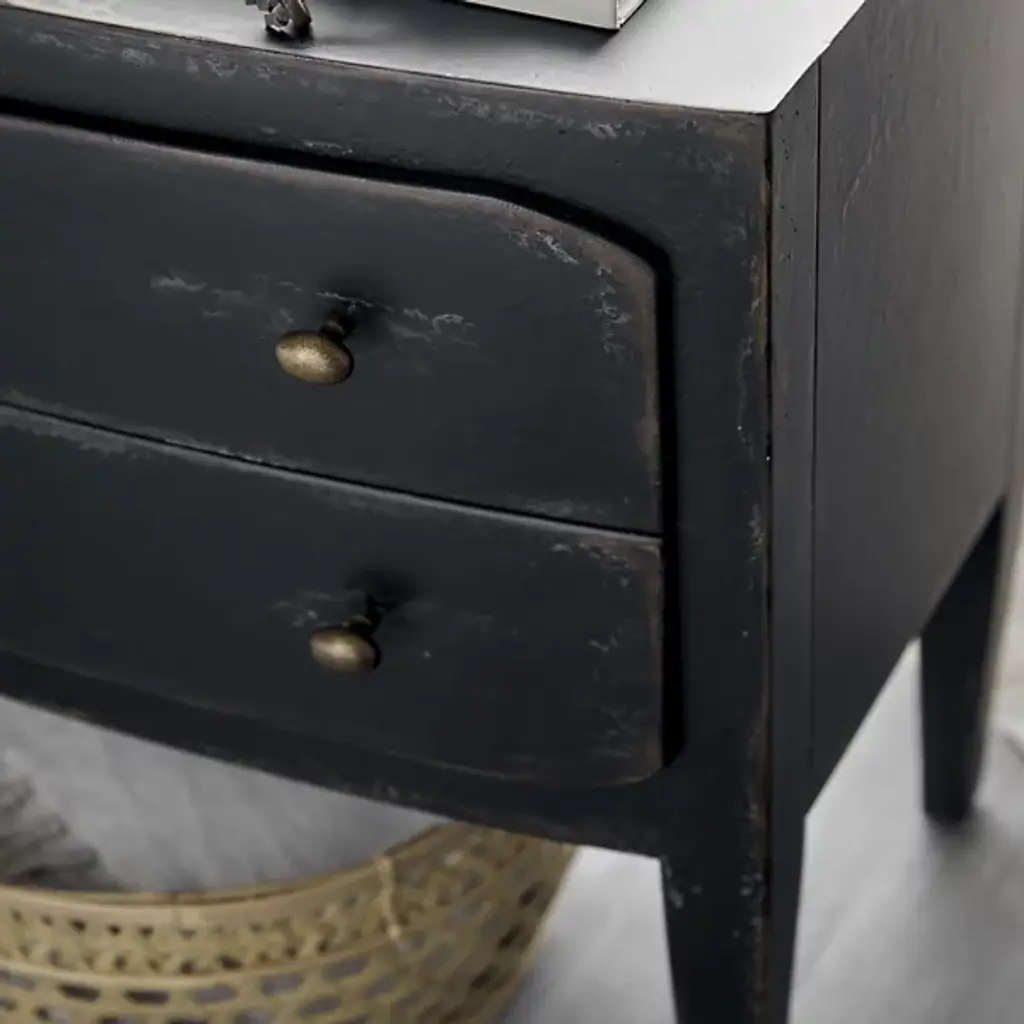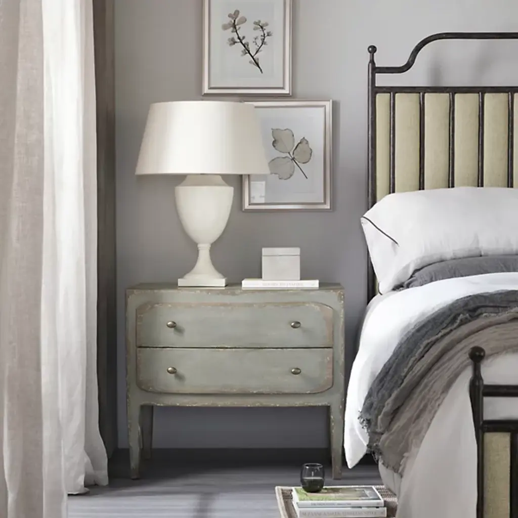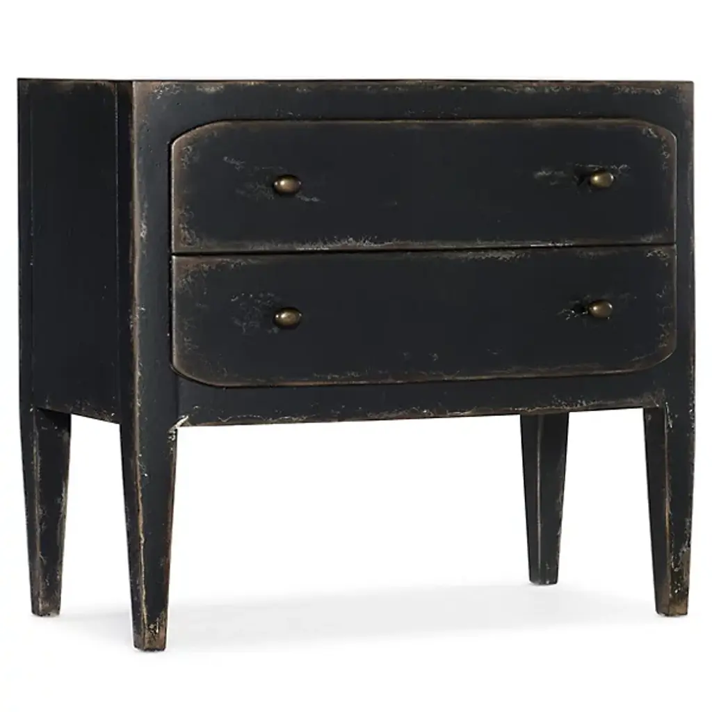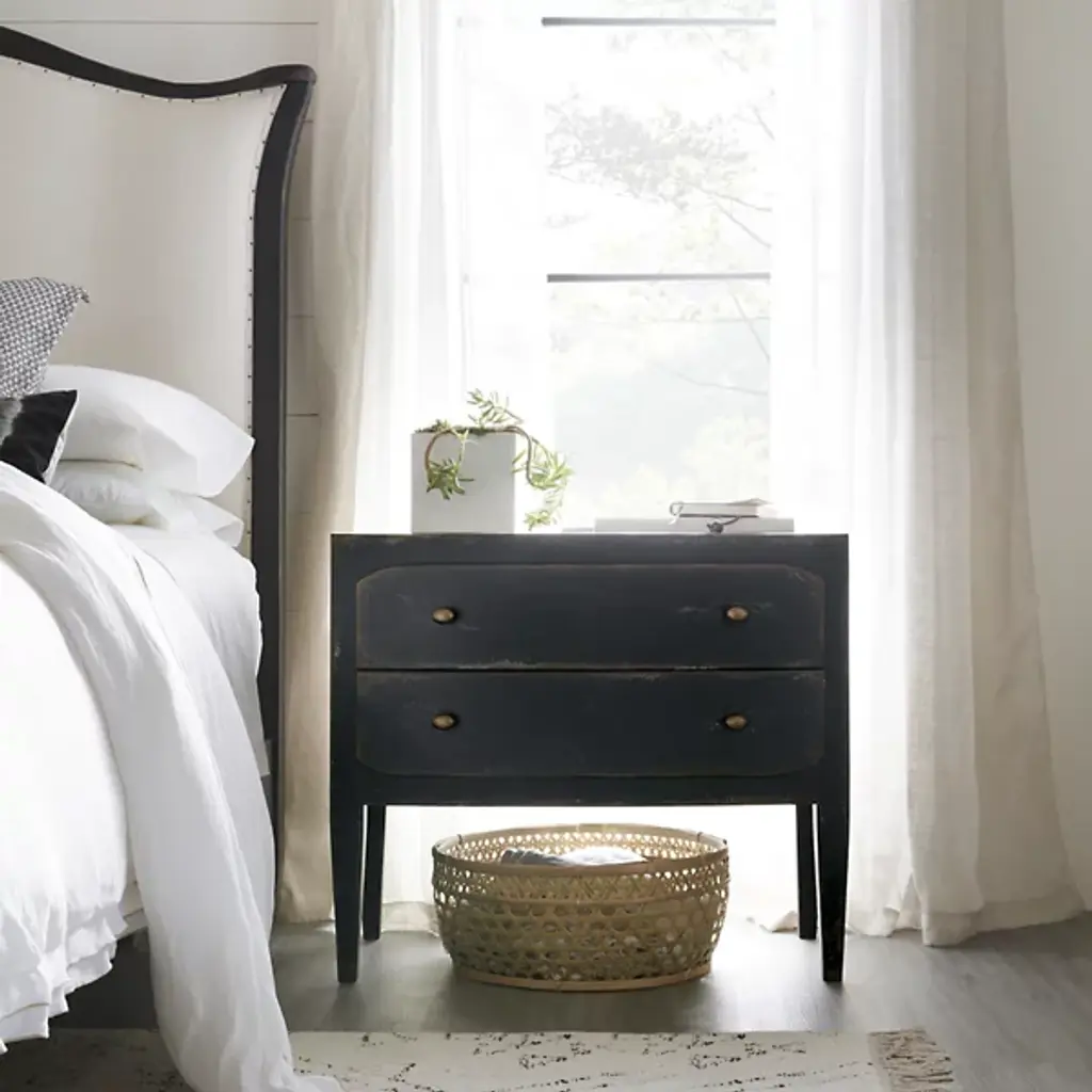 The Ciao Bella 2 Drawer Nightstand from Hooker Furniture features an heirloom quality with a beautiful, time-worn appearance. It was inspired by European farmhouses that have been passed down for generations, with an aged look achieved through a multi-layered rub. Burnished brass hardware complements the handed-down aesthetic, making this product one that anyone would be proud to hand down to their children. To suit modern needs, it comes equipped with a cord clip on the back and a three-plug outlet with a USB port for charging electronics.