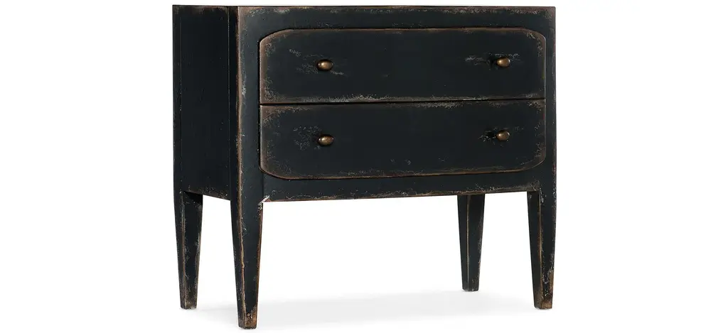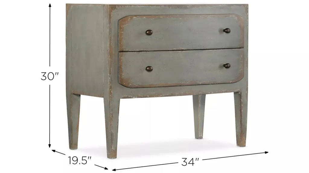 Rustic and romantic, the two-drawer Ciao Bella Nightstand will bring a European farmhouse ambience to your bedroom retreat. Crafted of Poplar and Hardwood Solids with Maple Veneer, the nightstand is finished in Time Worn Gray, a layered and distressed finish that looks like it is aged gracefully through the decades. Features include a drop-in felt liner in the top drawer, cedar-lined bottom drawer, a cord clip on the back and a 3-plug outlet with USB port for charging electronics.