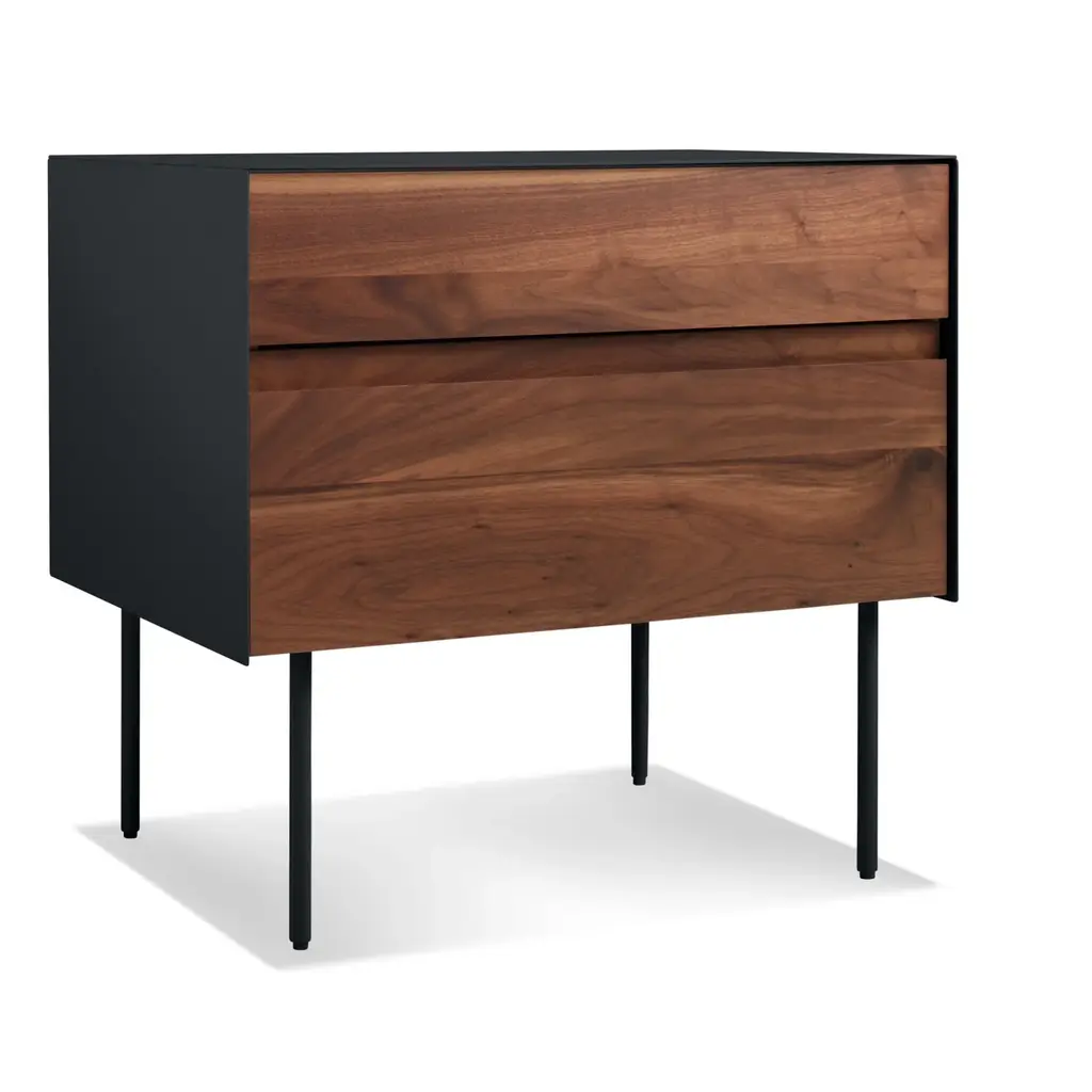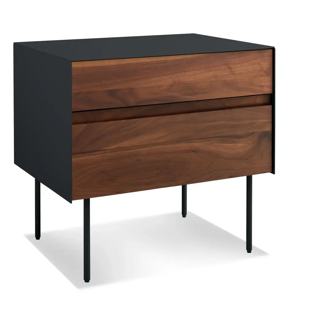 Sometimes we fall hard for a good mix of materials. Like beautiful, warm wood meeting the cool, smooth toughness of steel. This design marries wood drawers with a powder-coated steel side, top and legs to form an alluring union. Integrated groove pulls and soft closure mechanisms on all drawers.