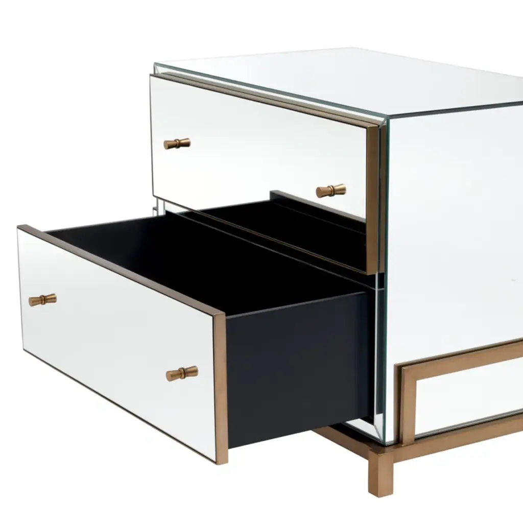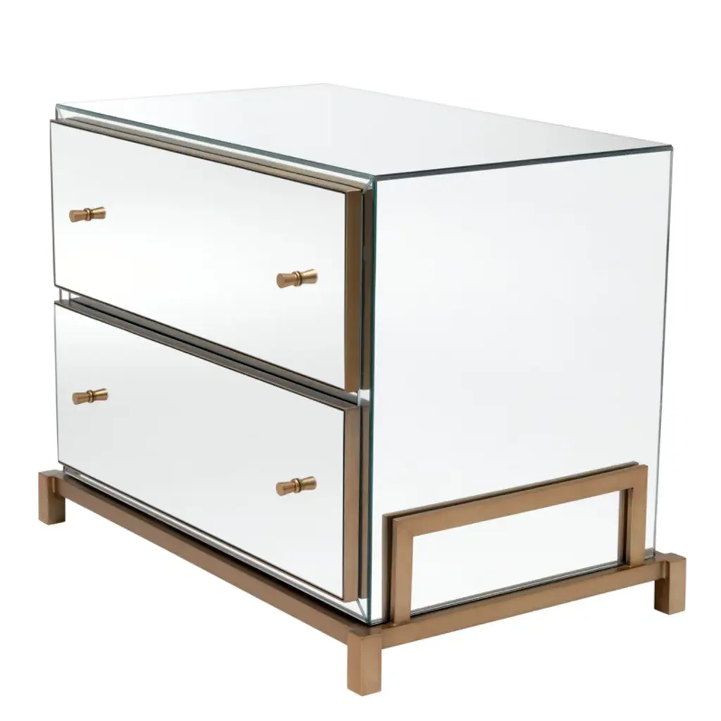 With a rustic elegance reminiscent of rural France, this nightstand features tactile drawer fronts in a Rockport Burnished Adobe finish. Drawing the eye to its architectural design: a striated white onyx marble top, warmly contrasted by end panels in Toasted Sycamore and an Antique Bronze Leaf dentil molding detail along the base. Features creamy Almond Milk-painted drawer interiors and ball hardware in Brushed Gold for an accentuating element that ties it to our Provence bed.