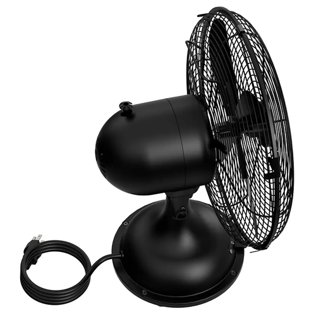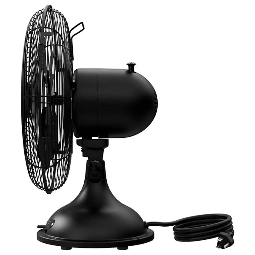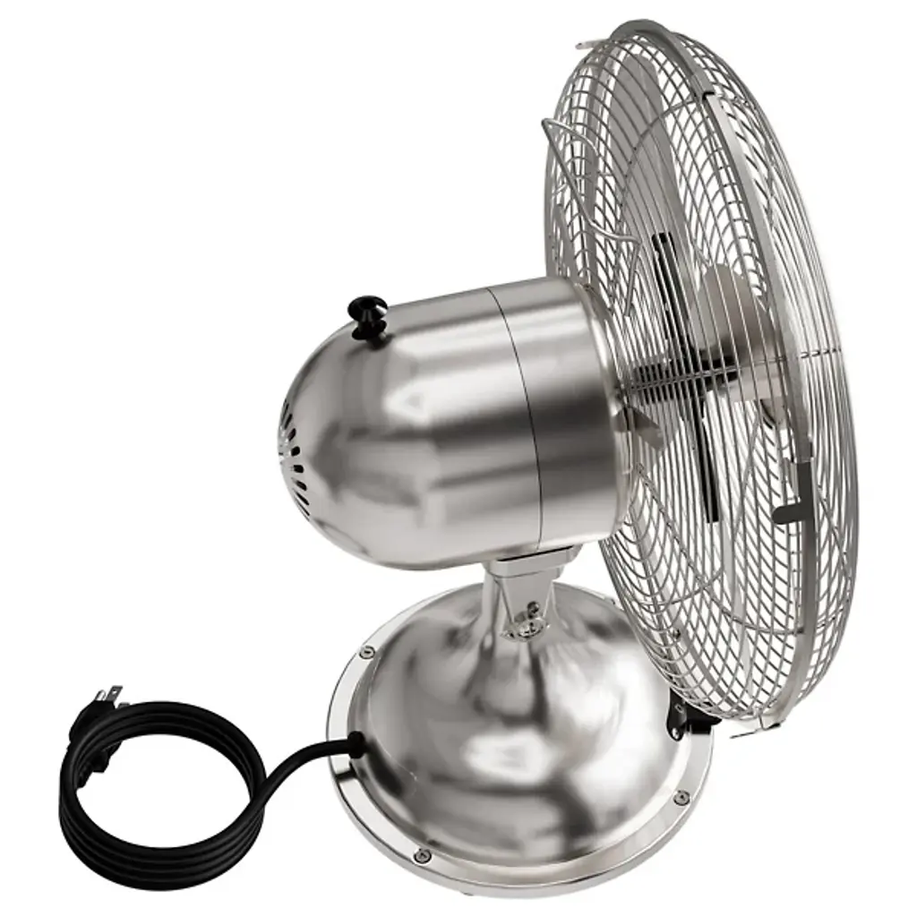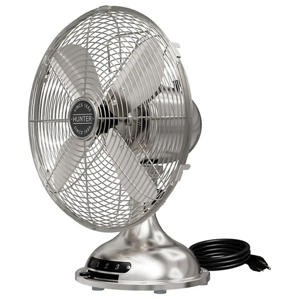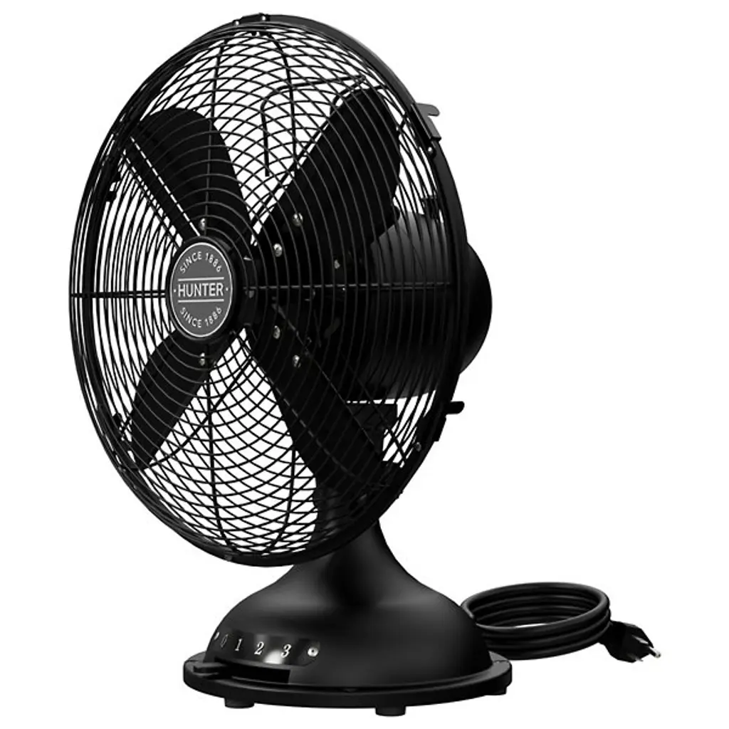 The Classic D12 Portable Desk Fan from Hunter Fans uses an intricate vintage design to deliver a quiet, refreshing breeze. Its oscillating head and three-speed settings let you fine-tune airflow for personalized comfort, while the non-slip dome base keeps it stable on any surface. A removable grille allows easy cleaning, and the four blades ensure consistent cooling without excess noise. The fan features strong steel construction and a compact, retro silhouette, matching performance with transitional style, perfect for cooling desks, nightstands, or even workspaces.