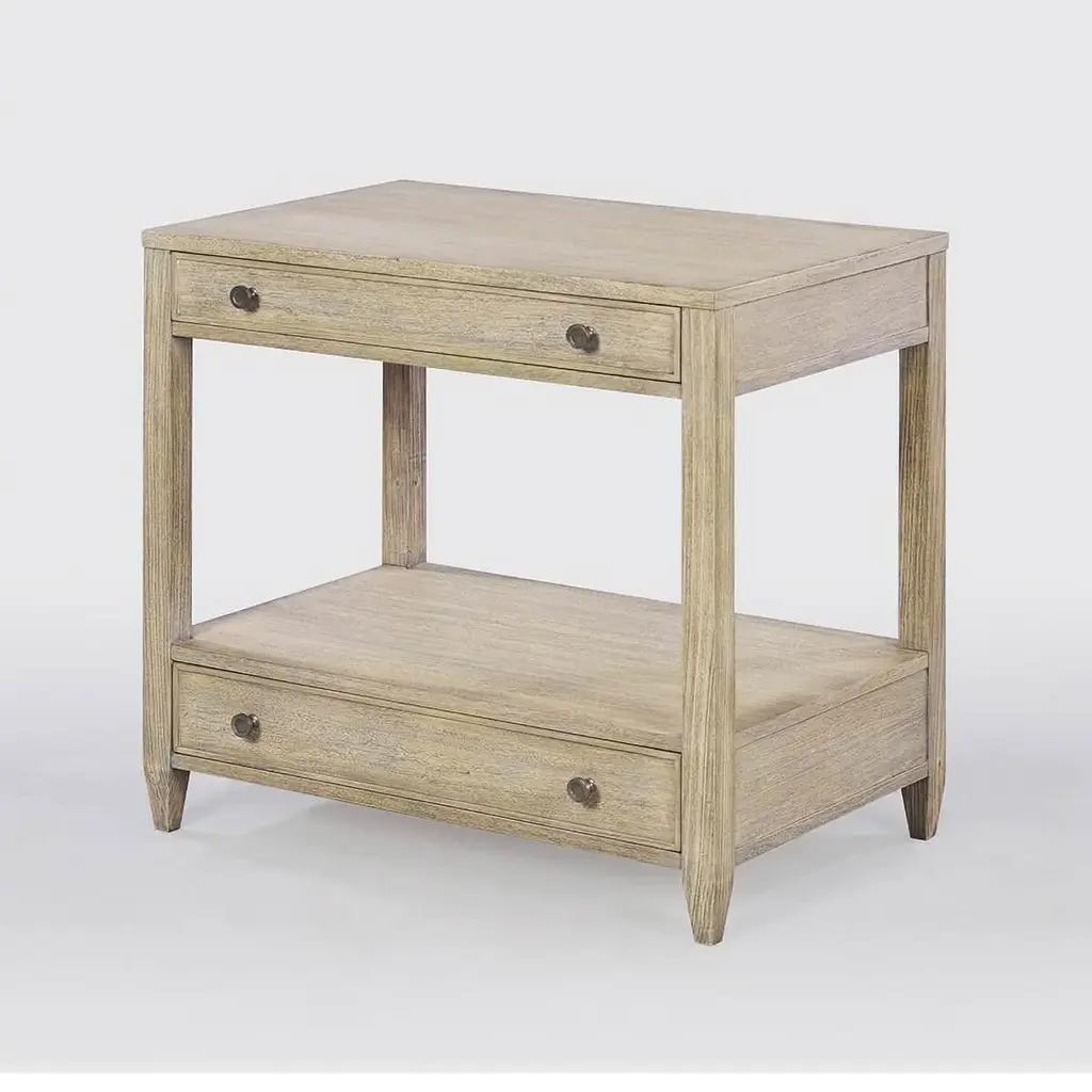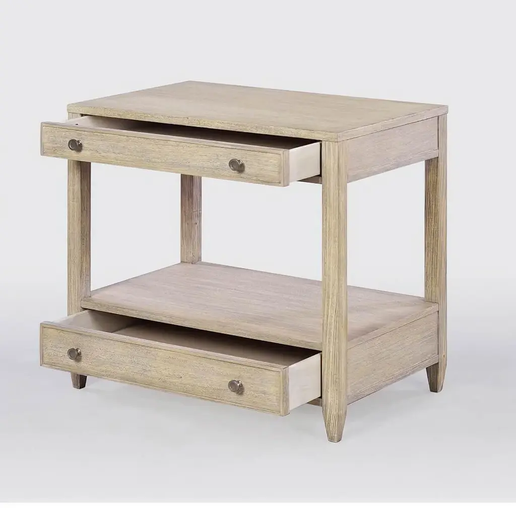 Classic Nightstand - A wide rectangle side table with two drawers, brass hardware, and tapered feet, with a "rabbit" finish showing slight grain accents. Dimensions: 28" W x 18" D x 26" H