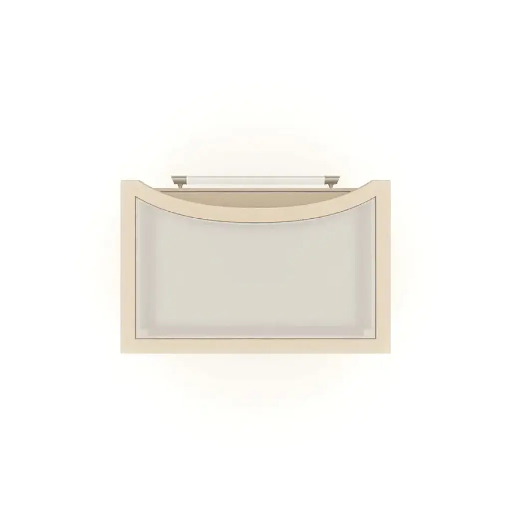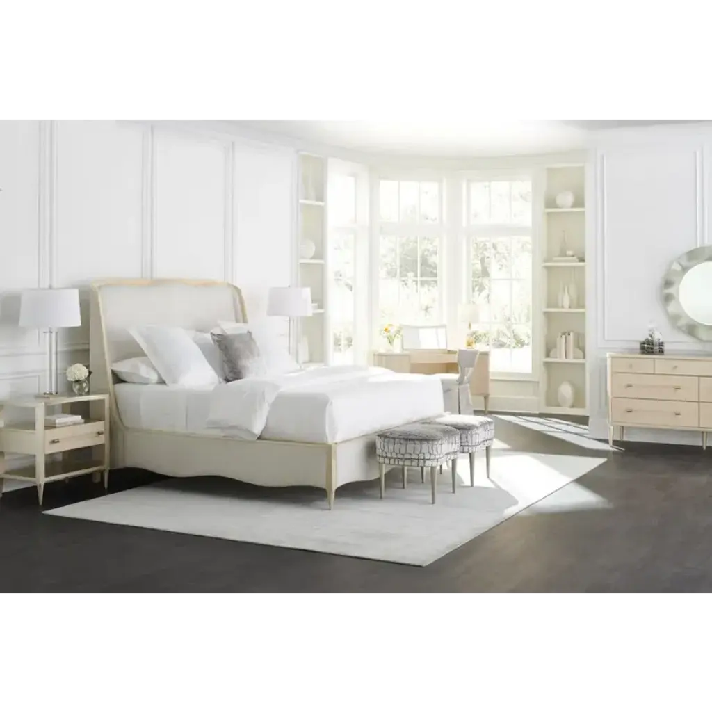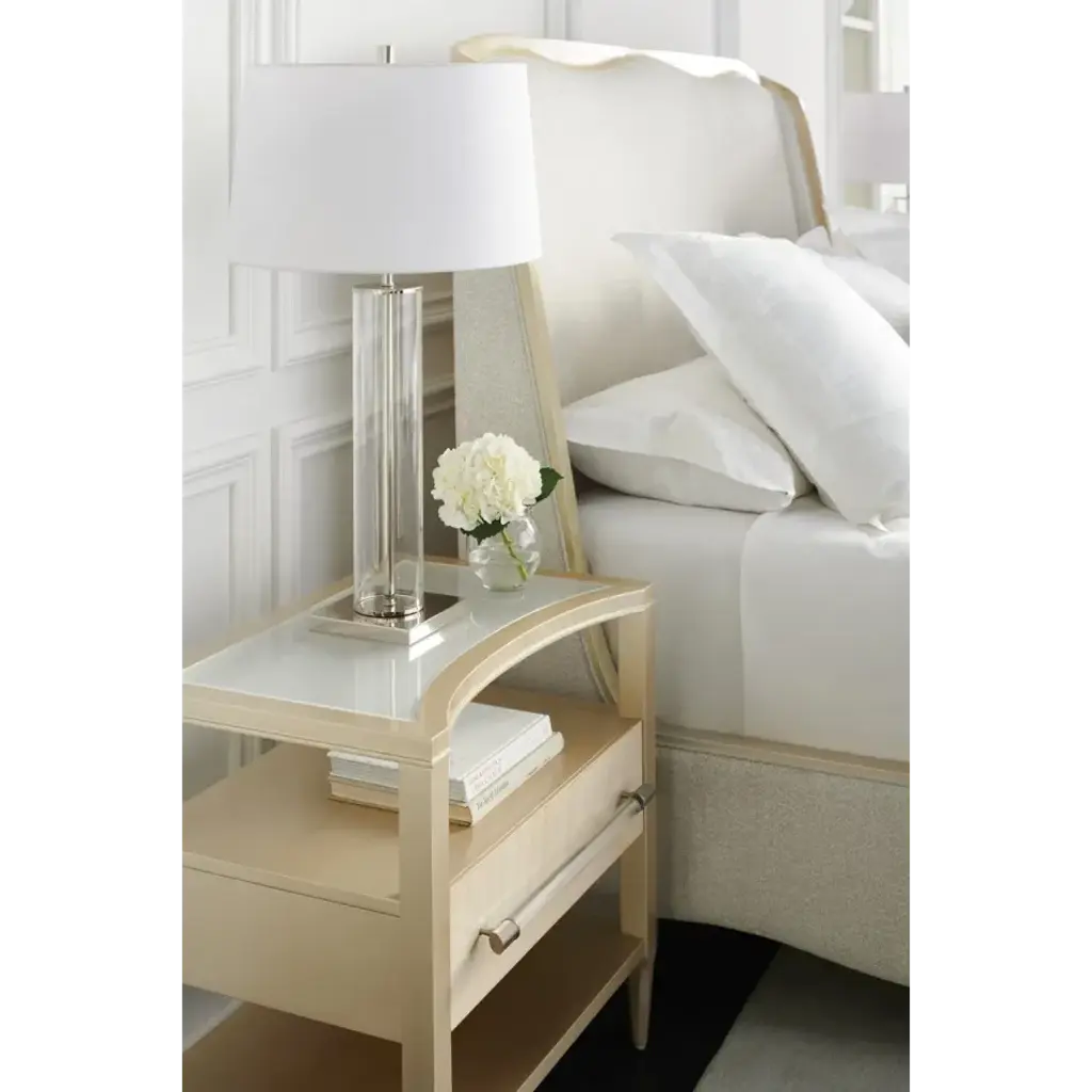Introducing a note of casual glamour, this end table brings uncompromising beauty to bedroom and living room interiors. Graceful curves converge with clean lines for a refined mix of illuminating finishes, organic textures, and materials. A crescent-shaped curve adds interest to its frosted glass top, beautifully balanced on a Champagne Pearl base. Offers open storage above and beneath a single, soft-close drawer, finished in Natural Glow to highlight the exquisite wood grain. A clear acrylic pull rod capped in Satin Nickel finishes the look with an element of distinction.